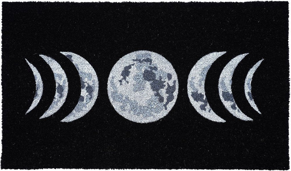 Known for it's extreme durability and ability to withstand heavy foot traffic, this 17-inch x 29-inch black and white phases of the moon outdoor coir door mat is an ideal option for the front door or entrance way of your home or business. Crafted from coconut husks, this mat is not only functional but is an an eco-friendly and visually appealing accessory. The naturally bristled texture of coir is an efficient way to clean dirt and mud from shoes and is easy to clean and maintain. Add this decorative mat to create a practical yet inviting welcome to all who enter. 17.00-inch h x 29.00-inch w x 0.60-inch d.