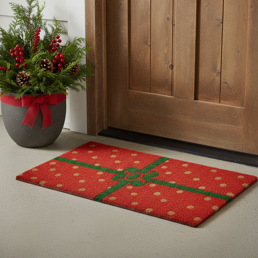 Known for it's extreme durability and ability to withstand heavy foot traffic, this 17-inch x 29-inch brown green and red christmas outdoor coir door mat is an ideal option for the front door or entrance way of your home or business. Crafted from coconut husks, this mat is not only functional but is an an eco-friendly and visually appealing accessory. The naturally bristled texture of coir is an efficient way to clean dirt and mud from shoes and is easy to clean and maintain. Add this festive and decorative christmas mat to create a practical yet inviting welcome to all who enter. 17.00-inch h x 29.00-inch w x 0.60-inch d.