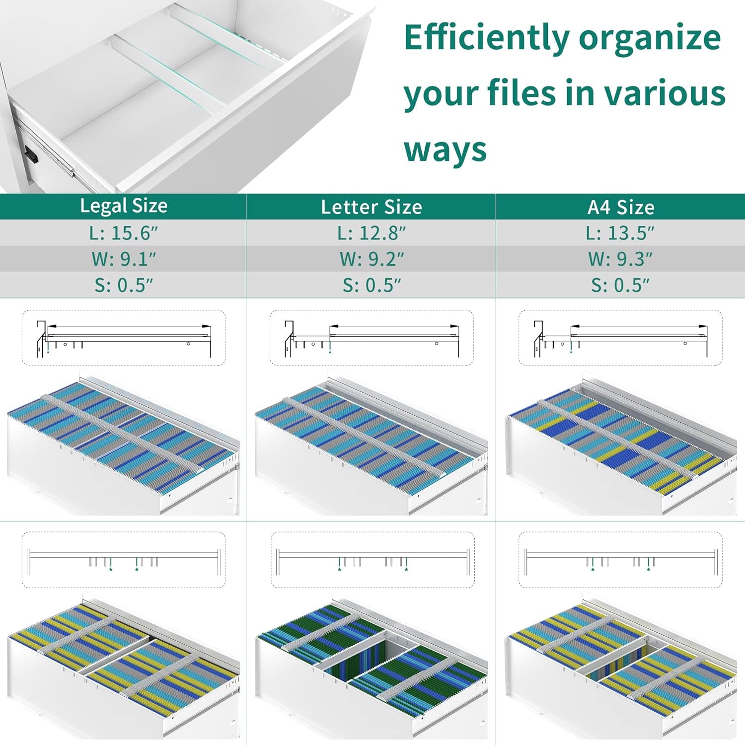 Hanging bars to store different size, such as letter, legal and A4 size hanging file folders.