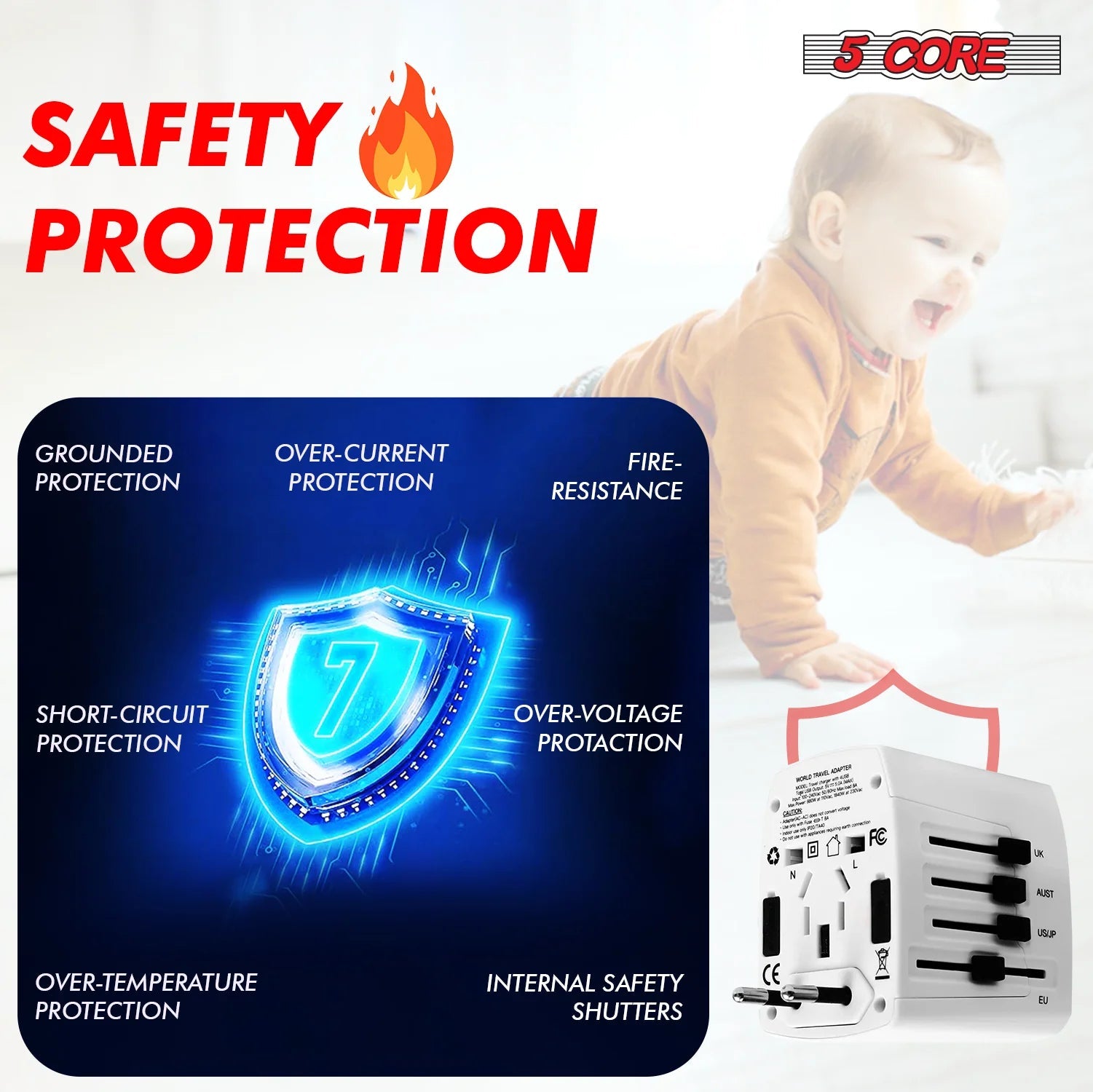 | Constructed with high-quality materials, our European travel plug adapter is built to withstand the rigors of travel and daily use. | The European travel power adapter meets global safety and quality standards, including CE and RoHS certifications, ensuring reliable performance. | Effortlessly switch between plug types using this plug adapter and enjoy a hassle-free experience with our intuitive design. | With a stylish design, 5 Core universal travel adapter is not only functional but also pleasing to the eye and easy to handle. |