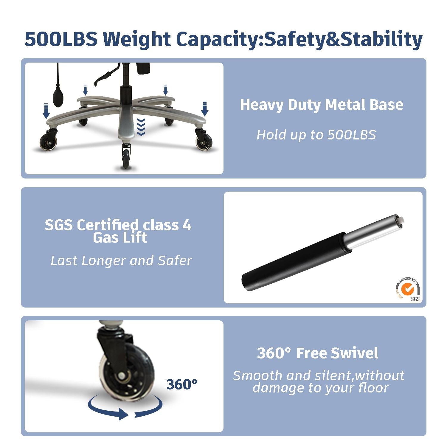 This executive desk chair is designed to accommodate larger and taller people. The heavy-duty office chair features a wider seat, an SGS-certified class 4 gas rod, and a stable metal base. The weight capacity of up to 500lbs.