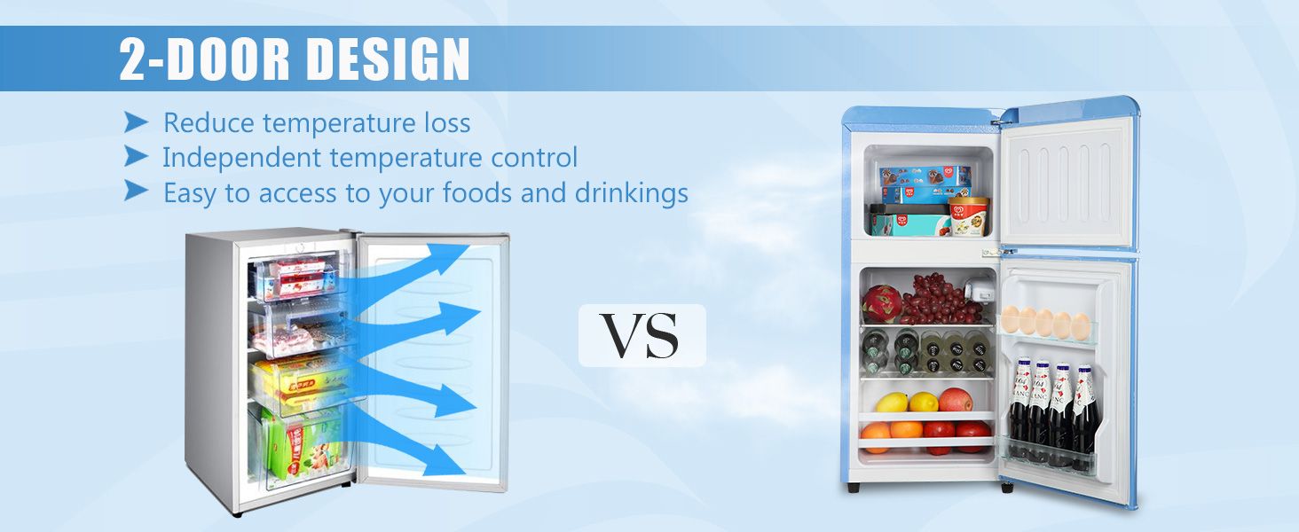 1, Top Freezer Design: The large capacity of 3.5 Cu.Ft is divided into refrigerator and freezer areas, which are more spacious than ordinary mini refrigerators and can keep food fresh or frozen. The stylish two-door design is very suitable for dormitories, offices, bedrooms and apartments.