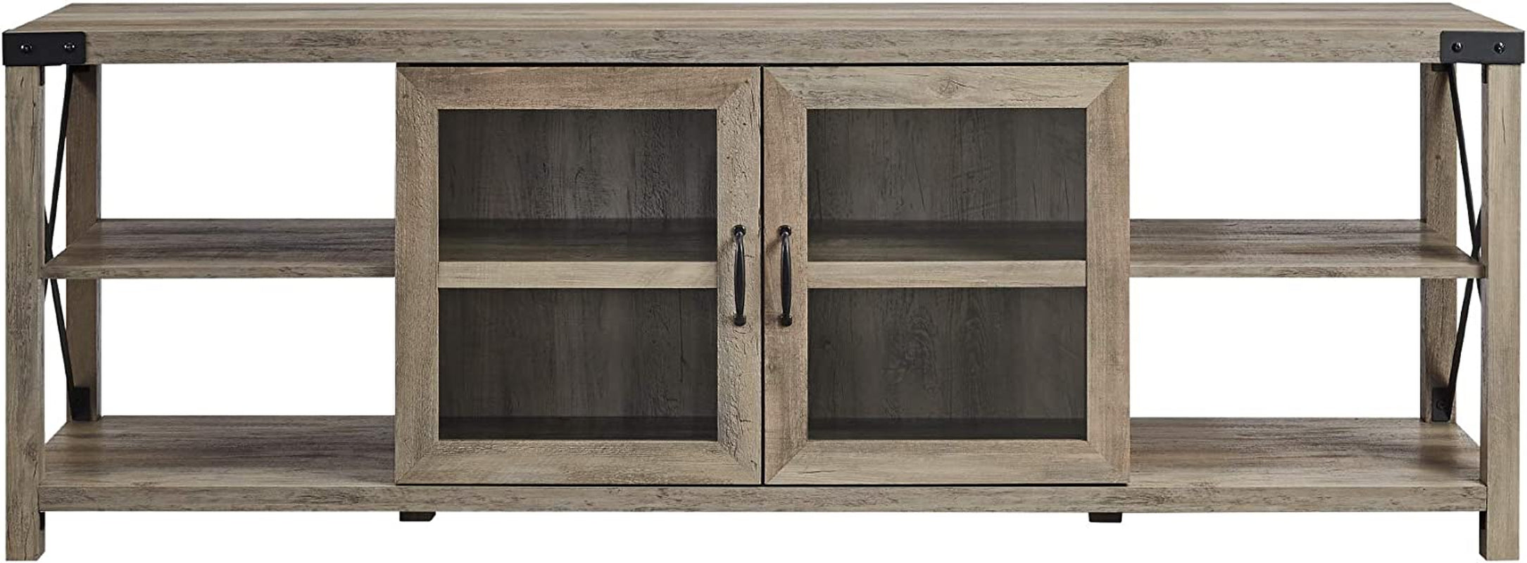 Find the ideal entertainment unit at the intersection between style and functionality with this metal x 70-inch TV console. Putting an industrial spin on the farmhouse design trend this media console features open and closed storage that’s framed with exposed metal accents on the sides and top corners of the piece. Behind the tempered glass front doors with soft close hinges are adjustable shelves. The side shelves are fixed. This media stand features cord management options and can accommodate TVs up to 78-inches.