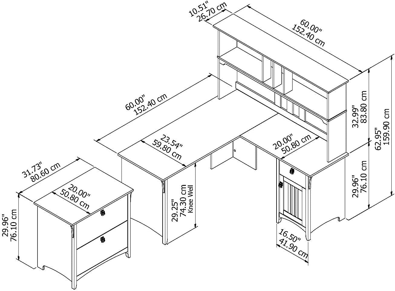Featuring a comfortable design and plenty of storage capacity, the Bush Furniture Salinas 60W L Shaped Desk with Hutch and Lateral File Cabinet offers an ideal home office solution for those who value both style and function. Tapered legs, curved base rails and decorative wood accents inspired by timeless Mission styling create a casual feel in your home. You'll love all the room you have to multitask on the L Shaped surface, designed to save space by fitting into a corner. Have a cup of coffee as you surf the net, pay bills, read a good book or the morning paper, and enjoy all the legroom you need with the open design. Store writing utensils and small office supplies in the convenient box drawer and keep larger items in a storage cabinet with an adjustable shelf. The 60W Hutch attaches to either side of the corner desk to add plenty of storage for books, photos, decorations and more. Two large open cubby areas on either side hold bigger items, and a pair of smaller spaces in the middle are perfect for storing work-in-progress. The 2 drawer filing cabinet opens on smooth full-extension ball bearing slides for an easy reach to legal and letter size documents. Tumbled Pewter drop pull hardware complements your choice of appealing Antique White, Cape Cod Gray and Vintage Black finishes. This modern farmhouse style home office furniture set is tested to meet ANSI/SOHO quality standards for safety and performance and is backed by the Bush Furniture 1 Year Manufacturer's Warranty.
