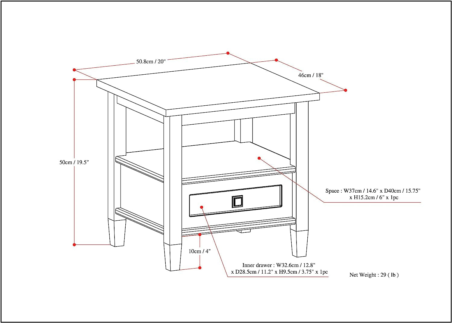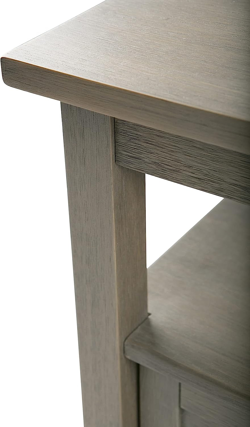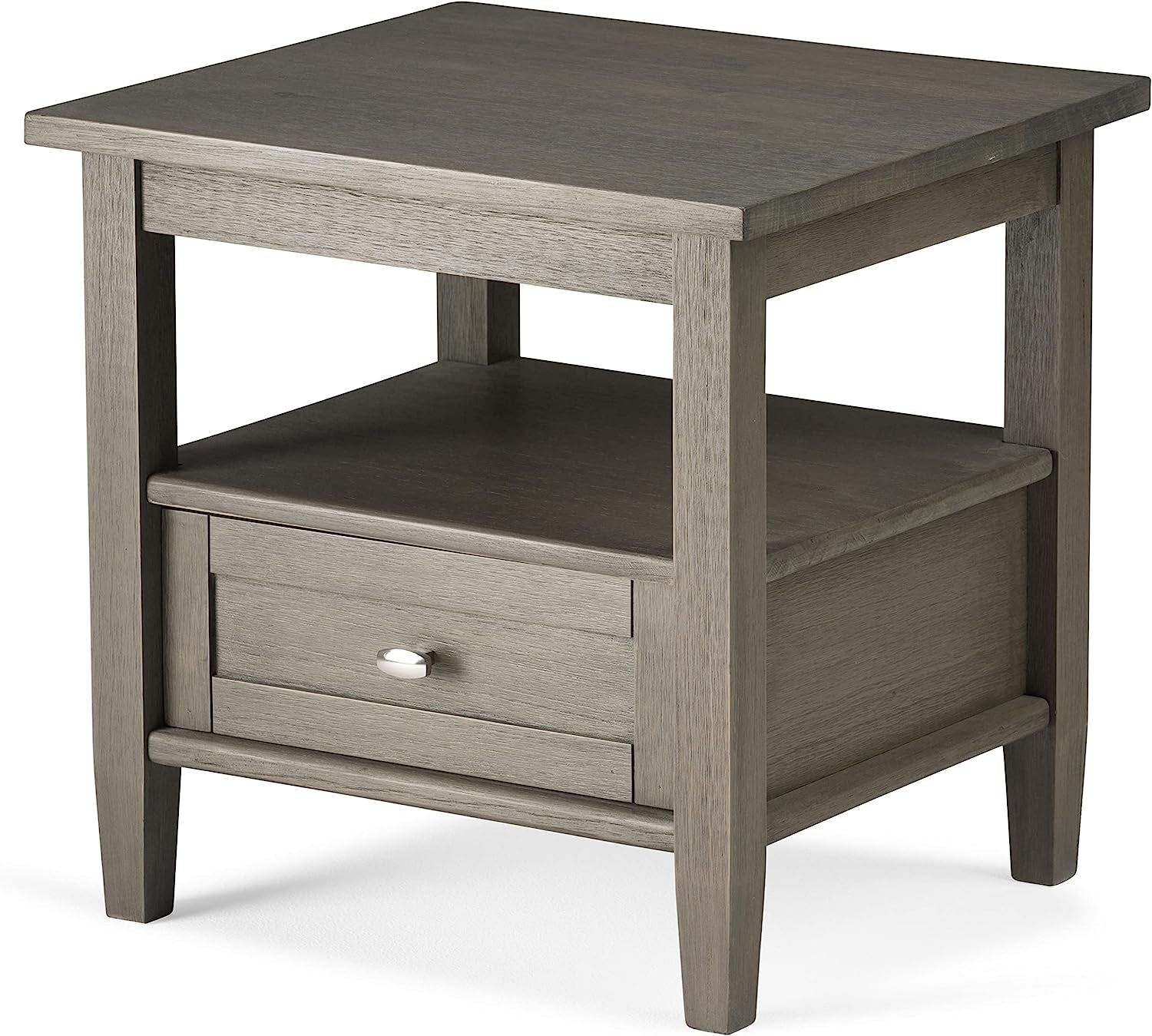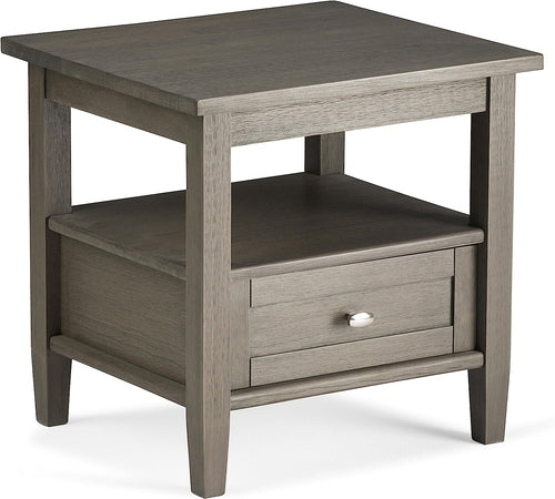 Good things really do come in small packages. Nothing could illustrate this better than the design of our Warm Shaker End Table which features one drawer and one open shelf providing plenty of storage space. The table is sized perfectly to allow room for a table lamp, book and family photos. A perfect companion to any sofa or arm chair. Available in a warm Honey Brown, Black, Farmhouse Grey, rich Tobacco Brown finish, and Distressed Grey finishStyle includes rounded rectangular Brushed Nickel knob, square tapered legs and square edged table top. Assembly required. Efforts are made to reproduce accurate colors, variations in color may occur due to computer monitor and photography. At Simpli Home we believe in creating excellent, high quality products made from the finest materials at an affordable price. Every one of our products come with a 1-year warranty and easy returns if you are not satisfied.