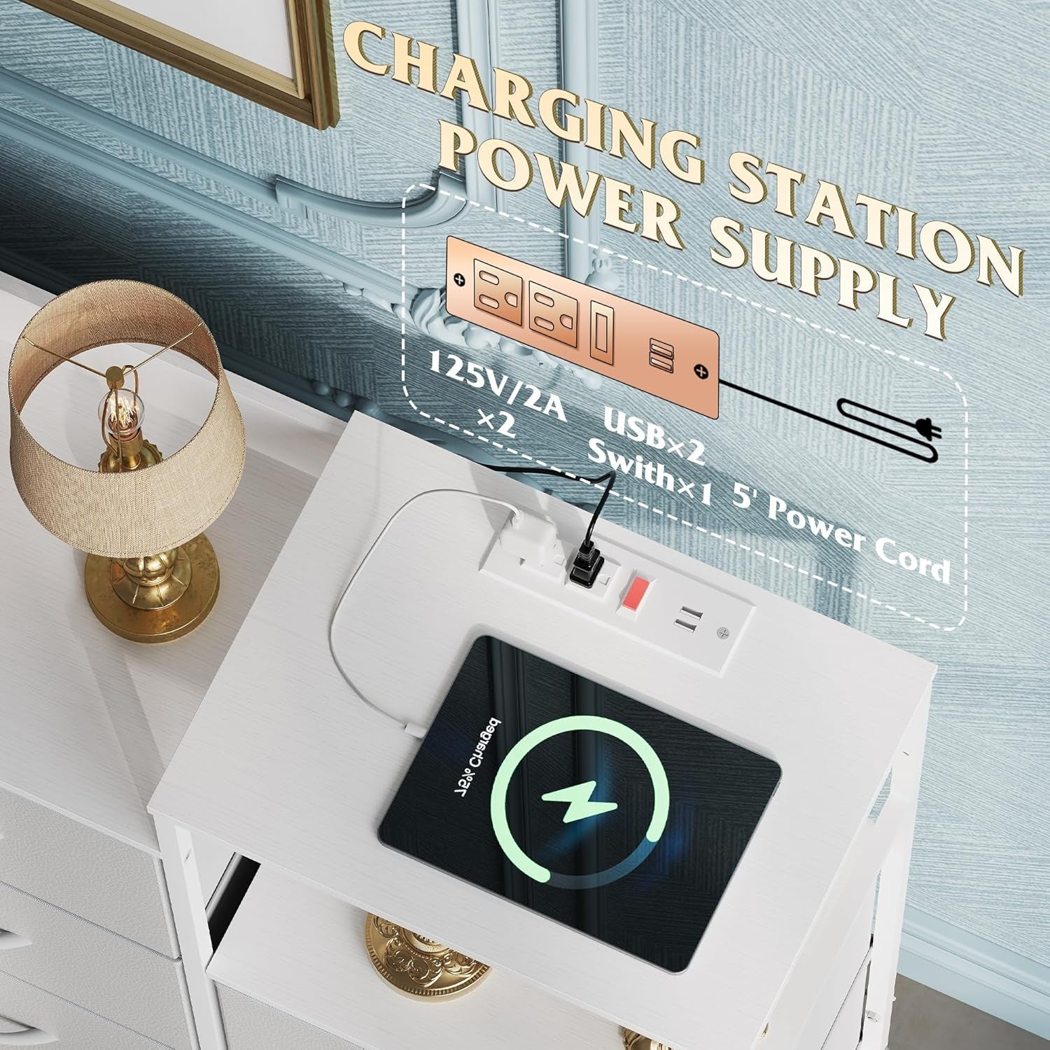This White Dresser TV Stand with Charging Station and Drawers is perfect for any room, including the living room, bedroom, or hallway. Its sturdy steel frame and adjustable feet ensure stability on various surfaces, while its modern design complements any decor. Upgrade your home with this stylish and multifunctional piece today!