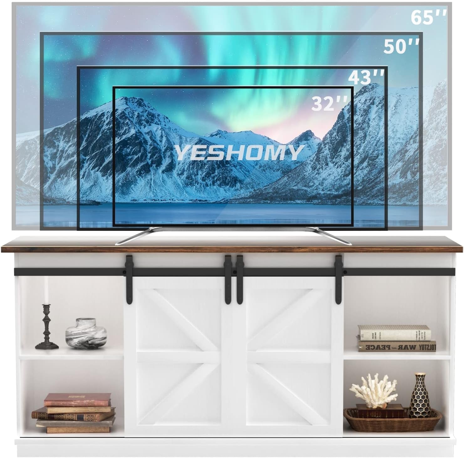 • TV Stand Size: The size of this TV stand is 27.6” H x 15.5” D x 58” L, and can hold up to 65 inches of TV sets.