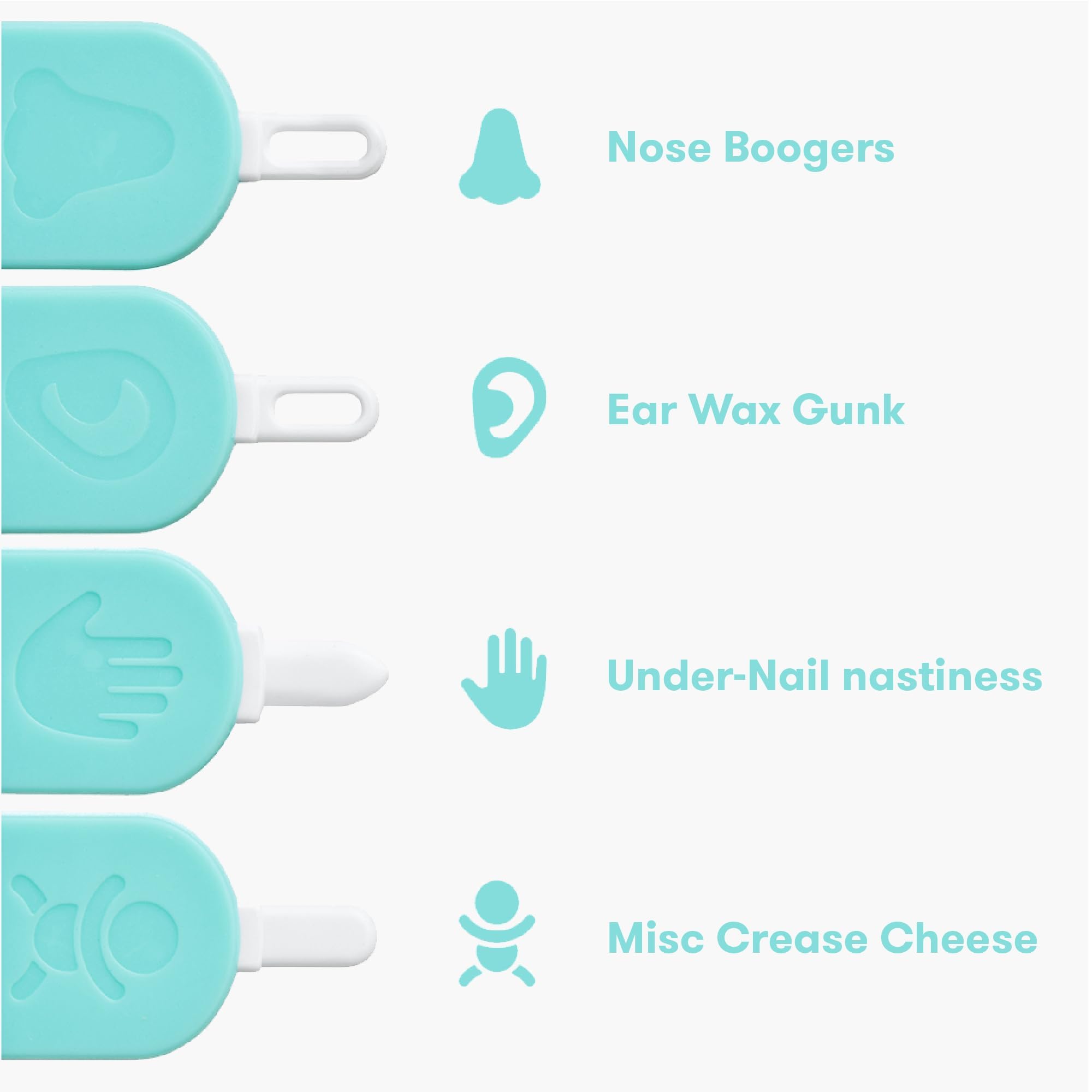 • FOUR FLEXIBLE TIPS: Four specialized silicone-tipped tools include a curved nose picker for stubborn boogers, precision ear scoop for gentle wax removal and nail cleaner for under-nail debris. A multipurpose tip for other tricky spots, all designed with flexible yet durable materials that safely navigate delicate areas without scratching or irritating baby's sensitive skin