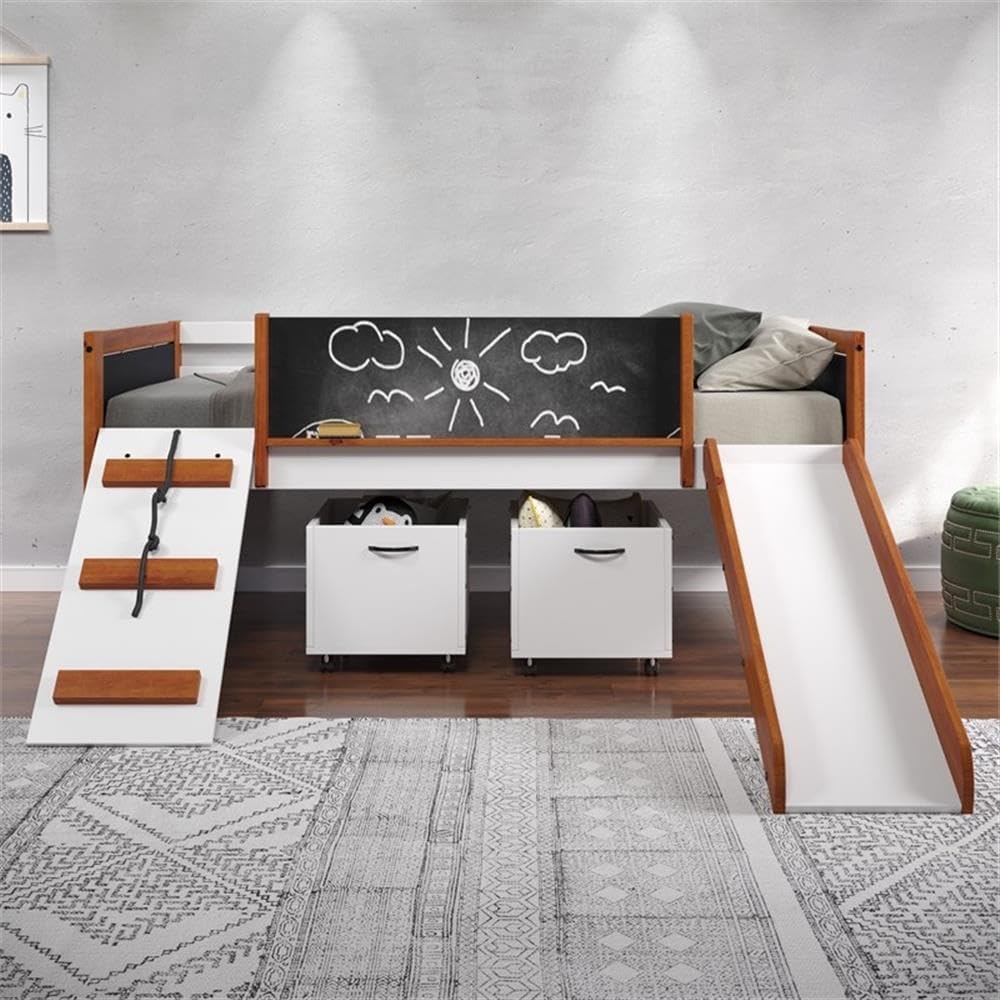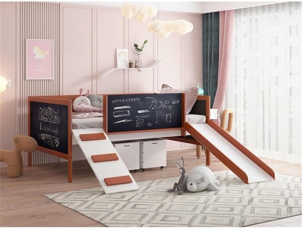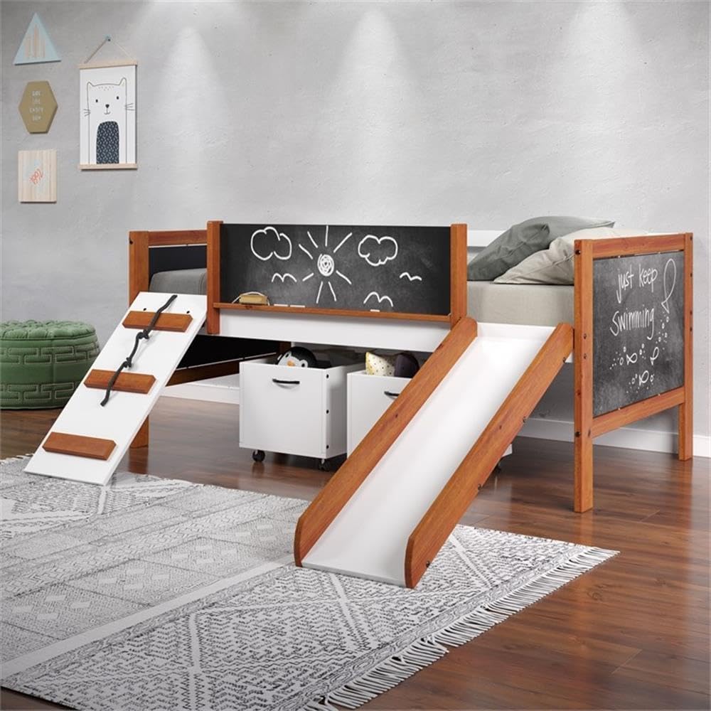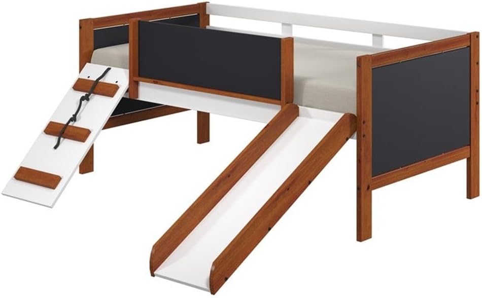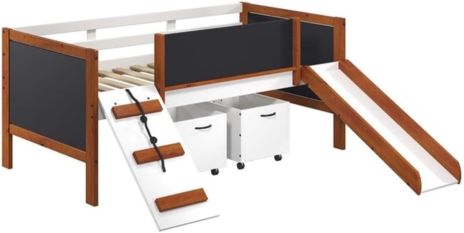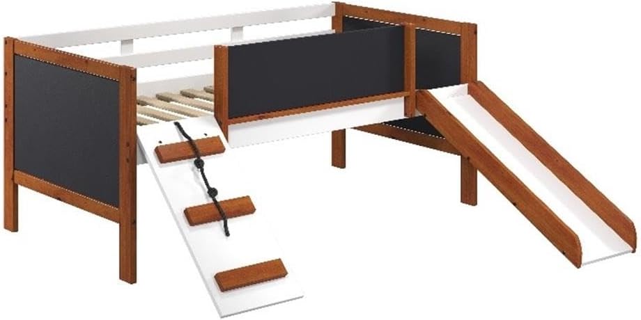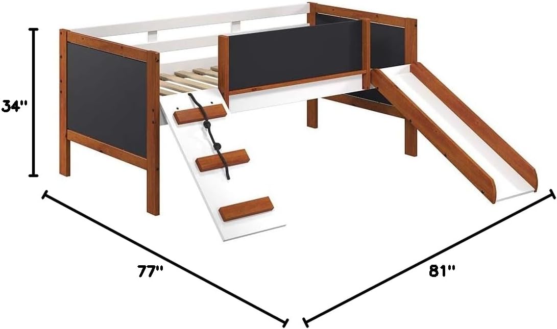 Let your little one's imagination run wild with the Aurea loft bed. Finished in a gender-neutral color palette of walnut and white. The bed features a creative way to climb in and out of bed with the built-in slide. Say goodbye to scribbled walls, the bed has chalkboard panels that let your little ones scribble away.