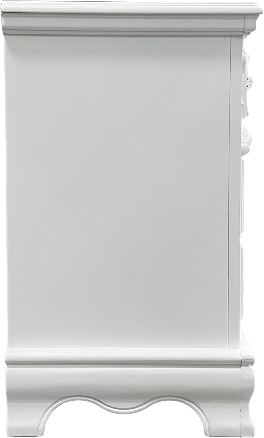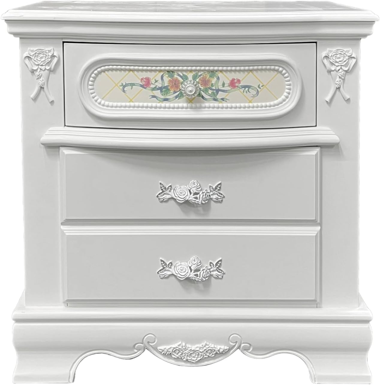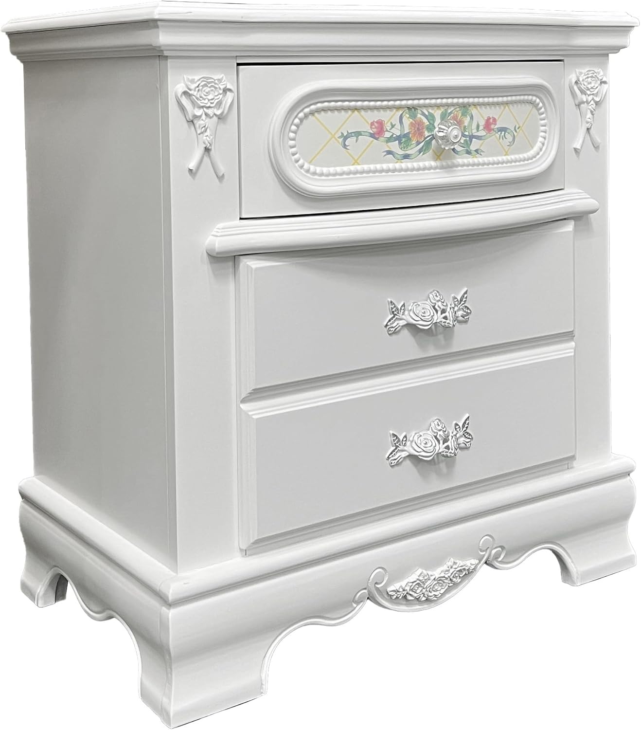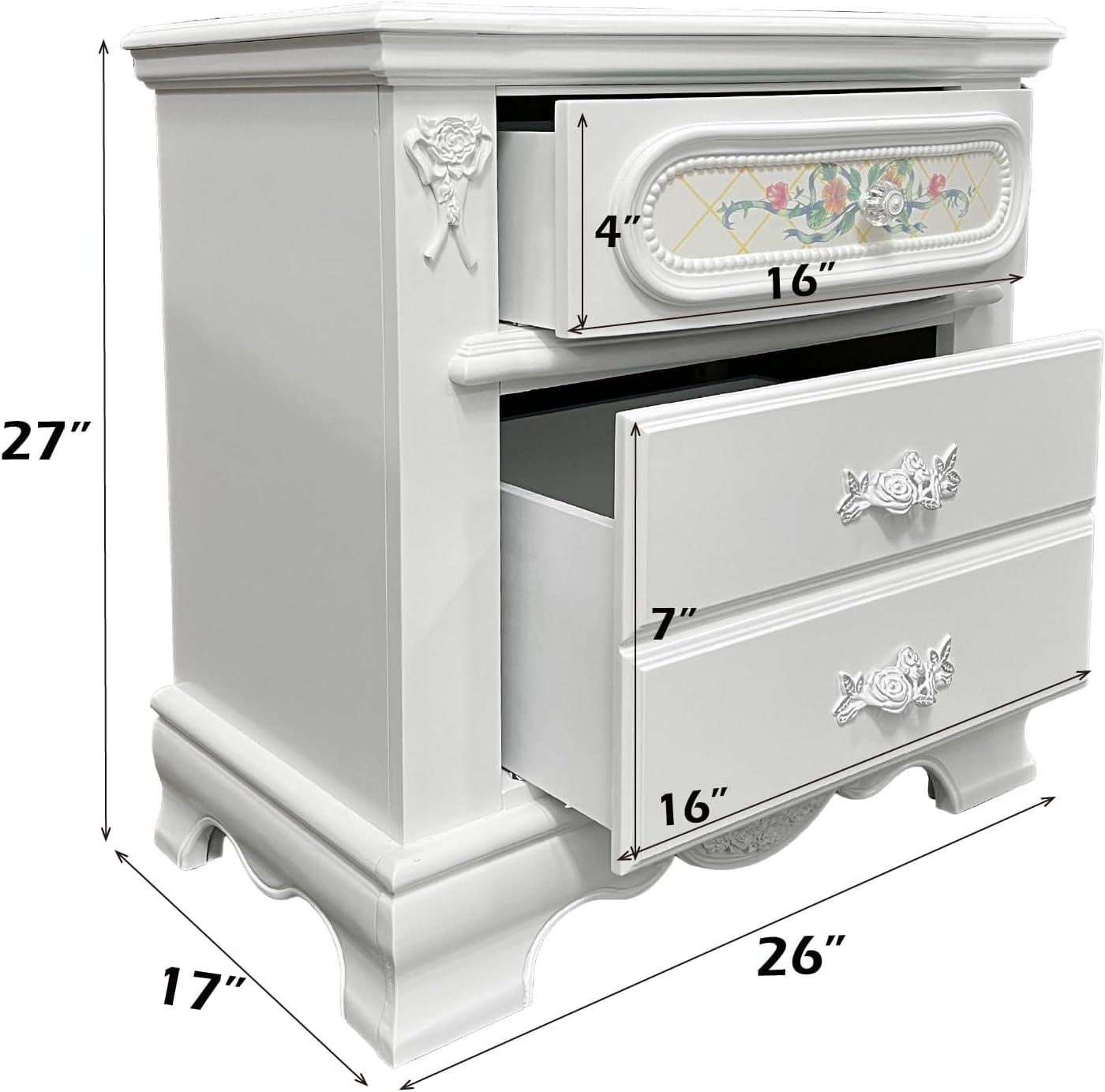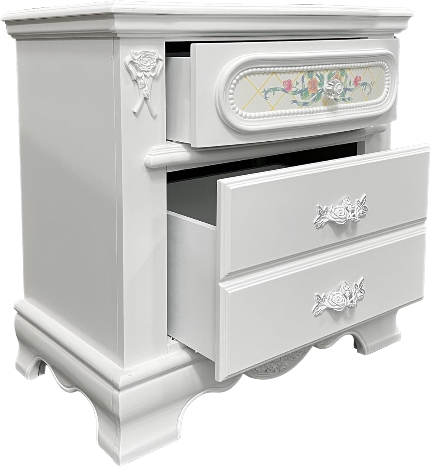 The Flora nightstand features beautiful floral motif decals, rope moldings on the drawer fronts, and decorative profiled crown molding on all cases. Providing a much-needed storage solution for all your little one's clothing and toys with its two ample drawers. This beautiful Flora nightstand is the perfect bedside solution for your favorite princess room.