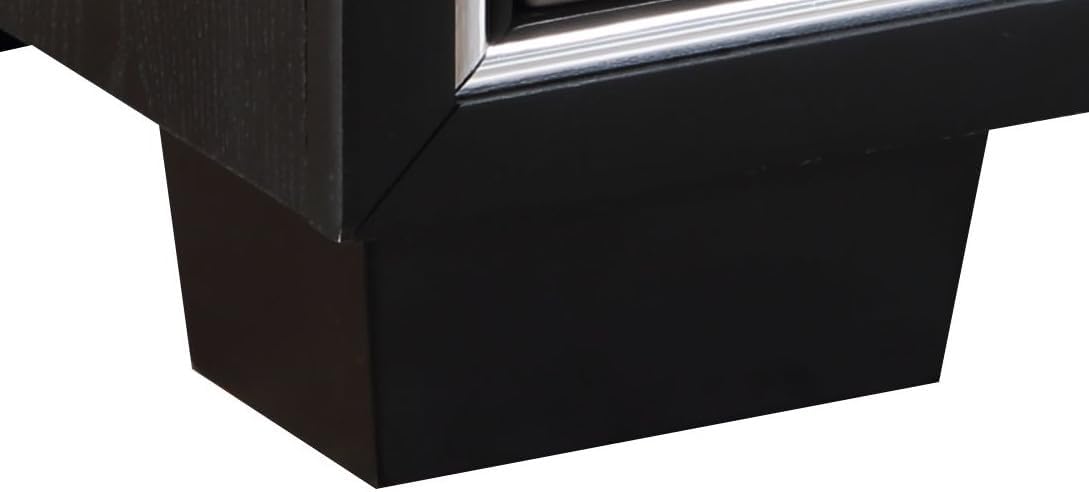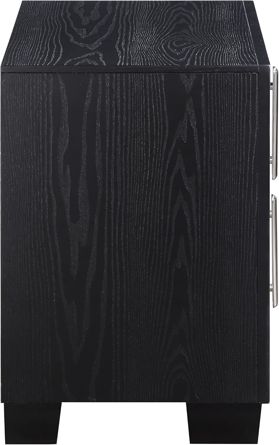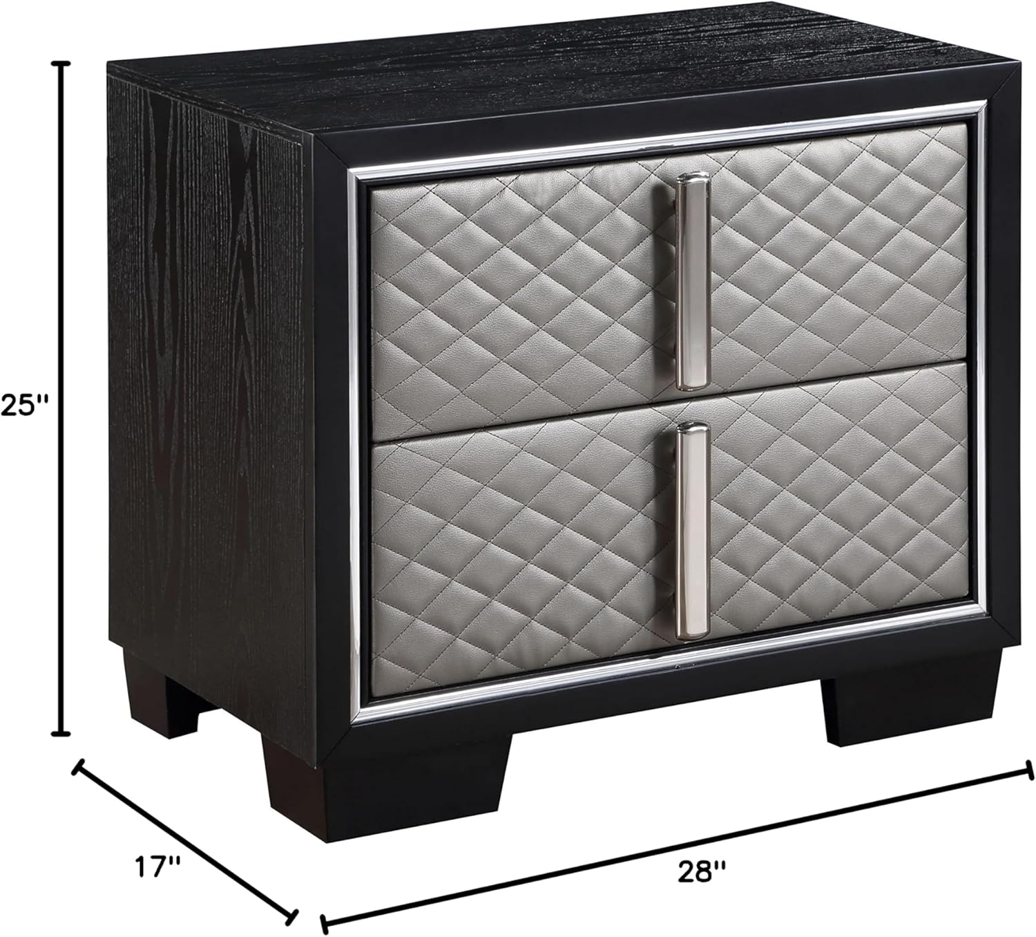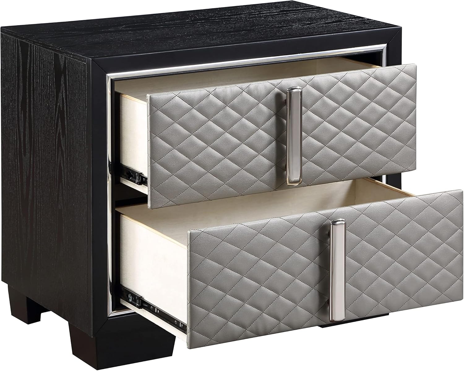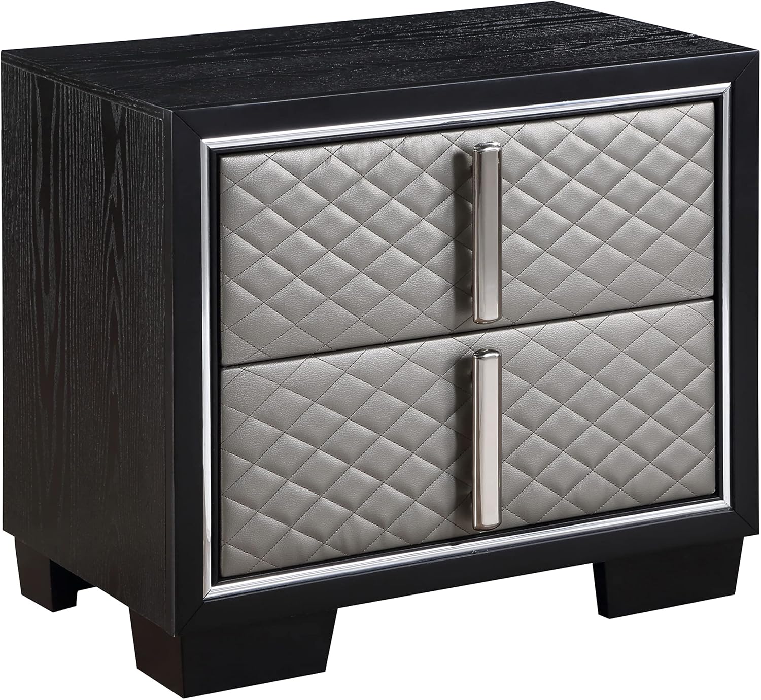 Vertical bar pulls bring striking flair to a modern glam nightstand. Two drawer adds decorative pizzazz with silver trim and diamond quilted faux leather in a silvery gray tone that sets a sophisticated ambiance. The nightstand offers a crisp black finish, complete with a wood grain texture that adds richness and dimensionality. Two drawers and roomy top create plenty of space for bedside organization of essentials.