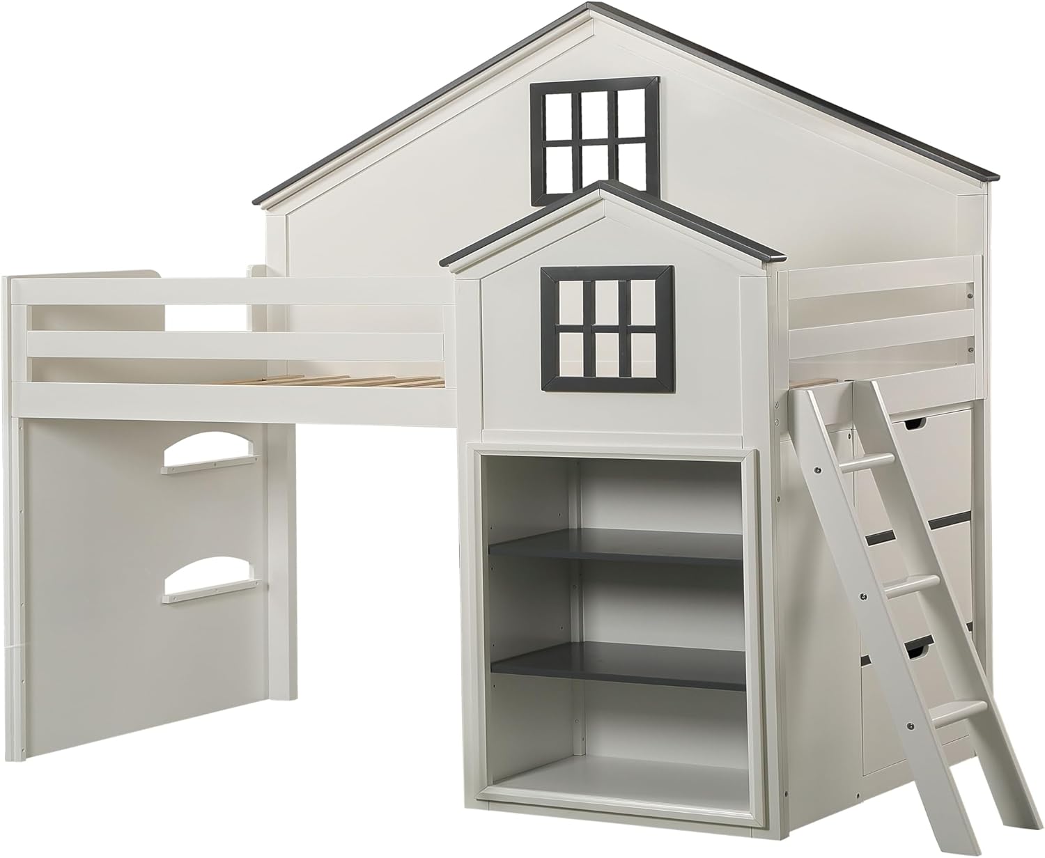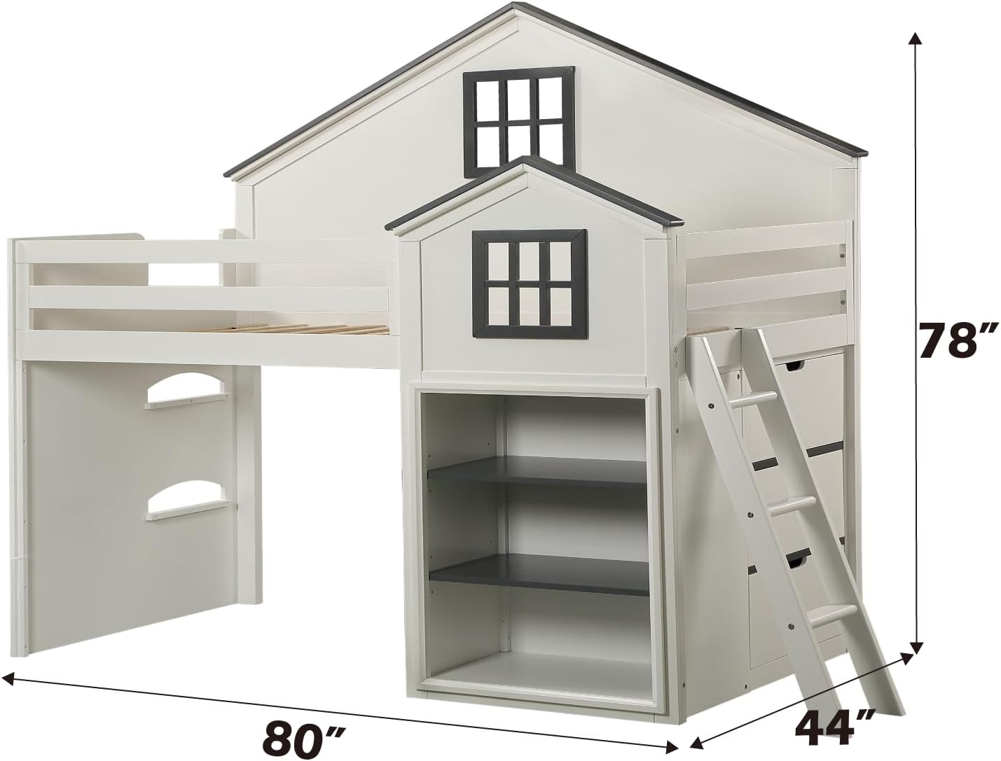 This magical house-shaped Ratana loft bed features two windows and a built-in bookshelf! The house-shaped design adds a touch of whimsical fun, making it perfect for children's rooms or anyone who wants to add a little bit of playfulness to their home. The built-in bookshelf provides ample storage for all your books, toys, and clothing, making it perfect for small spaces. Utilize the loft space as a play area or pair it with the matching twin bed for extra sleep space.