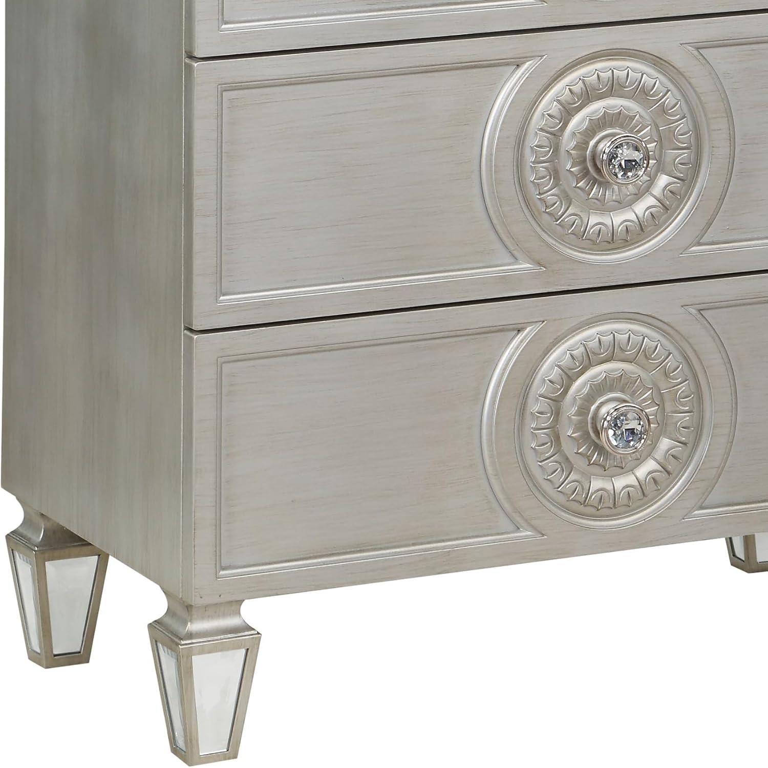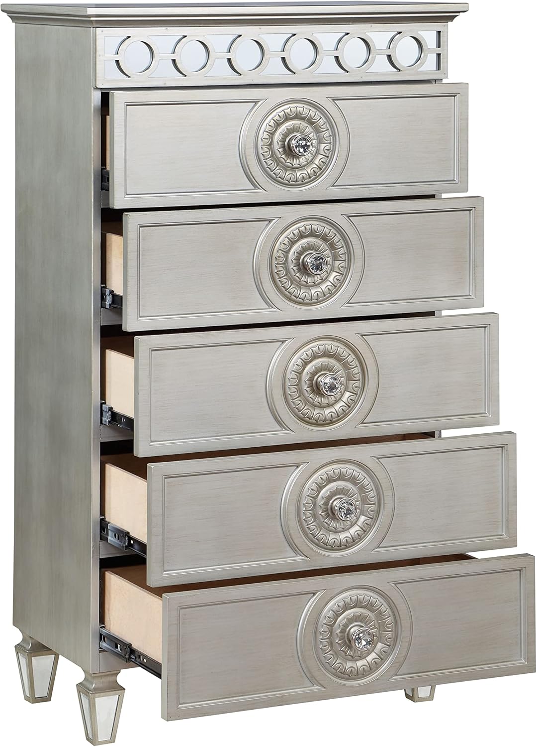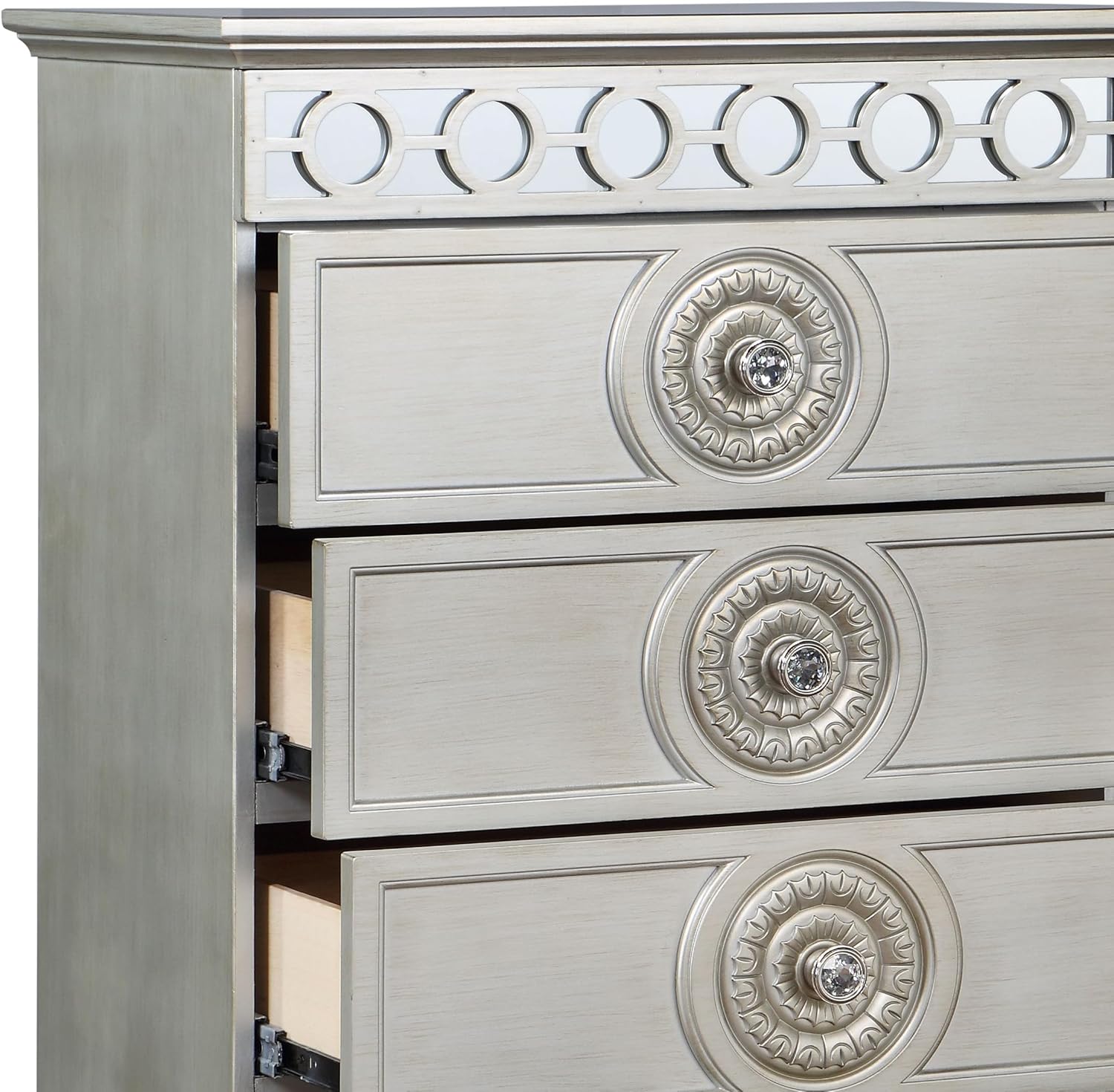 Ornate design and ample storage blend seamlessly in this charming, traditional glam five-drawer chest. A soft silver finish highlights intricate details, including decorative drawer fronts and mirror inlay with ring overlays that create superb dimension and texture. Spacious drawers offer ample space for clothing, linens, and more, while a compact footprint maximizes efficiency. A beveled top and mirror trimmed tapering legs complete the look to perfection. The chest is built with English dovetail joinery in the drawers and full extension glides for smooth performance.