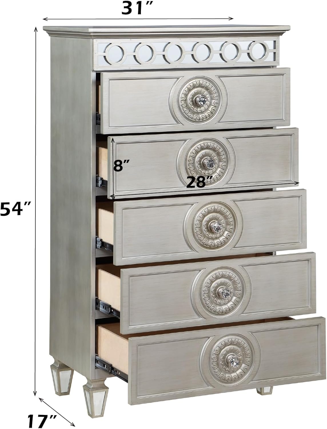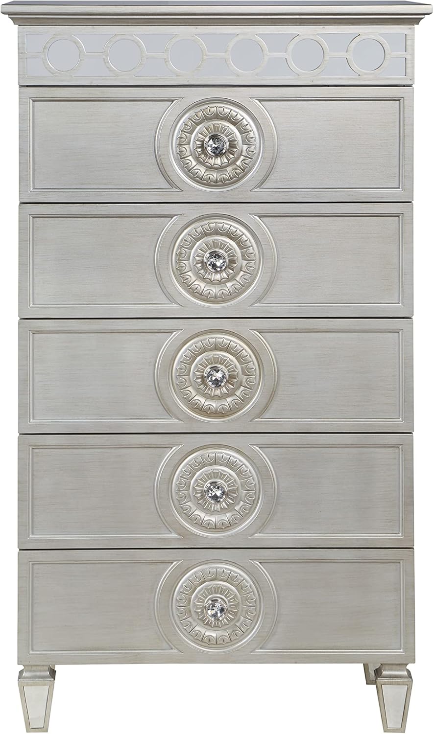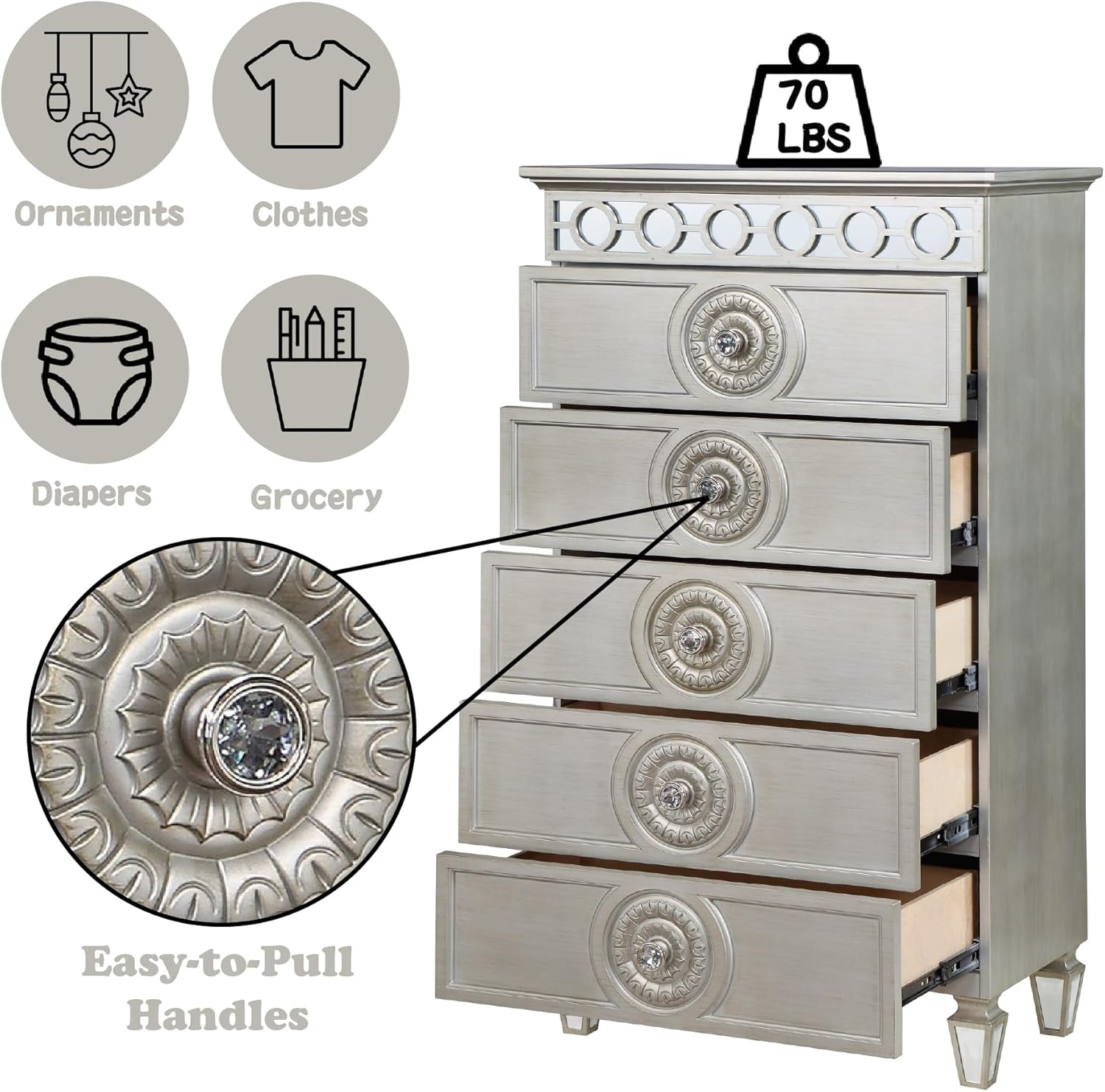 Ornate design and ample storage blend seamlessly in this charming, traditional glam five-drawer chest. A soft silver finish highlights intricate details, including decorative drawer fronts and mirror inlay with ring overlays that create superb dimension and texture. Spacious drawers offer ample space for clothing, linens, and more, while a compact footprint maximizes efficiency. A beveled top and mirror trimmed tapering legs complete the look to perfection. The chest is built with English dovetail joinery in the drawers and full extension glides for smooth performance.