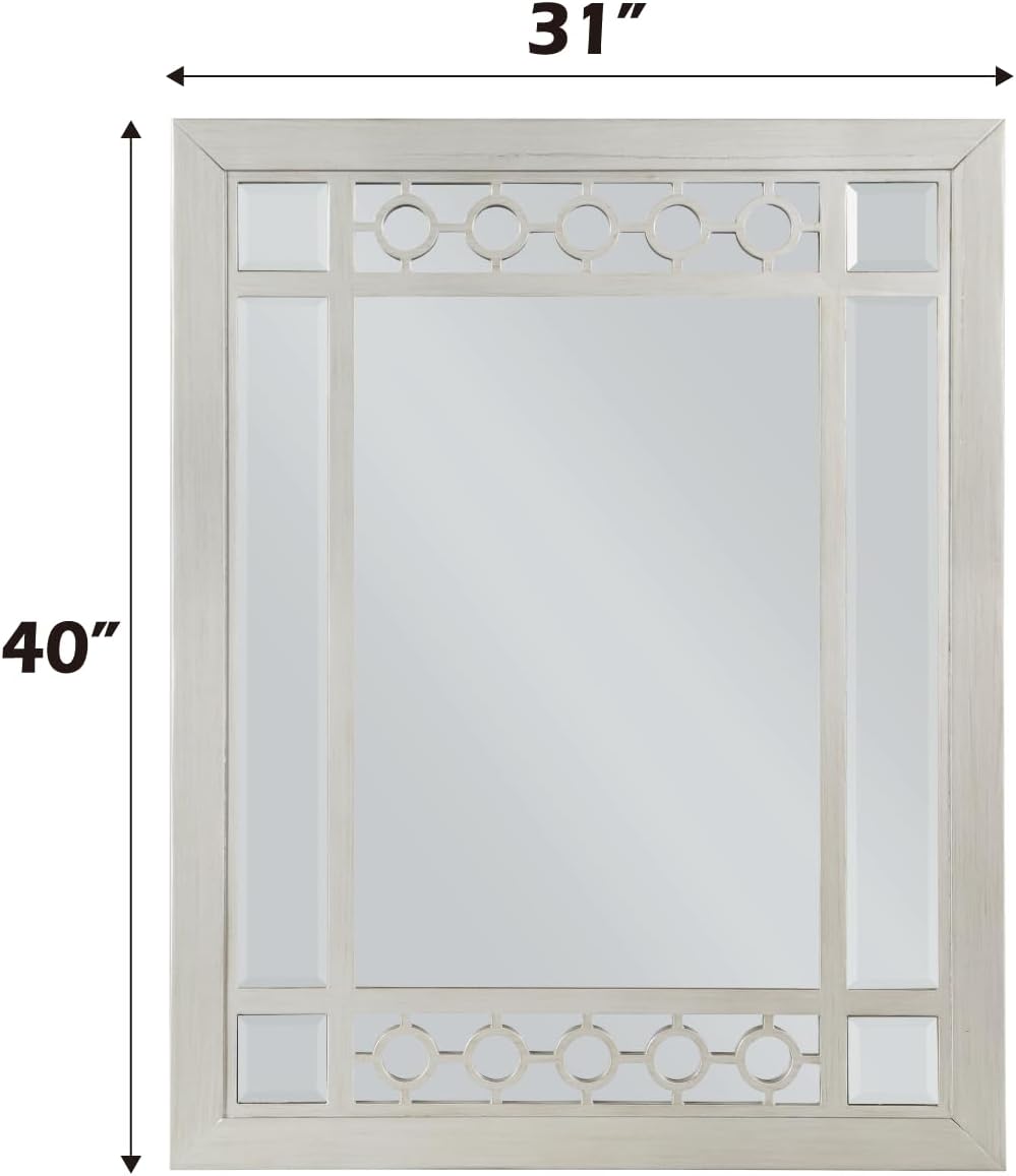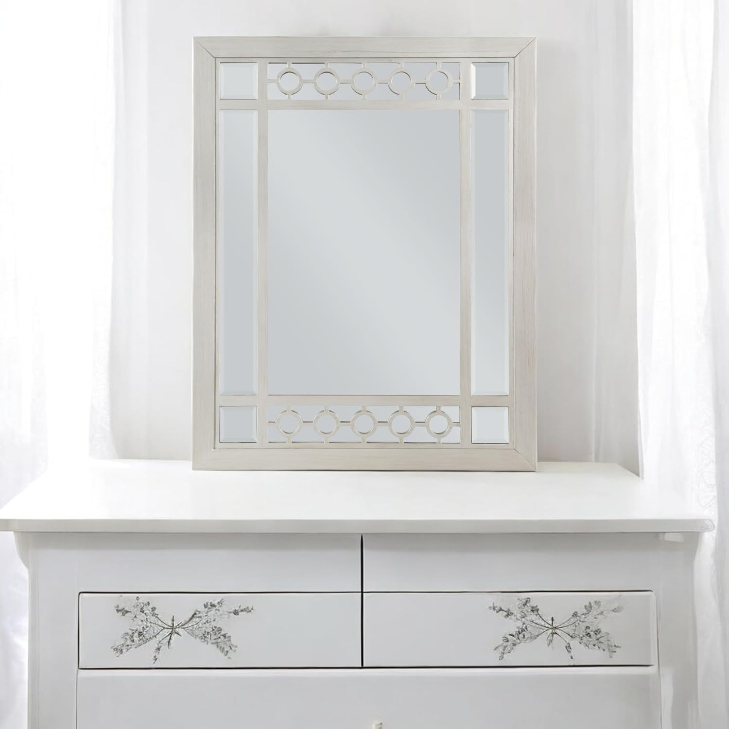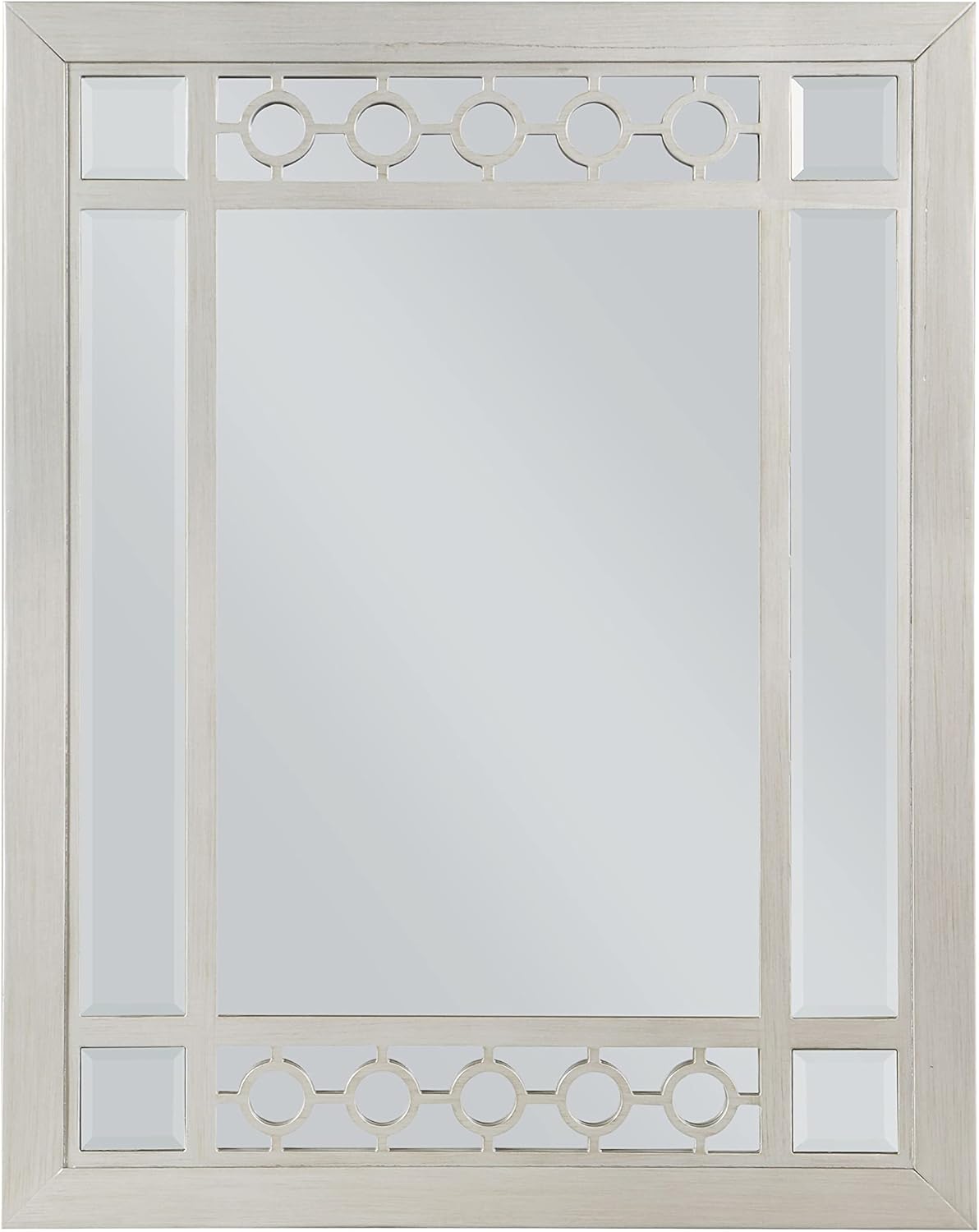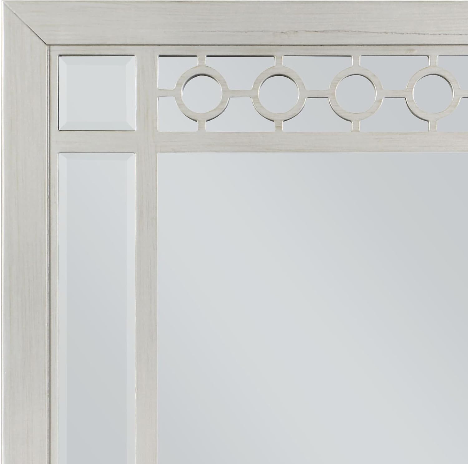 Put the finishing touches on classic glam design with a gorgeous wall mirror. Beautiful over a dresser or in a hall, the mirror features a center rectangular of glass, surrounding with mirror trim and ring overlays that bring superb texture and artistry. A silver finish completes the look with a soft, sophisticated ambiance.