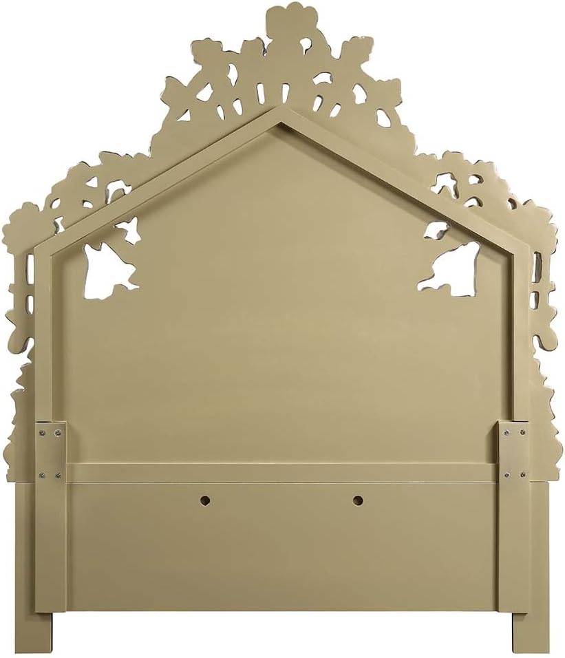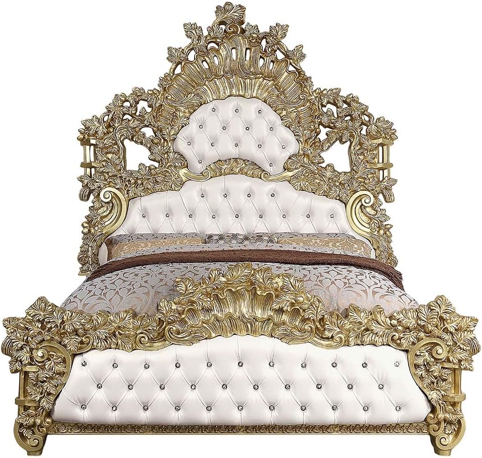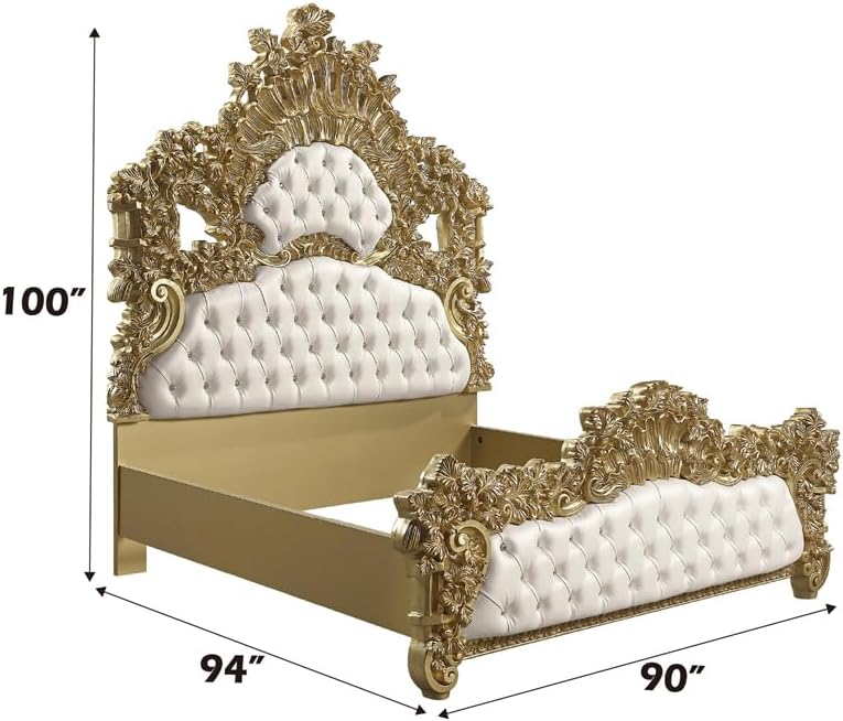 The Bernadette Collection pieces were inspired by the extravagantly decorated Rococo period in 18th century France. With its extensive decorative moldings and carvings, this furniture collection is sumptuous and extreme in design features. Utilizing many different types of material and ornamentation in a single piece to accentuate its richness and decor style. Box Spring RequiredButton TuftedCarving & Upholstered HeadboardScRolled Floral & Upholstered FootboardDrawer Structure: Metal Bottom Drawer Glide, Dovetail, 2/3 Extension, Felt Lined, Safety Stop IncludedSelfClosed Drawer Box Spring Required5 Slats IncludedButton TuftedPadded HB&FBRecommended Mattress Thickness: 810" Composite Wood, Resin, Upholstered