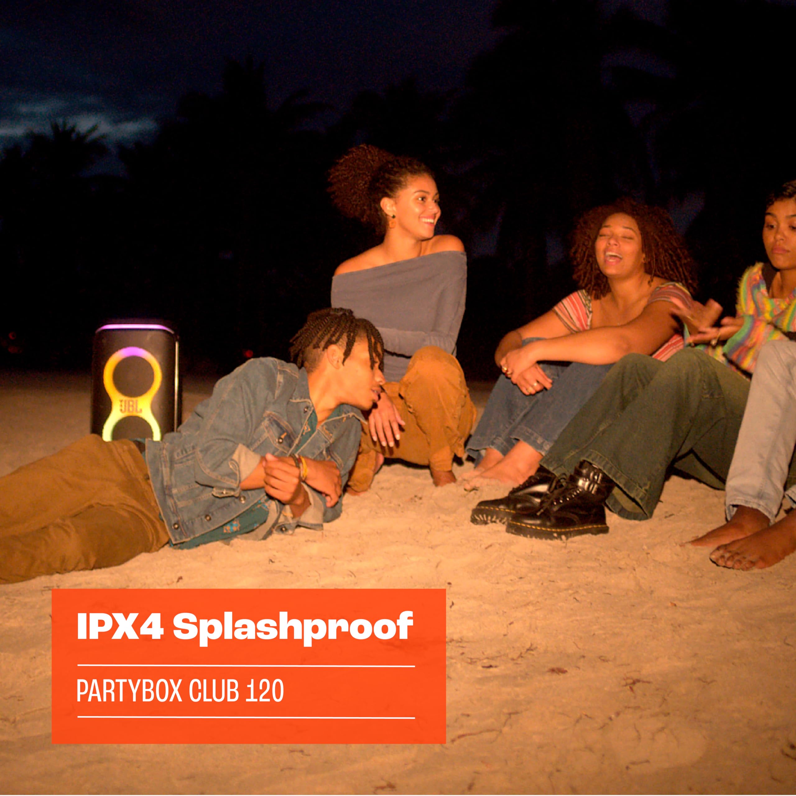 The JBL PartyBox Club 120 turns any space to party, and vibe. Powerful JBL Pro Sound fills the air while an entrancing lightshow of starry lights, cool light trails, and strobe effects syncs to your beat. Instantly pair any Bluetooth device and stream your favorite party playlist, or use the mic and guitar inputs to share your own sound. Either way, you can steer the party's flow with fun interactive party effects using the JBL PartyBox app. A folding ergonomic handle makes the PartyBox Club 120 easy to take with you anywhere, and the splash-proof construction means it won't be troubled by a little rain. It delivers up to 12 hours of playtime—and if the party's still flowing by then, just swap out the replaceable battery and keep the music and lights going strong. For an even bigger time, stereo pair two JBL PartyBox Club 120s for a wider soundstage, or use the JBL PartyBox app to connect multiple JBL Auracast-enabled speakers wirelessly. Roll up to the party with the JBL PartyBox Club 120.