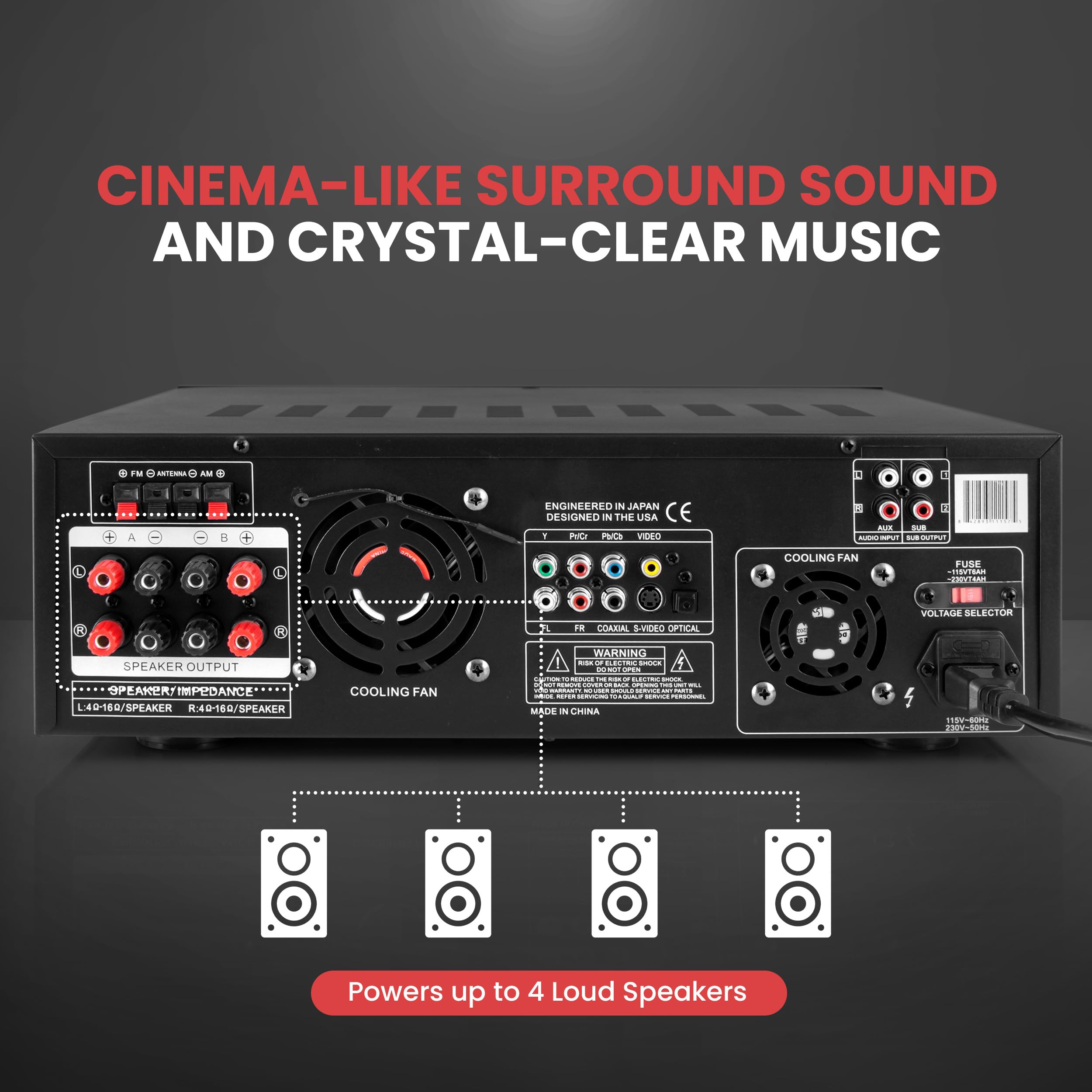 Audio / Video Home Theater Pre-Amplifier, 4-Ch. Pro Audio Receiver System, Connects to TVs Soundbars Speaker Systems, Built-in Bluetooth for Wireless Music Streaming, Front Loading CD/DVD Player, Powers up to (4) Loud Speakers, Front Panel Control Center with Dynamic VFD Display, AM/FM Stereo Radio, USB Flash Drive Reader, MP3 Digital Audio File Compatibility, (4) Pair Speaker Terminal Binding Posts, (2) Pair RCA (L/R) Audio Inputs, Aux (3.5mm) Input Jack, (2) 1/4'' Microphone Inputs, 1/4'' Headphone Jack, Subwoofer RCA (L/R) Output, Optical (Digital) Audio Output, Video Outputs: S-Video RCA YPbPr (Component Video), Output dB (Decibel) Level LED Display, Mic Echo Treble Bass Volume Subwoofer Controls, Sleek Brushed Aluminum and Metal Chassis Housing, Built-in Ventilation Cooling Fan, Universal Rack Mountable, Works with All of Your Favorite Bluetooth Devices, (Smartphones, Tablets, Laptop, PC etc.), Bluetooth Network Name: 'PYLE PRO', Bluetooth Network Password: Not Required, Bluetooth Version: 5.0, Bluetooth Wireless Range: 40'+ ft., Preamplifier Receiver, Remote Control, Detachable Rack Mount Brackets, RCA Connection Cables, AM + FM Antennas, Power Cable, Amplifier Receiver Type: 4-Channel, Power Output: 1000 Watt MAX, 360 Watts x 2 @ 4 Ohm, 200 Watts x 2 @ 8 Ohm, Impedance: 8 Ohm, Aspect Ratio: 4:3/16:9, Video System: PAL/NTSC, Audio S/N Ratio: >90dB, Quartz Synthesized Radio Tuner, Radio Presets: 30 Station Memory, CD/DVD Disc Compatibility: DVD/CD/VCD/CD-R/CD-RW/MP4, Power Supply: 115/230V, Switchable, Dimensions (L x W x H): 16.9’’ x 13.8’’ x 5.6’’ -inches, Weight: 20.48 lbs.