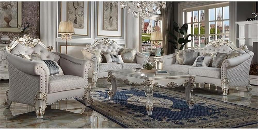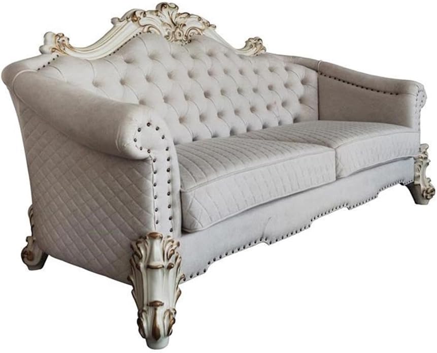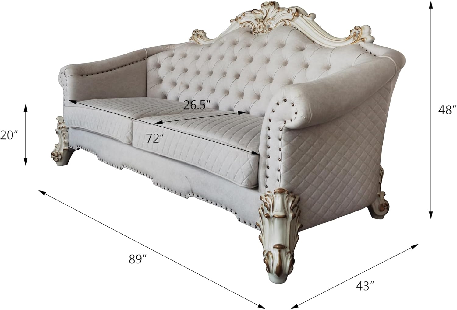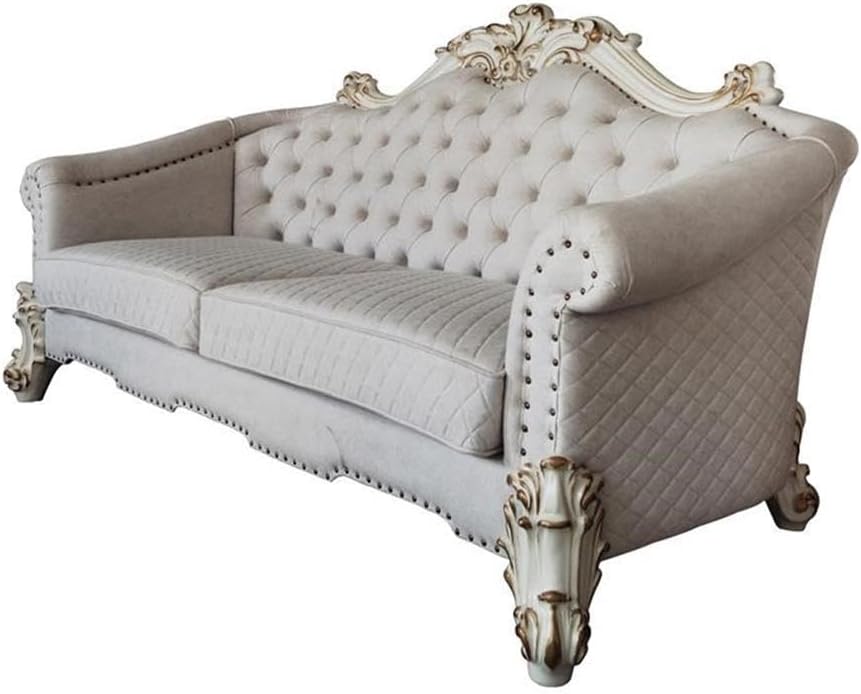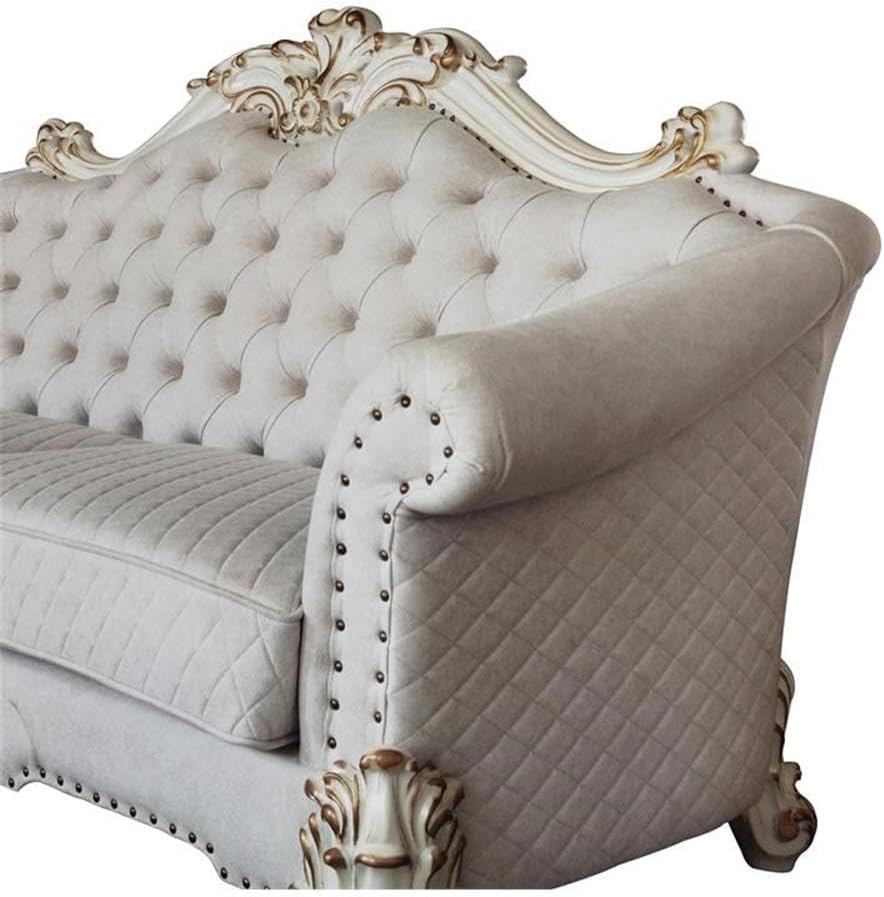 The sofa upholstery light gray fabric is grand and classy with a crystal-like button tufting on the back in a crackled gold patina finish richly accented with gold leaf brushed onto each piece by hand. The carved frame decor and nailhead trim around the crown, arm, and base accentuates style and class. While elegantly reflecting its surroundings it combines glamour with modernism and provides a modern twist to enhance your room decor.