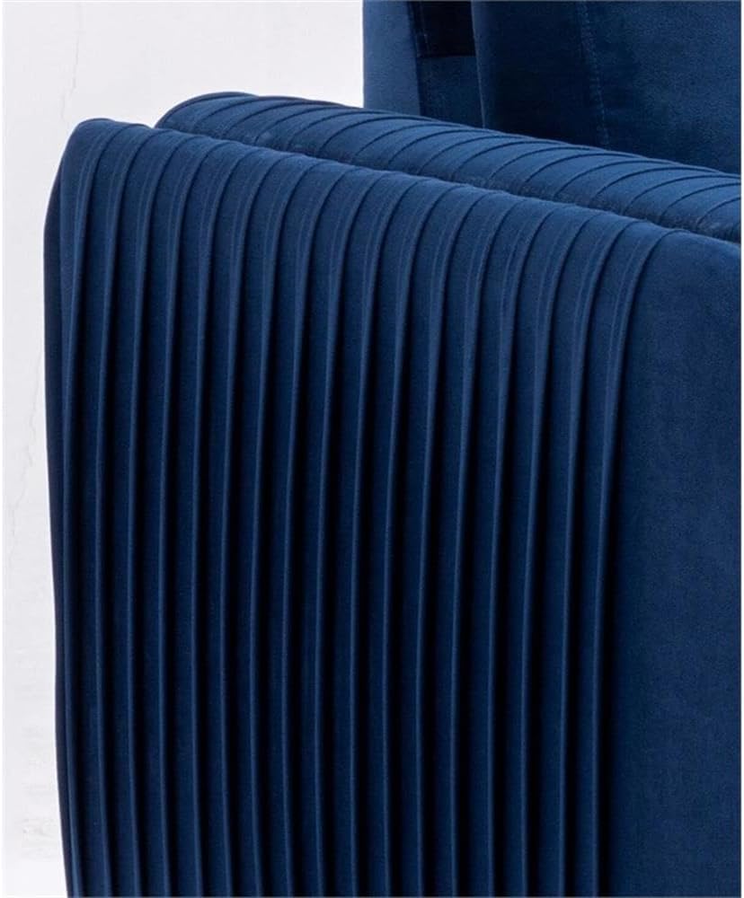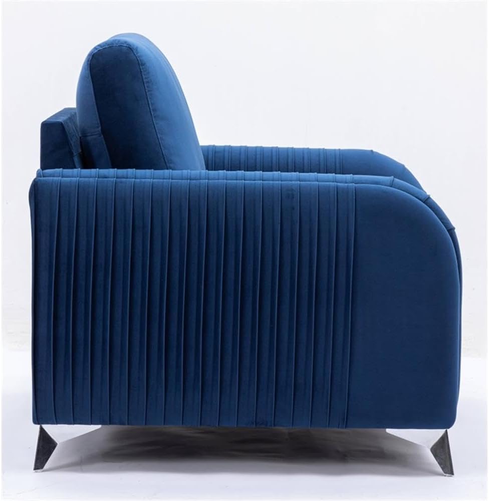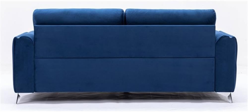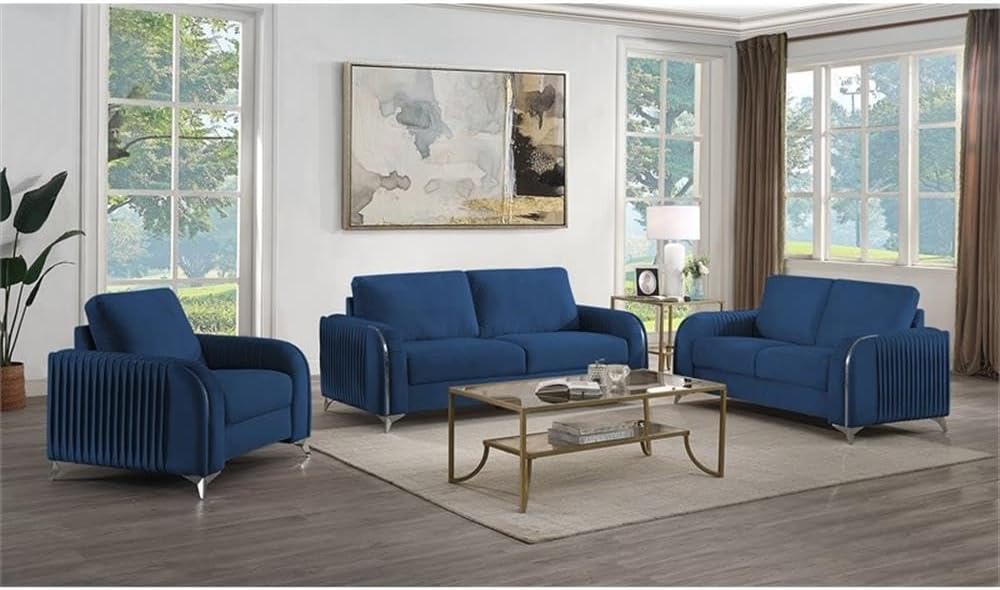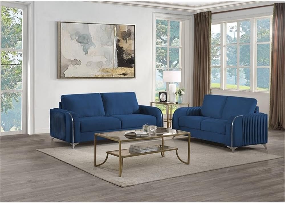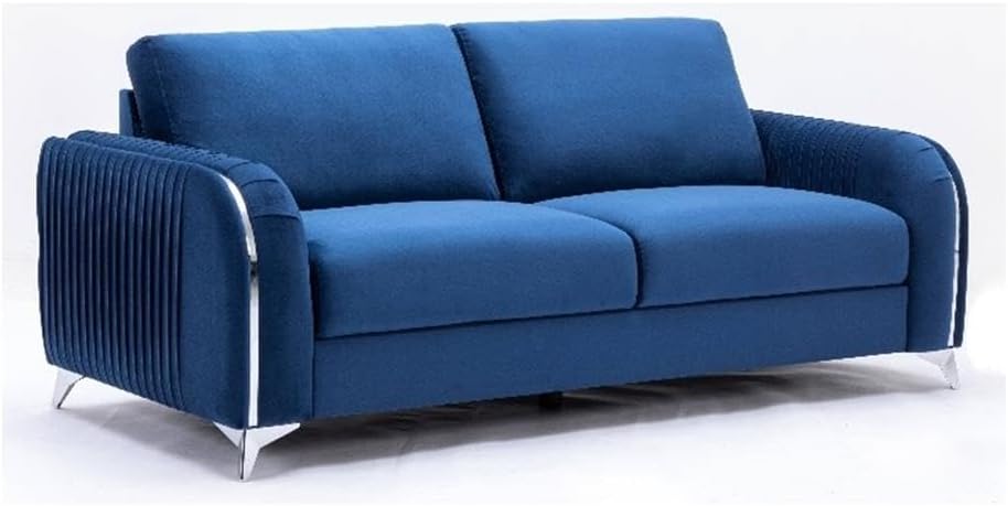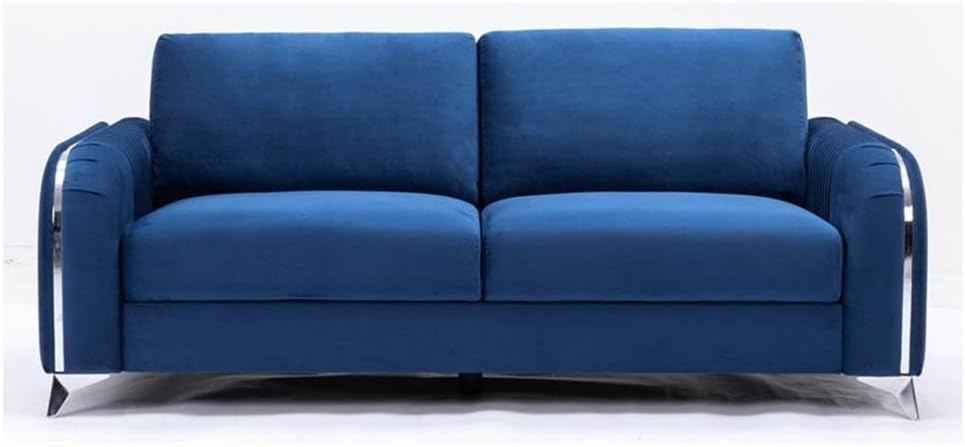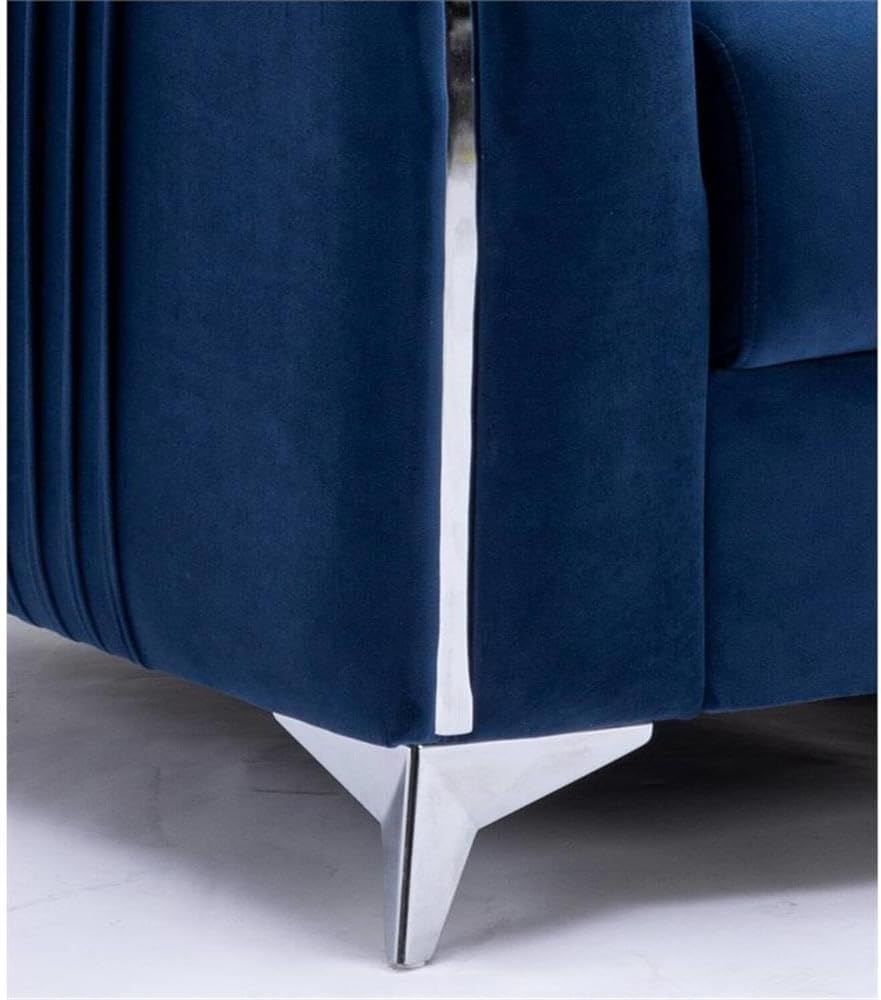 Make a bold statement with the Wenona blue velvet sofa. The blue color of the velvet upholstery is a classic color that will provide a fun pop of color in any home. This sofa is highlighted with polished chrome trim accents along the armrests and legs to match. The armrests boast eye-catching vertical pleating that creates a beautiful contemporary 3-D effect. This sofa offers plush pocket coil seating for hours of comfort around the TV with the family.
