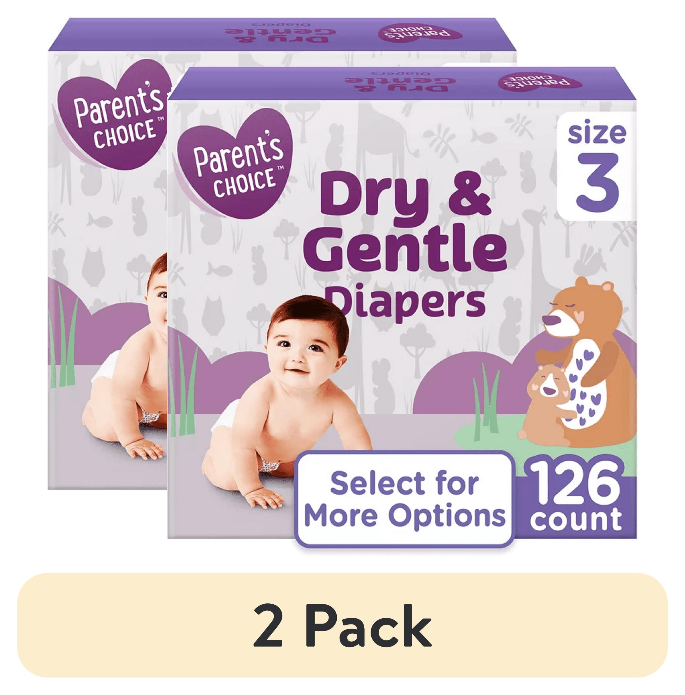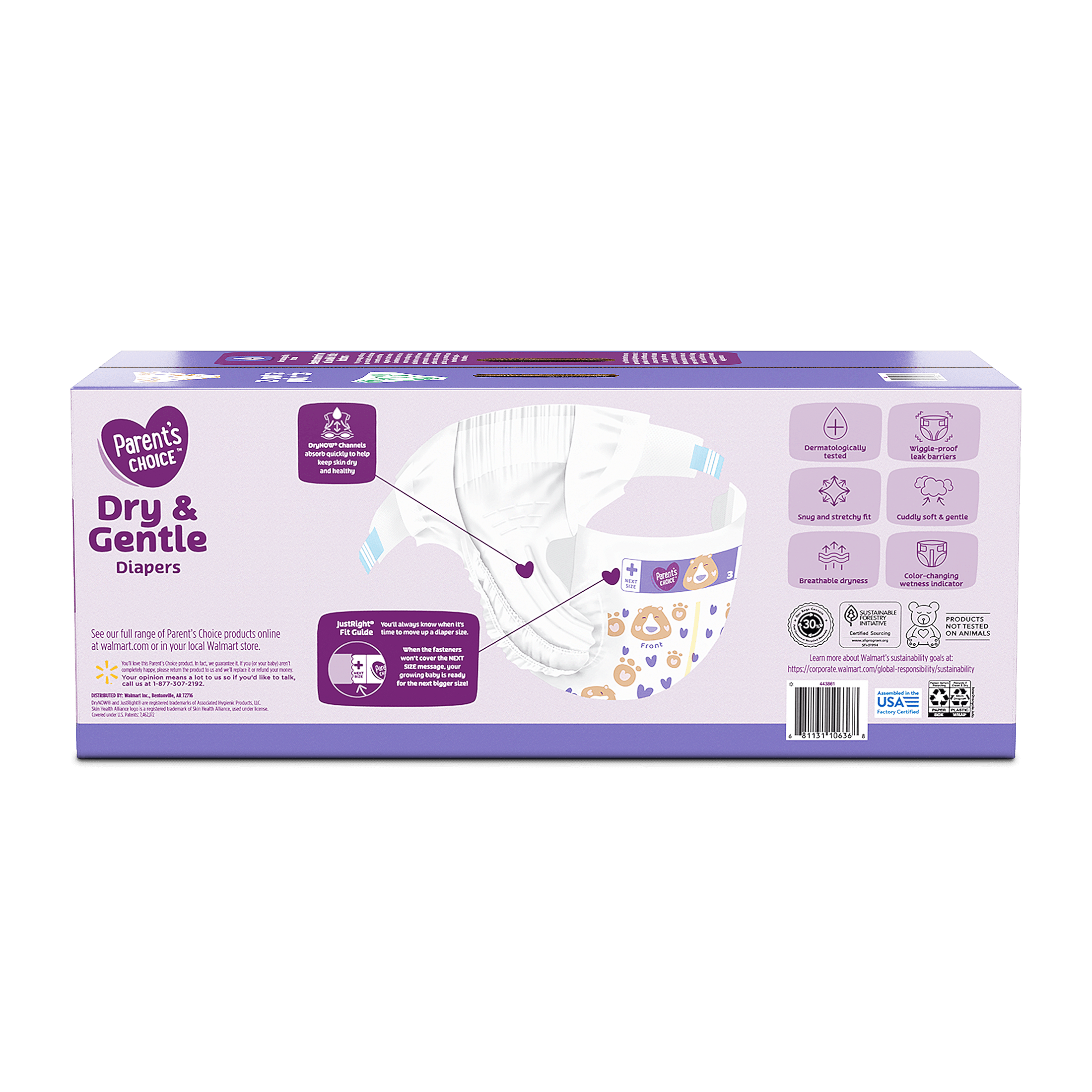 Parent's Choice Dry & Gentle Diapers Size 3, 126 Count offer dependable, all-day protection for active babies. These diapers feature DryNOW Channels that deliver 3x protection by quickly absorbing moisture, improving breathability, and keeping baby’s skin dry. With a soft, hypoallergenic liner and stretchy sides for a comfortable fit, these diapers are gentle on sensitive skin and ideal for both day and nighttime use. Parent's Choice Dry & Gentle Diapers Size 3, 126 Count are a trusted choice for comfort and leak protection.