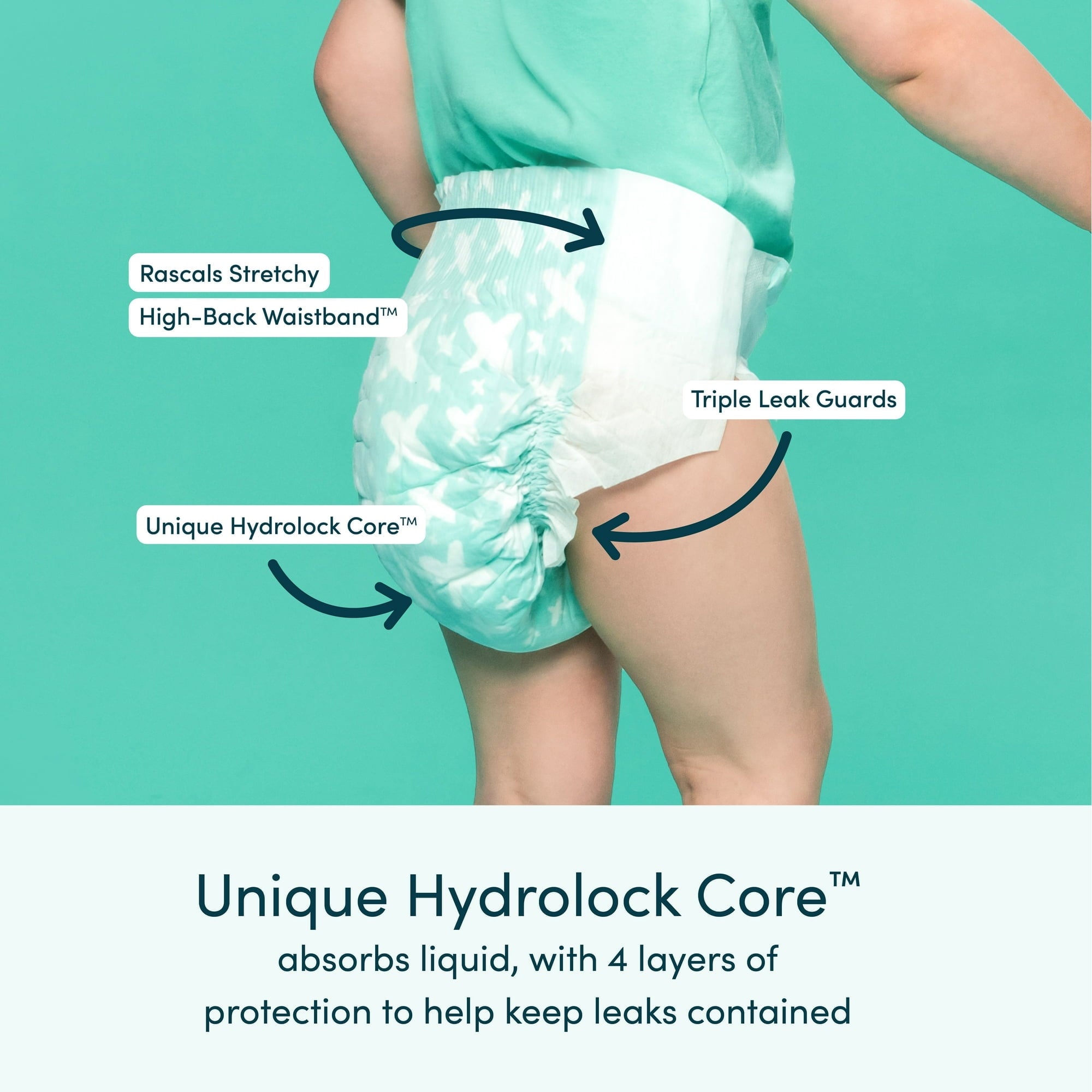 Rascalius Premium Diapers are ready for every mess! Designed with 6 Core Innovations for high-performance, our unisex diapers are ultra-absorbent with up to 12 hours of leak protection, making them ideal for both daytime and overnight. Dermatologist-tested and hypoallergenic, Rascals baby diapers are dry and gentle, and safe for newborn, infant and toddler skin. Whether you’re preparing for a baby shower, birth, or pregnancy, Rascals Premium Diapers are a newborn essential and must-have for every parent. Rascals diapers are suitable for babies from 0-37+Ibs and available in size newborn, size 1, size 2, size 3, size 4, size 5, size 6, size 7. Perfect for nighttime, our size range ensures the perfect fit for every stage of your little one's growth. Our Unique Hydrolock Core™ absorbs liquid with 4 layers of protection to help keep leaks contained, and our Stretchy High-Back Waistband™ offers a snug comfortable fit. Designed with AirSpun™ Technology for a breathable and feather-soft feel on skin, our baby diapers are made with Zero Nasties for safe and gentle protection. Don’t just take our word for it, Rascals products are loved by millions of parents worldwide, with over 210,000+ 5-star reviews.* Try Rascals Premium Diapers! Ready for every mess. *Based on all reviews of Rascals diapers, training pants, and wipes across websites globally, including incentivized and organic reviews.