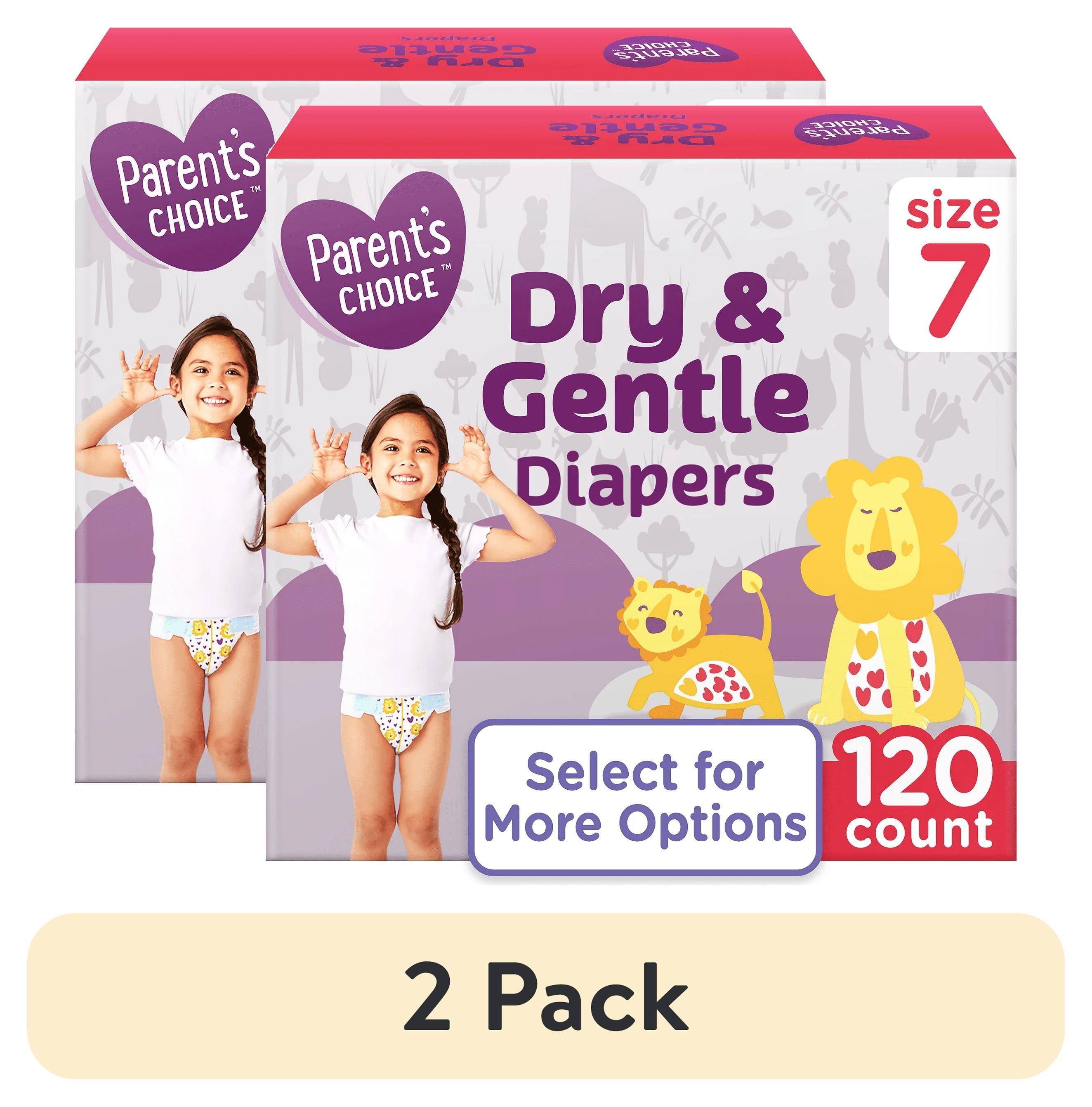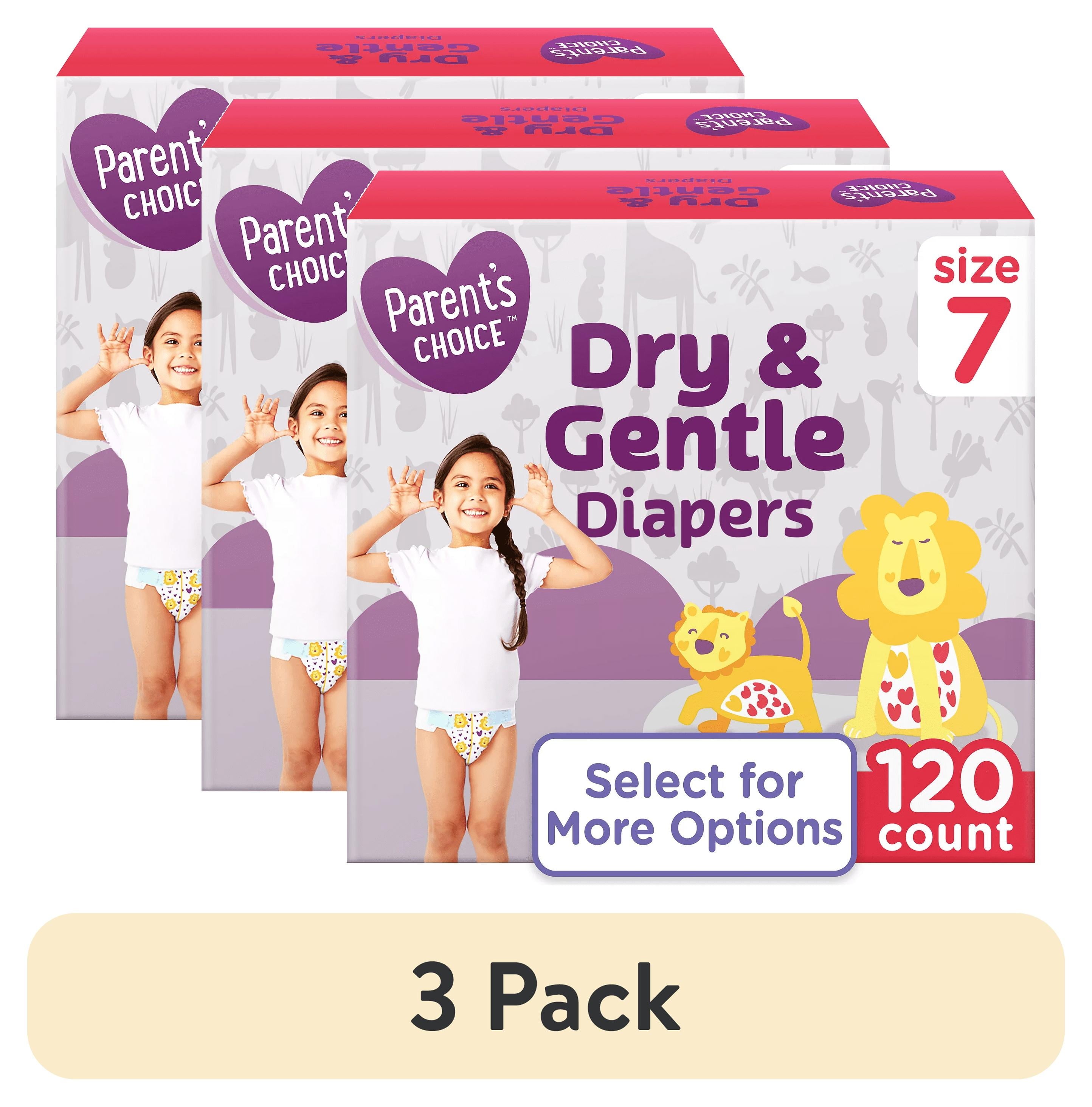 Parent's Choice Dry & Gentle Diapers Size 7, 120 Count are specially designed for toddlers and older children who need dependable, comfortable protection. Featuring DryNOW Channels, these diapers deliver 3x protection by locking away moisture, promoting breathability, and keeping skin dry. The hypoallergenic liner is gentle on sensitive skin, while stretchy sides ensure a secure, flexible fit. Parent's Choice Dry & Gentle Diapers Size 7, 120 Count provide up to 12 hours of leak protection, making them ideal for both daytime and overnight use.