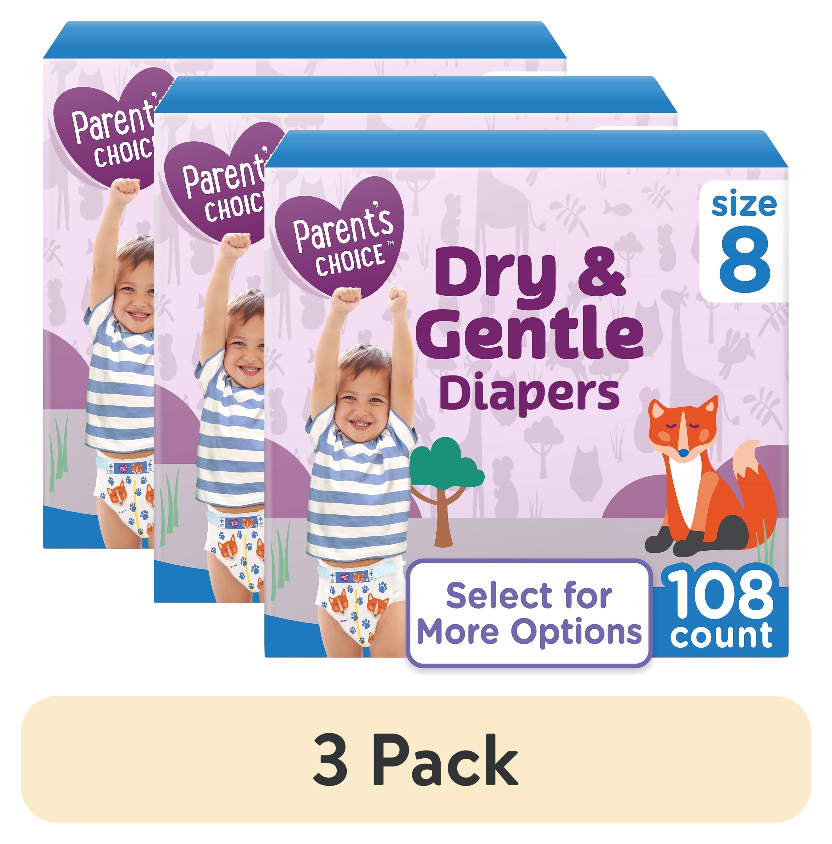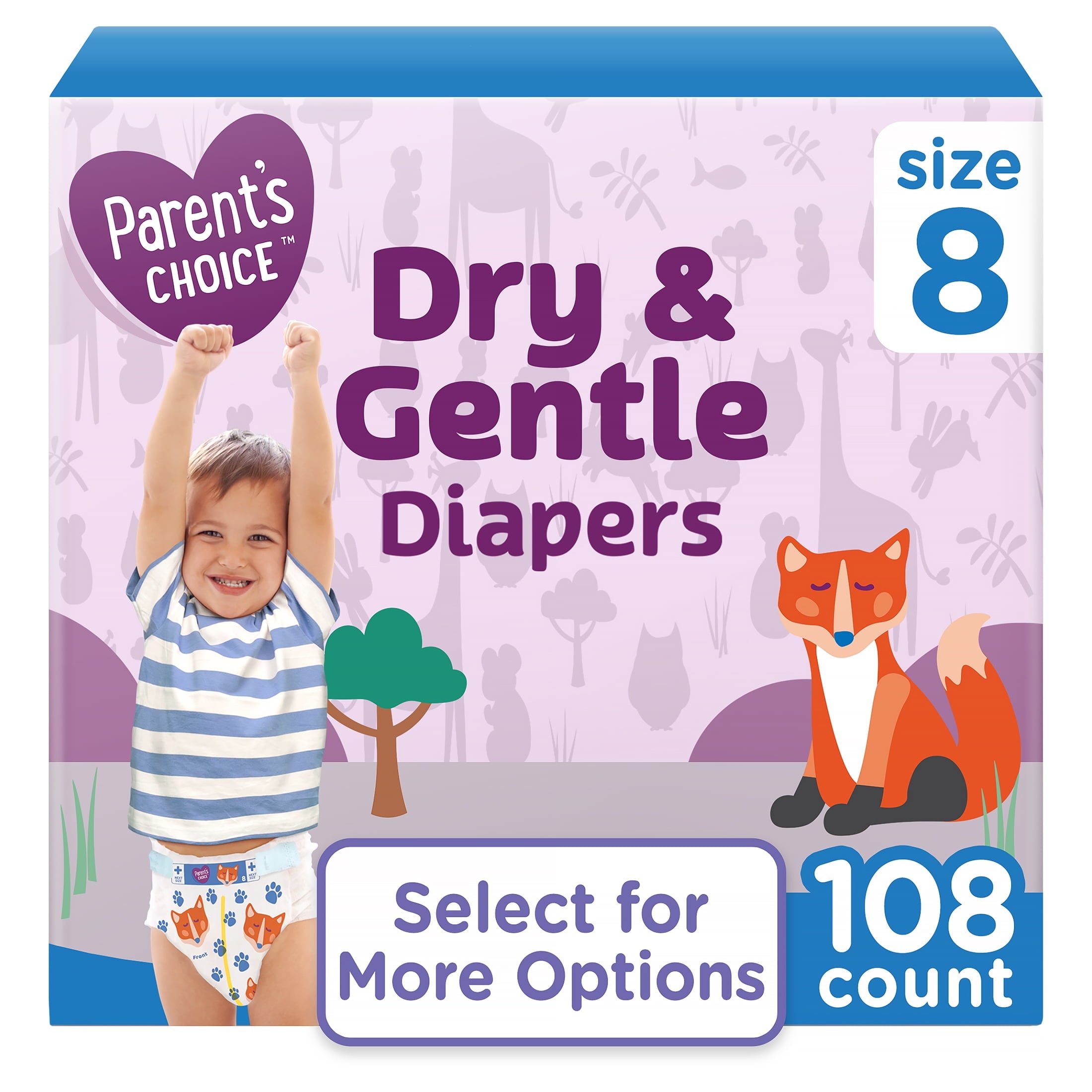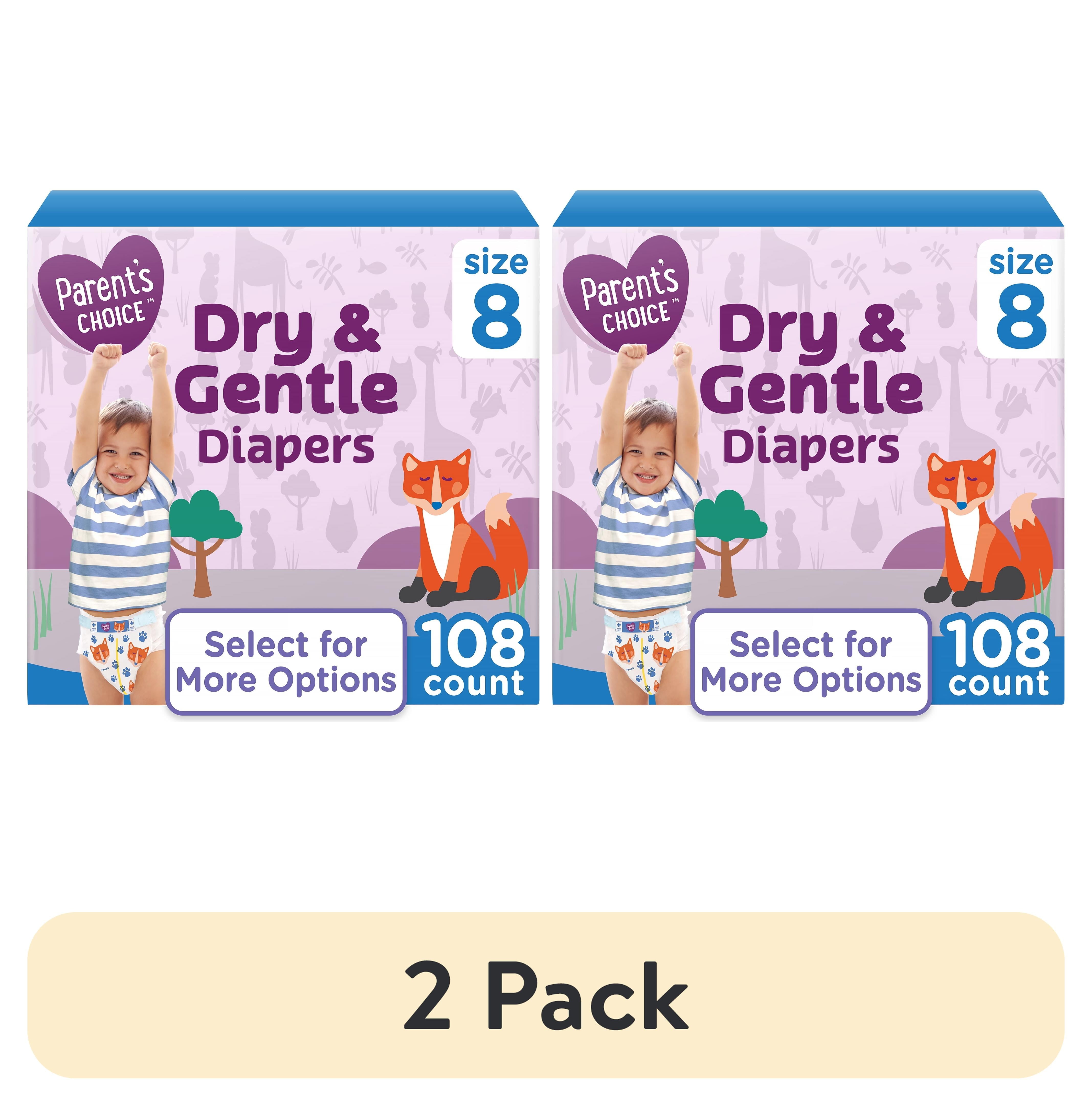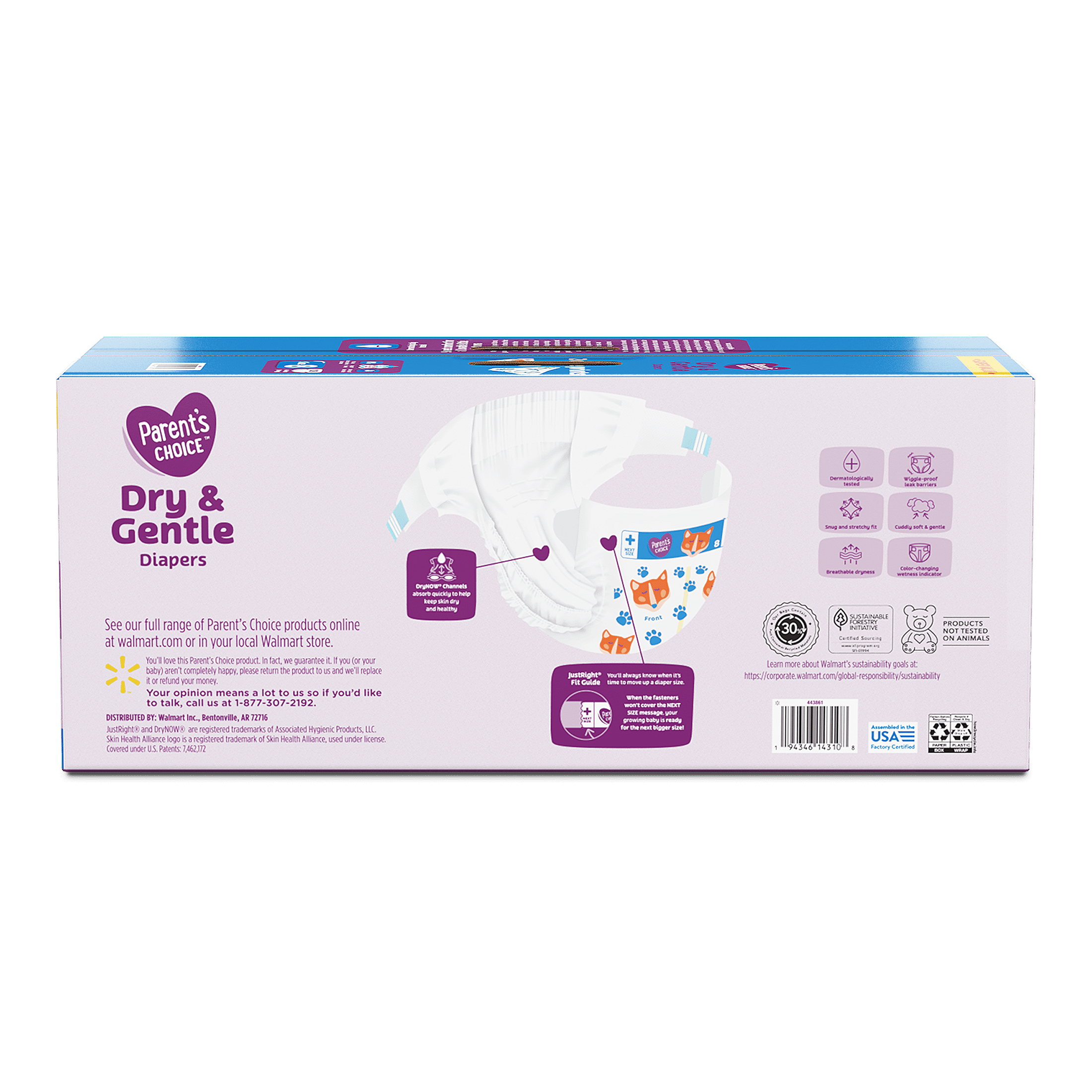 Parent's Choice Dry & Gentle Diapers Size 8, 108 Count are specially designed to meet the needs of older toddlers and children who require a larger, more absorbent fit. These diapers feature DryNOW Channels for 3x protection—quickly absorbing moisture, enhancing breathability, and keeping skin dry. A soft, hypoallergenic liner ensures comfort for sensitive skin, while stretchy sides provide a secure and flexible fit. Parent's Choice Dry & Gentle Diapers Size 8, 108 Count offer dependable leak protection for both day and night.