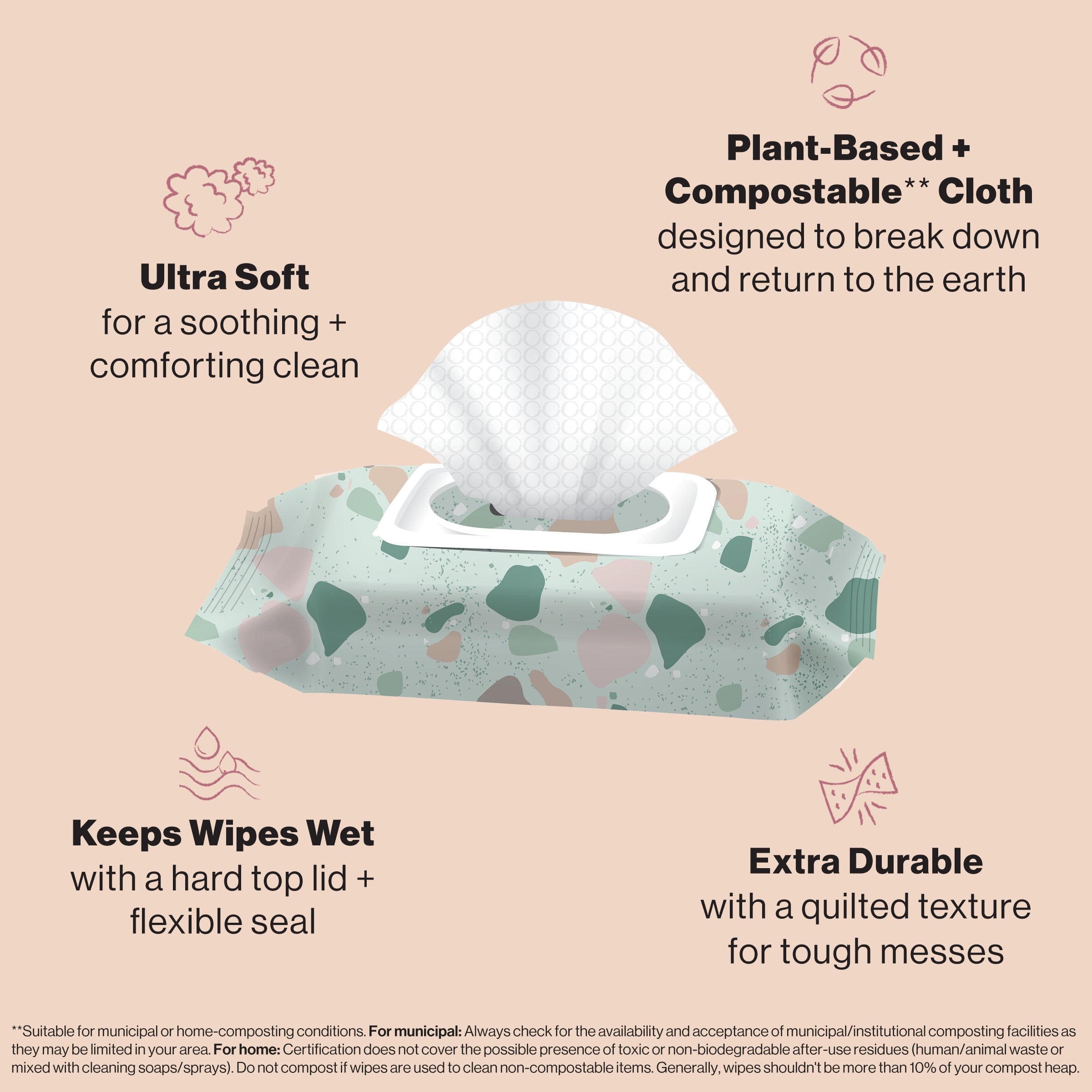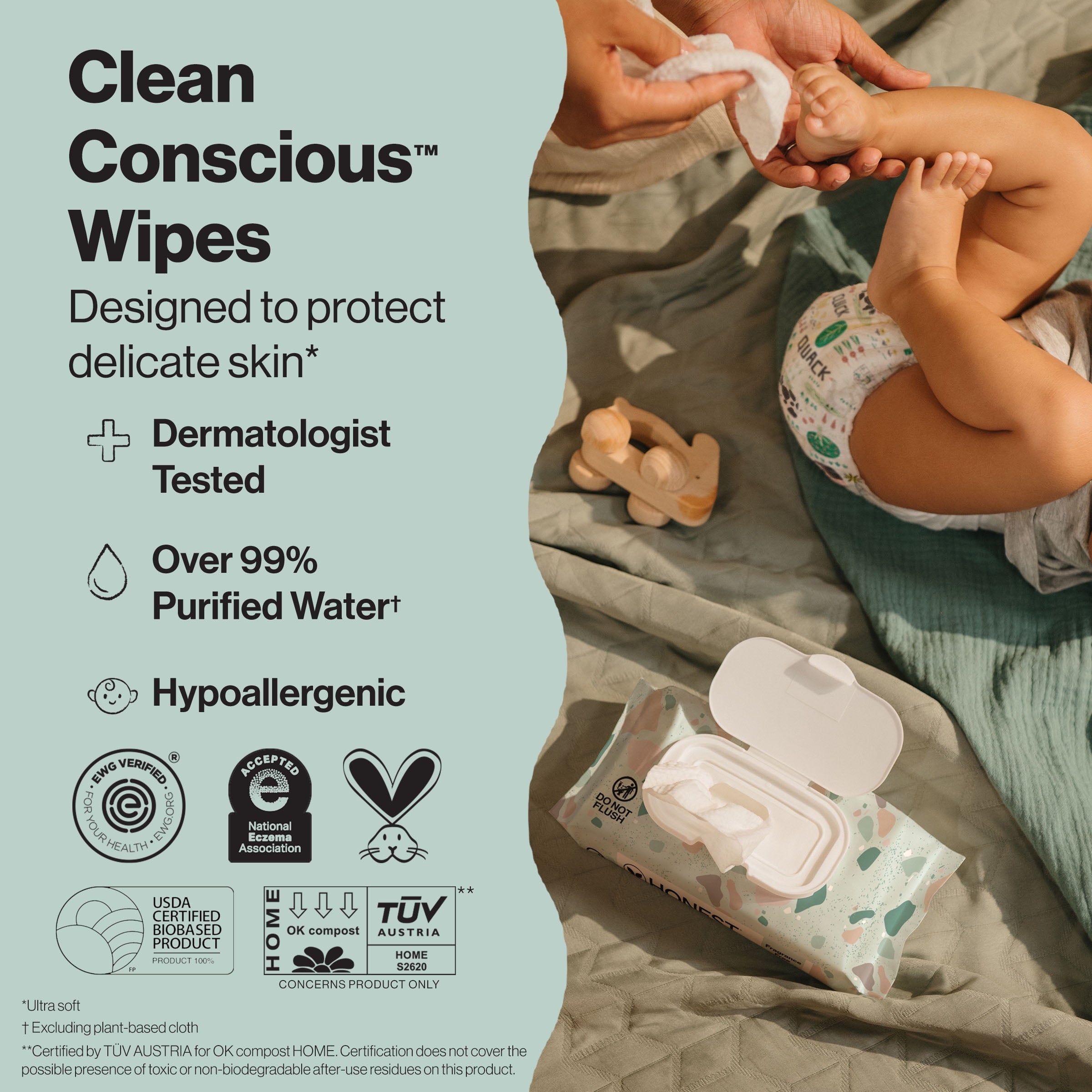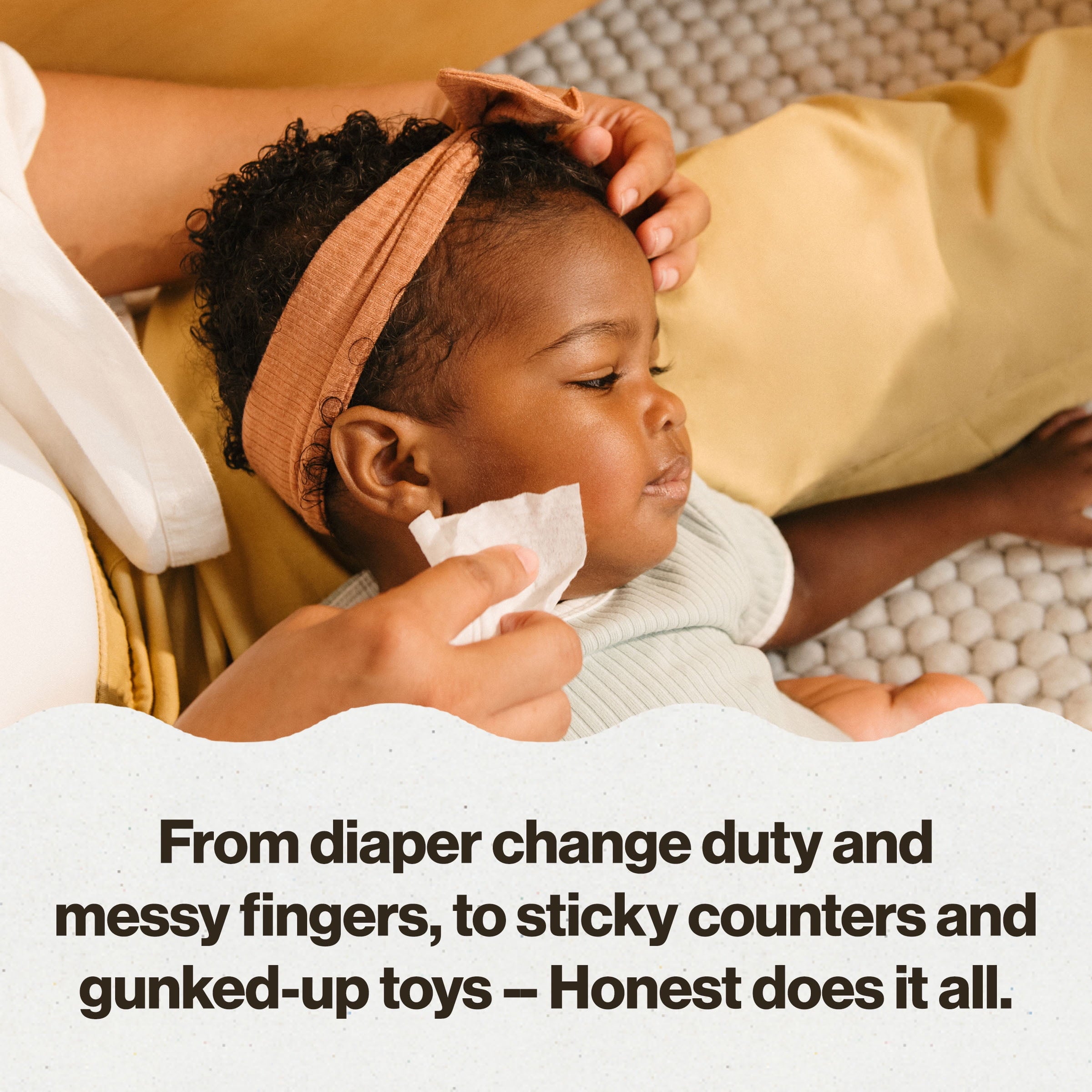 Looking for the best baby wipes for your little one? From diaper change duty and messy fingers, to sticky counters and gunked-up toys — our ultra durable, extra thick Honest wet wipes get the job done! These hypoallergenic plant-based wipes are dermatologist-tested and are made with only 7 transparent ingredients that are toxicologist-audited, making them safe + gentle for baby and the whole family. Wipes made without plastic, fragrances, parabens, and chlorine processing – containing everything you need and nothing you don’t. The convenient flip-top dispenser makes our super-thick, super-soft baby wipes perfect for home or your diaper bag. Now Compostable! Honest Baby Wipes disintegrate in 8 weeks:** Faster than a Melon Peel** Just as fast as a Grapefruit Peel and an Onion** For municipal: Always check for the availability and acceptance of municipal/institutional composting facilities as they may be limited in your area. For home: Do not compost if wipes are used to clean non-compostable items like human/animal waste or mixed with cleaning soaps/sprays. Generally, wipes shouldn't be more than 10% of your compost heap. *Suitable for municipal or home-composting conditions. **Following Modified ISO 20200 standards to assess disintegration under home composting conditions. 648 Wipes