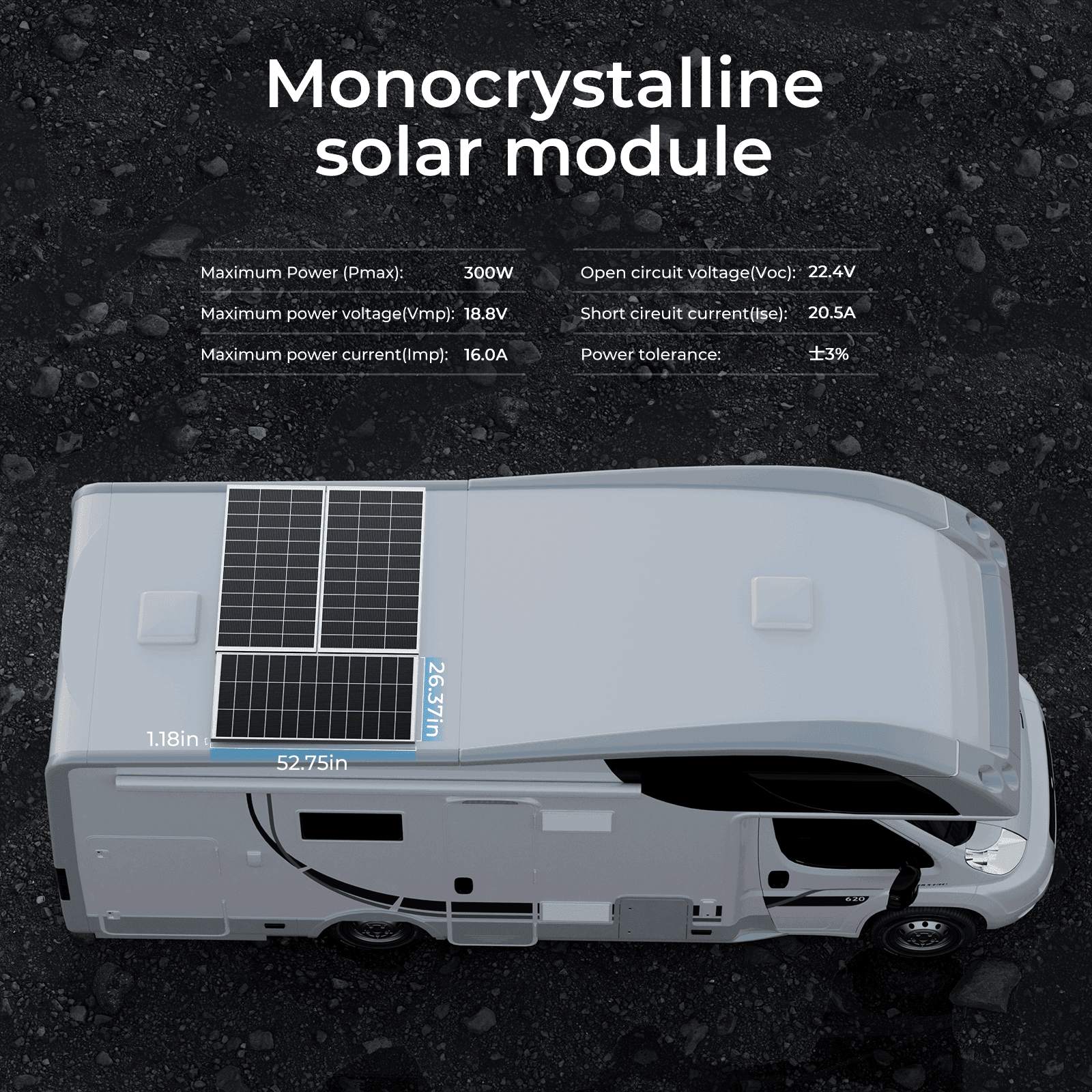 300W SOLAR PANEL Maximum Power (Pmax): 300W Maximum power voltage(Vmp): 18.8V Maximum power current(Imp): 16.0A Open circuit voltage(Voc): 22.4V Short cireuit current(Ise): 20.5A Power tolerance: ±3% Size: 1340*670*30mm/52.75*26.37*1.18in