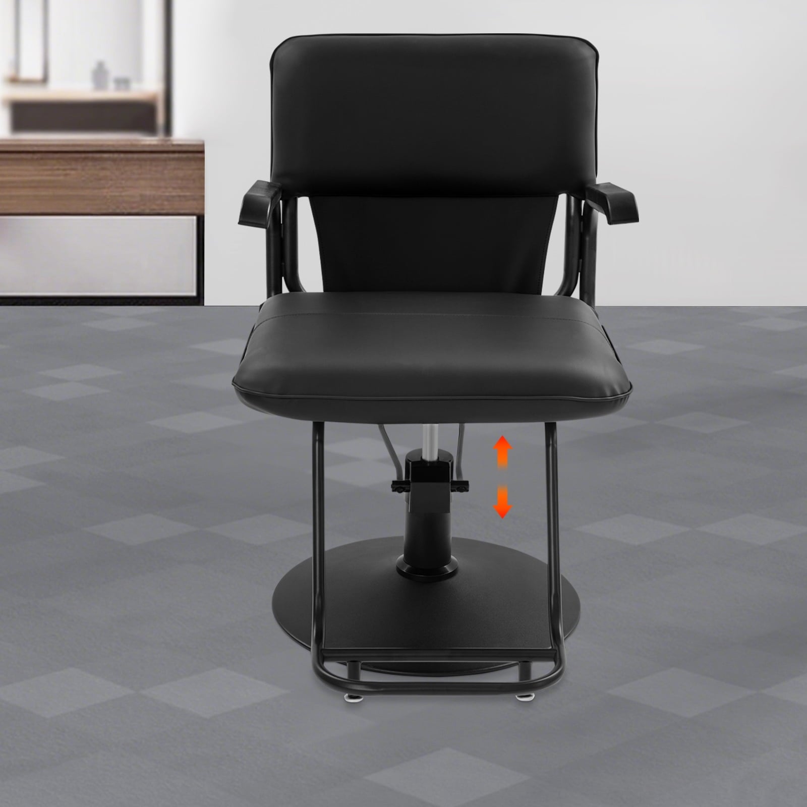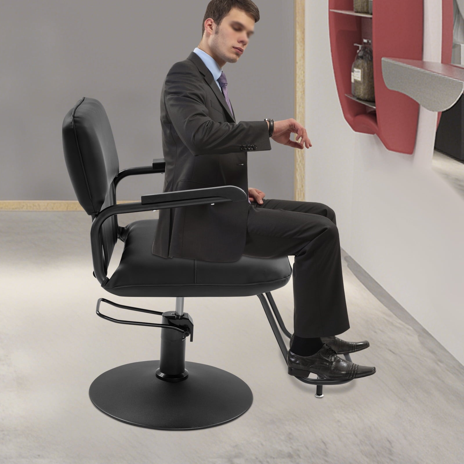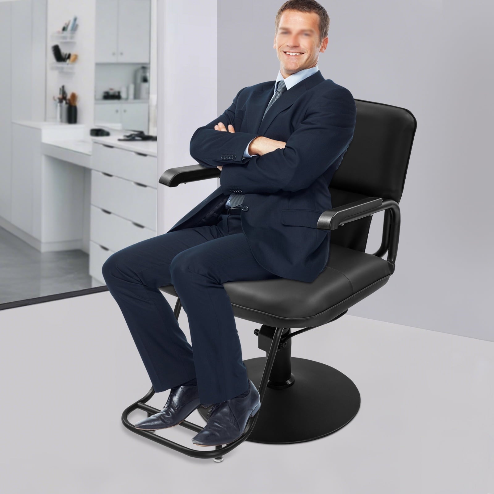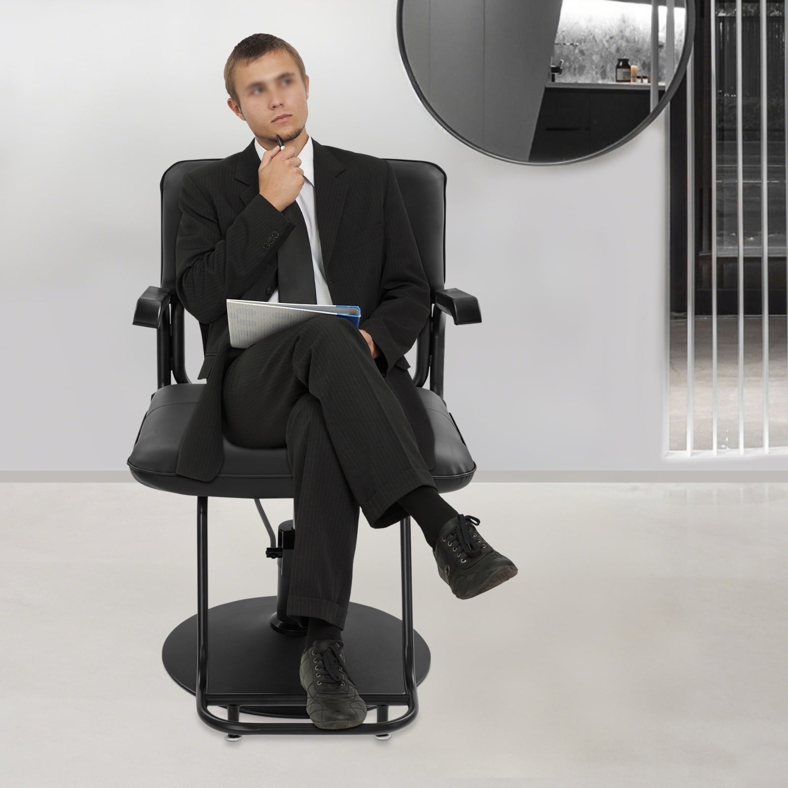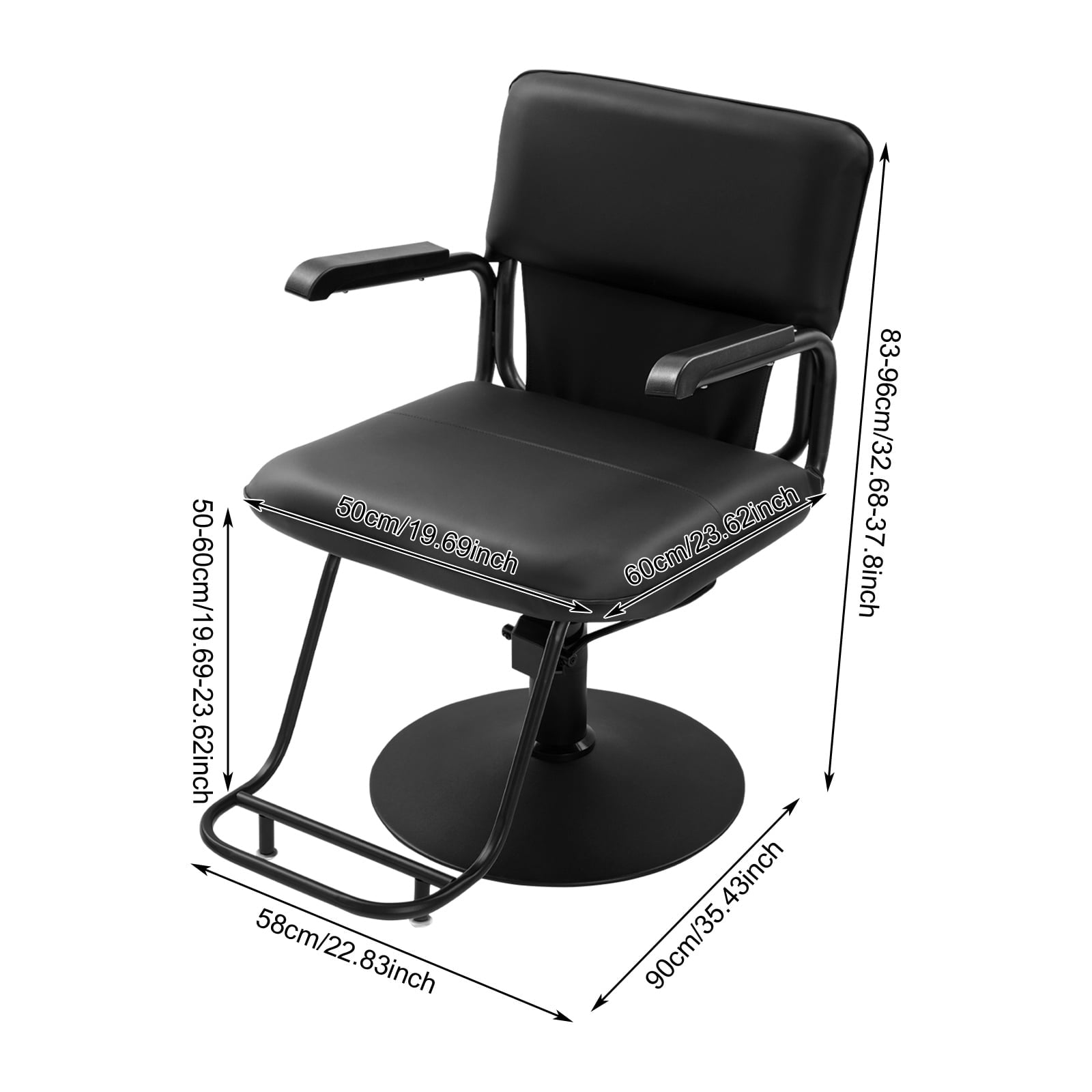 Description Our barber chair comes with a flexible height adjustment function, allowing you to adjust it according to different work and usage needs, making your use more convenient and comfortable. Its design cleverly integrates ergonomic principles, allowing your clients to sit for long periods without getting tired. The stable base and excellent materials guarantee long-term durability, making it an ideal choice for modern beauty and hairdressing chairs. Key Features Strong Load-Bearing Capacity: The thick hydraulic pump, firm stainless steel frame, and sturdy construction allow it to hold up to 551.16 lbs, so you can sit on it with confidence! Adjustable Design: You can adjust its seat height(19.69-23.62in) with the lever, as well as rotate it 360° for more comfortable sitting and flexible use to meet the various needs of customers. Comfortable Experience: This product uses a high-elasticity sponge, which can effectively rebound, and the armrests and the backrest conform to the ergonomic curve, closely fitting the arm, waist, and back, making people sit for a long time without fatigue. Details Wide Seat Surface: The 19.69*23.62 inch seat surface can reduce the sense of restraint, making people more relaxed and comfortable. Sturdy Base: The thick circular base enlarges the contact area with the ground for higher stability and excellent load capacity. Application This product is suitable for homes, beauty salons, nail salons, barber shops, hair salons, shopping malls, etc. It can be used for haircuts, facials, and more! Specifications Color: Black Style: Modern Material: Stainless Steel, PU, Sponge Process: Electroplating Mounting Type: Floor Standing Assembly Required: Yes 360° Rotation: Yes Load-bearing Capacity: About 250kg/551.16 lbs Total Adjustable Height: 83-96cm/32.68-37.8in Adjustable Seat Height: 50-60cm/19.69-23.62in Seat Size(L*W): 50*60cm/19.69*23.62in Base Size(L*W): 58*90cm/22.83*35.43in Package Size: 60*58*56.5cm/23.62*22.83*22.24in Gross Weight: 20kg/44.09lbs Net Weight: 19kg/41.89 lbs Package Included 1* Barber Chair Other Accessories for Assembly Notes 1. Please check the size carefully before ordering. 2. Please use the product within its weight capacity to avoid damage.
