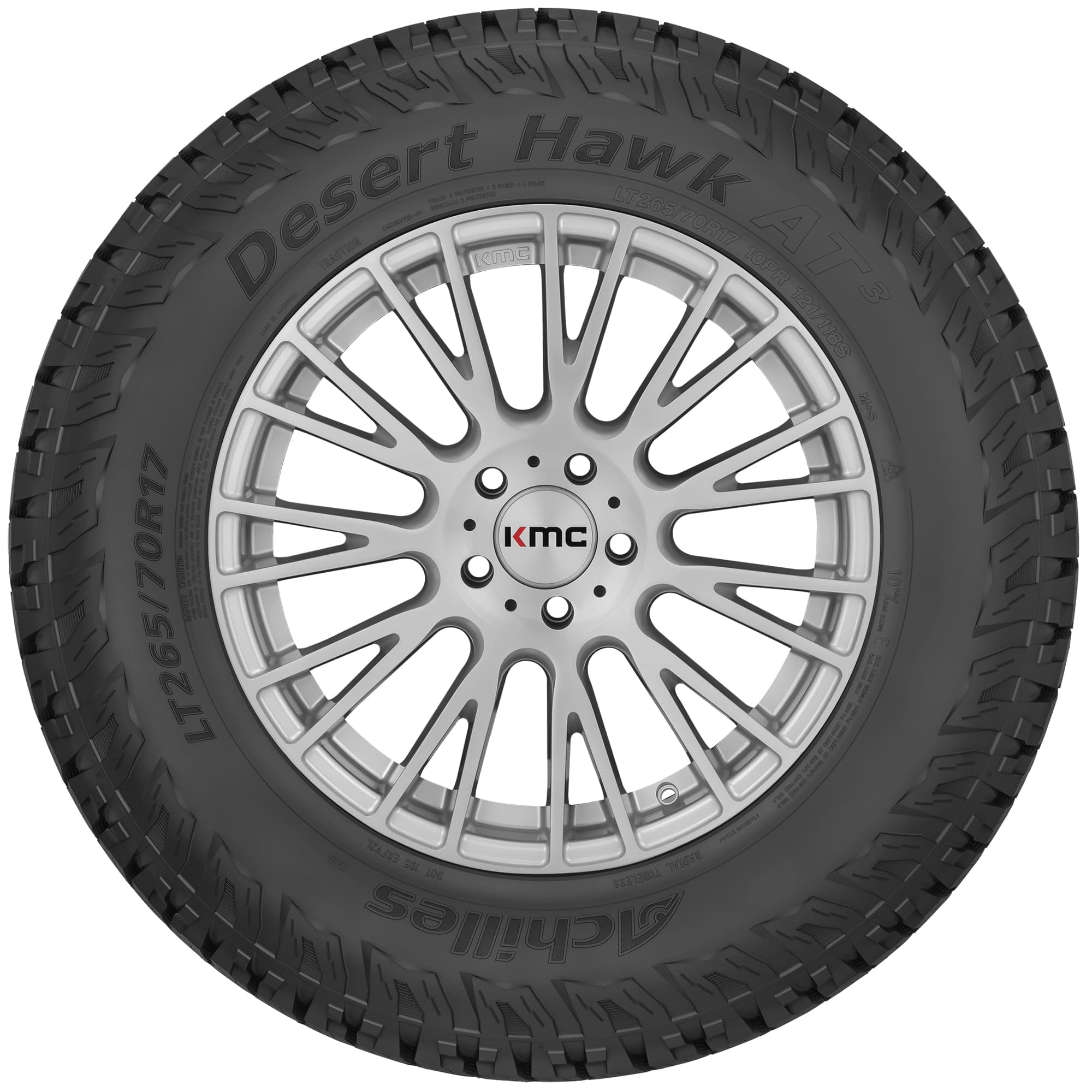 Achilles Desert Hawk AT3 LT265/70R17 121/118S E OVERVIEW The Achilles Desert Hawk AT3 is an all-terrain tire that is designed for use on light trucks. With an aggressive tread pattern, the Desert Hawk AT3 ensures outstanding traction and stability on various surfaces, from loose sand and gravel to muddy trails, without compromising comfort on the highway. In addition, the Desert Hawk AT3 has a robust construction with reinforced sidewalls that provide extra protection against punctures and abrasions in harsh off-road conditions.