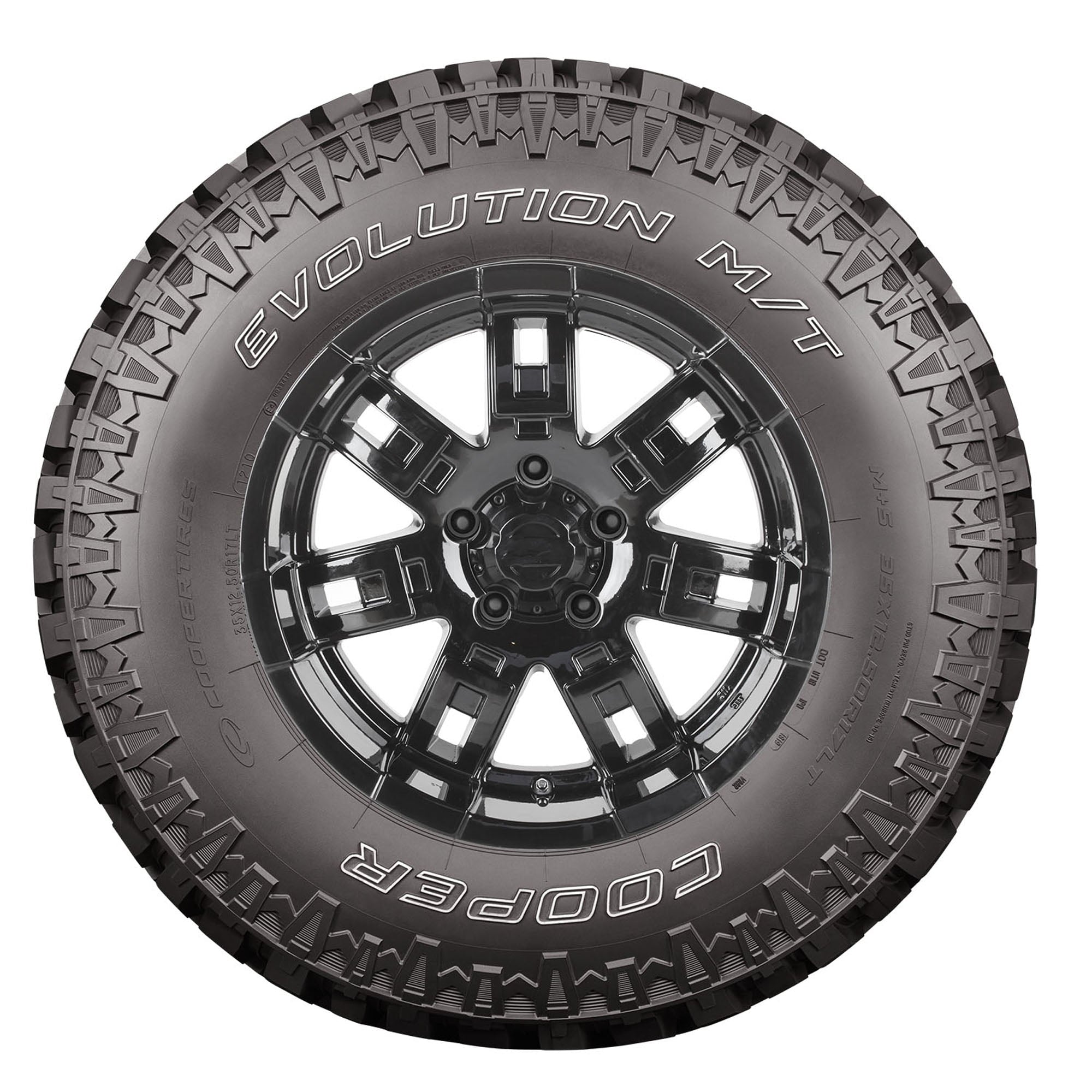 Cooper Evolution M/T LT285/70R17 121/118Q E OVERVIEW When the road ends and the mud begins, the Cooper Evolution M/T tire is engineered to get light trucks and SUVs through it with confidence. The Evolution M/T's mud-terrain tread pattern features oversize lugs and Cooper's Mud Slingers to eject rocks and mud, while a reinforced sidewall and innovative shoulder design provide lateral traction . Additionally, the Evolution M/T is M+S rated for mud and snow traction.