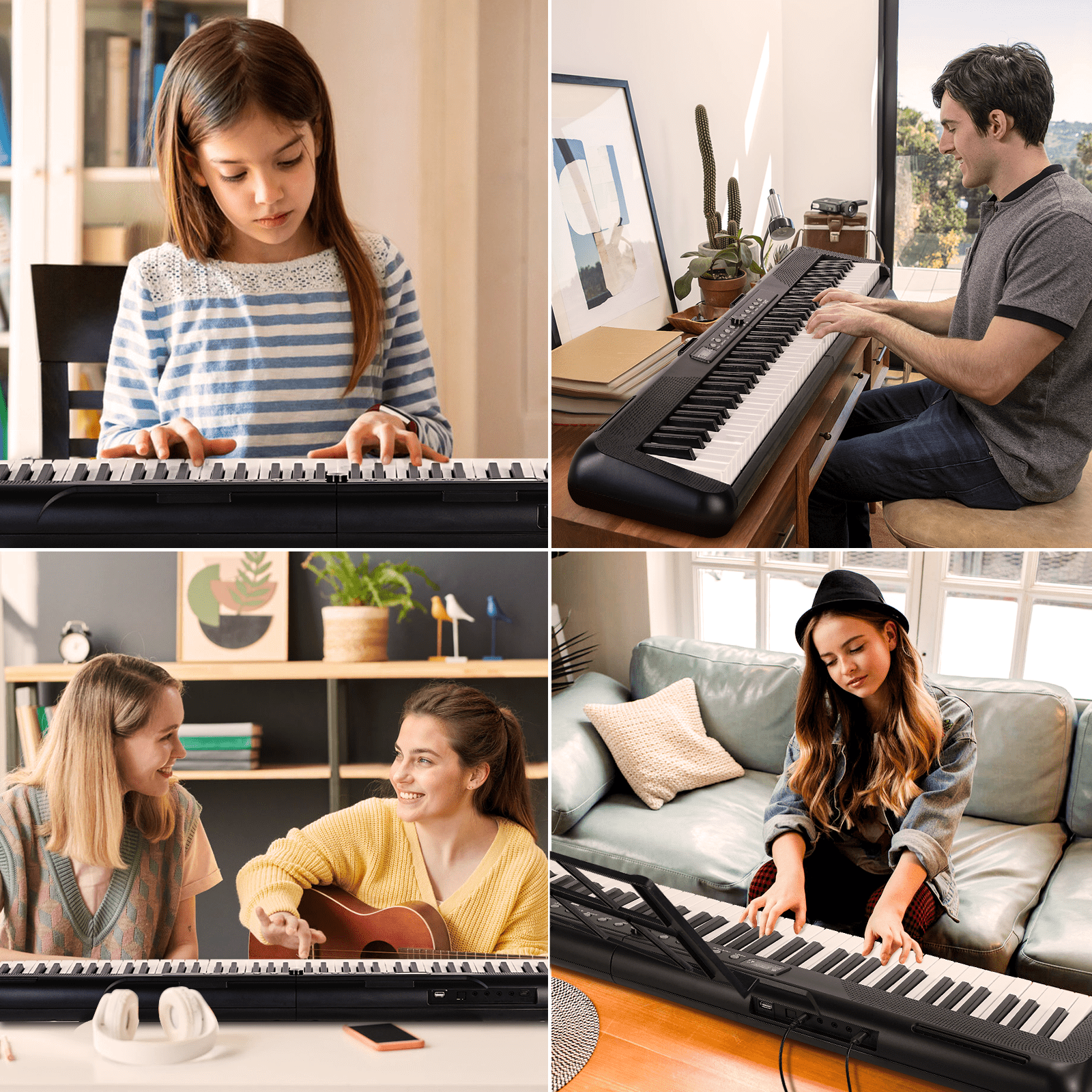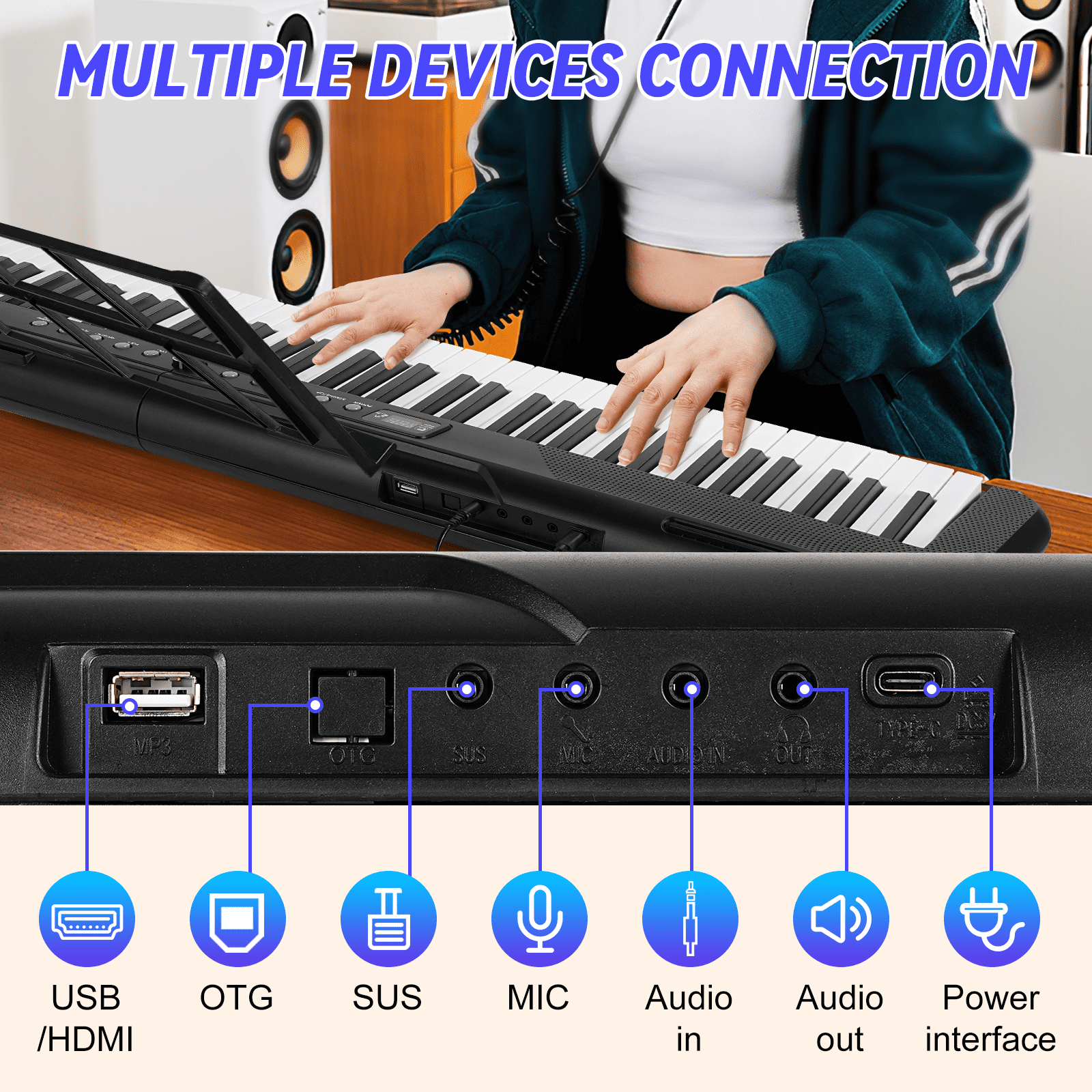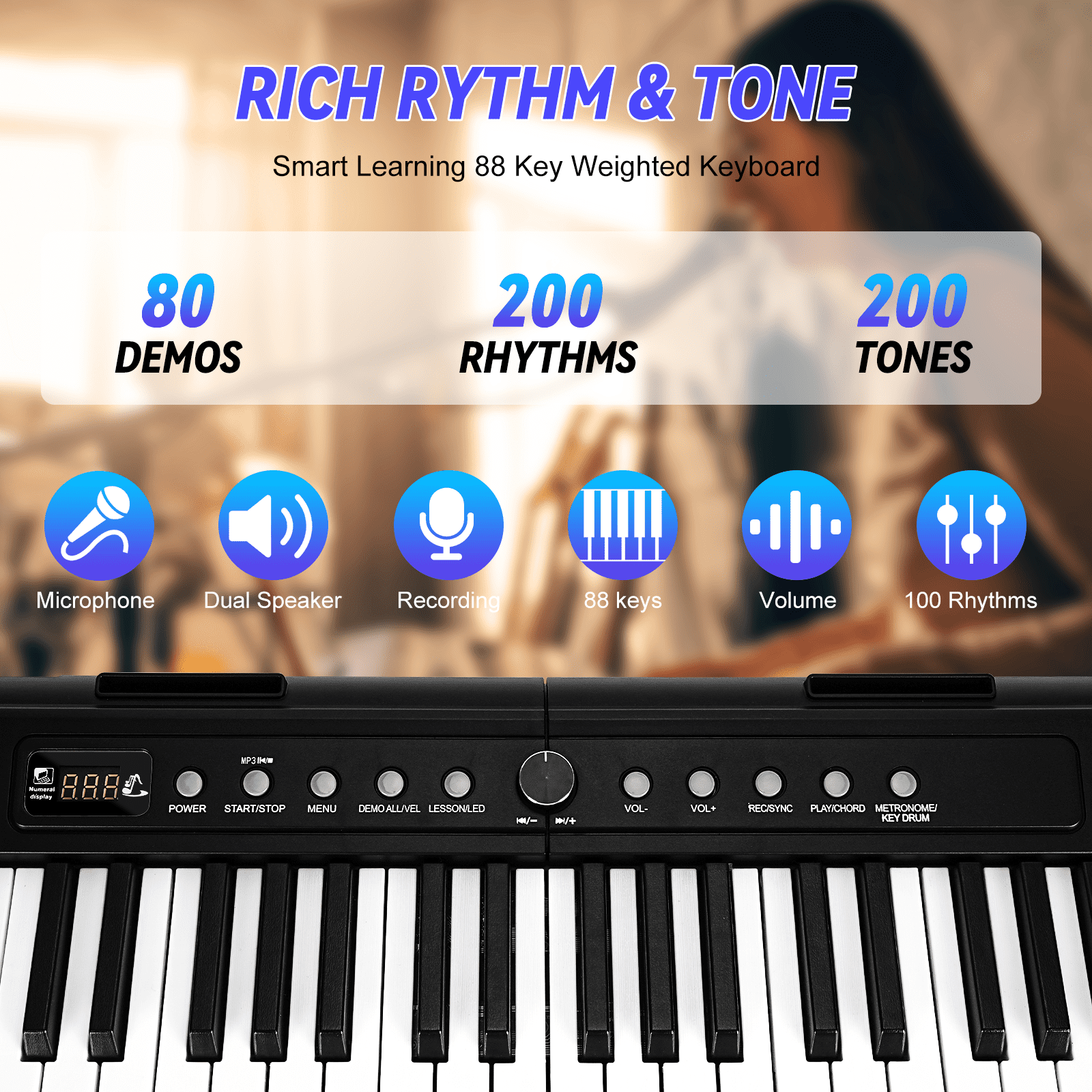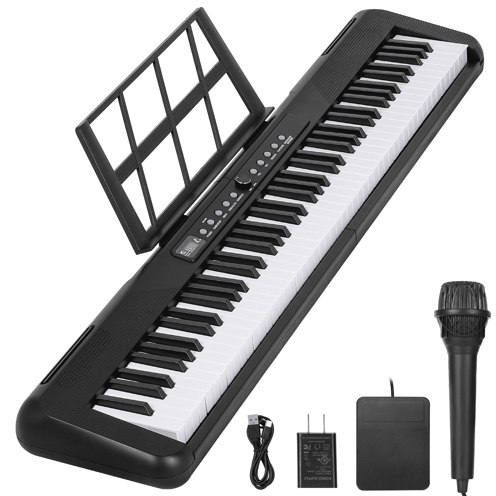 This Electric Keyboard Piano Is A Full Size Keyboard Pianos That Allows You To Explore A World Of Music. Music Is The Art Of Life. Music Allows You To Speak From The Heart In A Language Everyone Can Understand. Whatever Your Age Or Skill Level, It Make Sure All Your Musical Desires Are Fulfilled. 200 Rhythms +200 Tones +80 Demonstration Songs And Dual Keyboard Function, Satisfying Various Styles Of Performance, Nice For Teaching And Practice. Midi Function This Electric Piano Supports The Midi Function, Which Can Connect To The Computer Or Other External Devices For Music Editing Or Recording. High Quality Sound Built In Double Stereo Speakers In Electronic Keyboard, Quality Sound Help You Create The Songs More Professionally. Learn Quickly Supports Wireless Bluetooth Connection To The Piano Practice Software And Turn On The Keyboard Light Function Key, Making Learning Easy And Fun For Beginners And Kids. Great Value Bundle: Piano Score Music Stand Microphone Audio Line Power Cable Piano Key Stickers Sustain Pedal Instruction