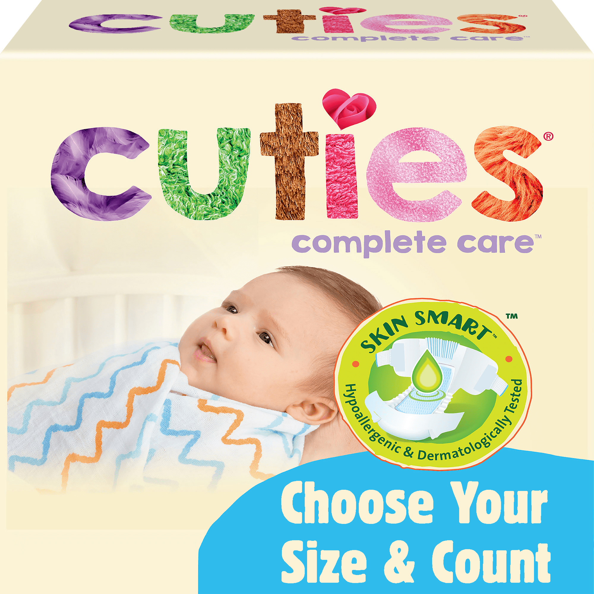 Cuties is a new generation of baby care for a new generation of parents. Cuties Complete Care Baby Diapers have five layers of super soft protection and a super snug fit. It's Complete Care for your baby's sensitive skin. The Gentle Hypoallergenic Liner is dermatologically tested and super soft. The pH Balanced Absorbent Core works super hard to help keep your baby's bottom all kinds of dry, for up to 12 hours of leakage protection. And the High Performance Core Wrap keeps everything nice and snug. Like it should be. All of Cuties Complete Care products are backed by Our SkinSmart Promise To You. That means every decision Cuties makes is designed to help protect the health of your baby's sensitive skin. Cuties diapers undergo extensive research, testing and retesting before they are sent to your door. Advanced Quality Assurance vision systems monitor the quality of all products 24/7. After all, your cuties delicate skin deserves the most complete care.