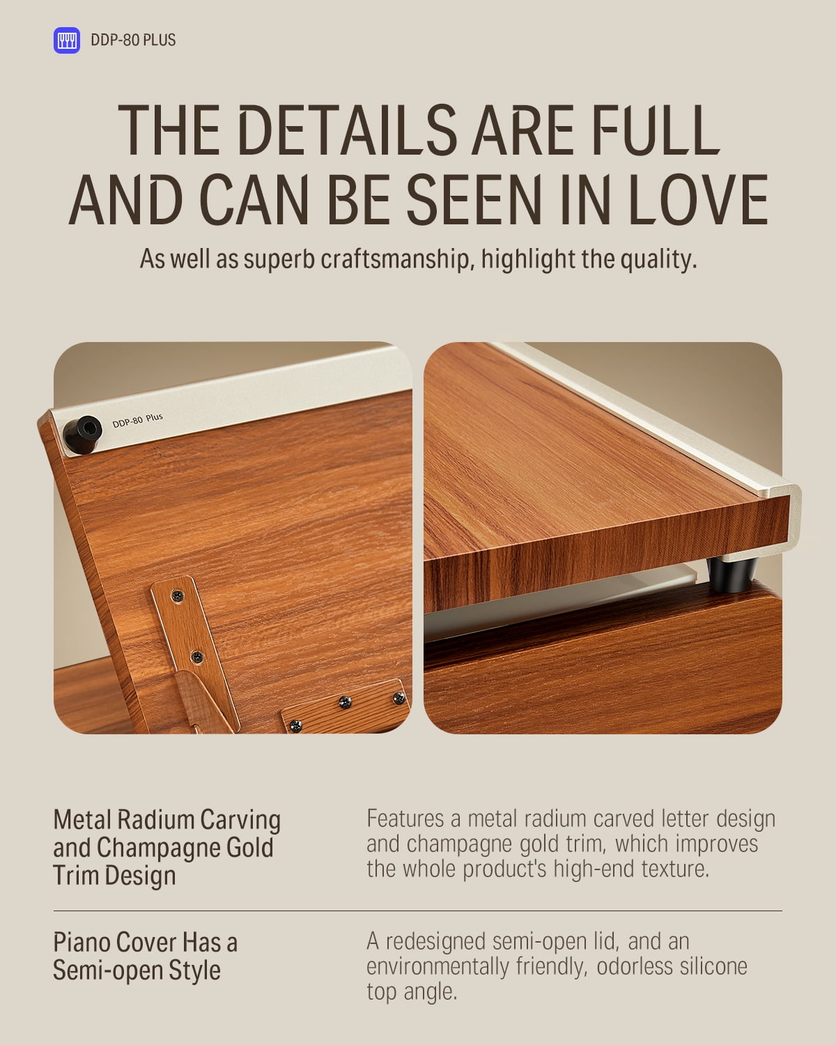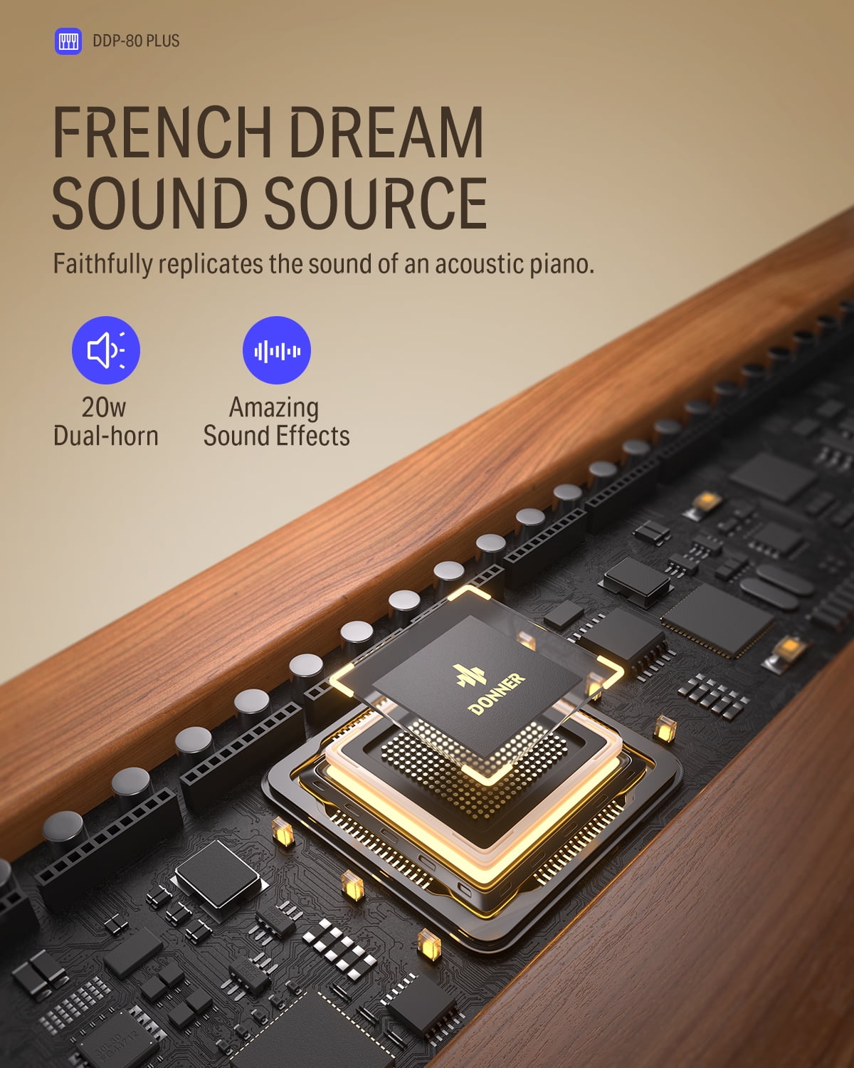 ♫Click Here to buy the 【Donner Piano Classic Collection】 ABOUT DONNER Since 2012, Donner has been committed to creating new experiences in music performance. As a pioneer of the digital piano keyboard, DONNER brings the joy of musical performance to various people from all over the world. Relying on a strong and efficient R&D team, DONNER has gradually become famous for its high-quality and affordable musical instruments and accessories. Difference Between DDP-80 PLUS & DDP-80 DDP-80 PLUS with a semi-open style piano cover which can reduce falling ash on keyboard keys and protect the keys. More Upgraded Details About DDP-80 PLUS Artistry Piano The square metal support and leg tilt Angle adjustment of DDP-80 PLUS is firmer and reduce the feeling of being top-heavy. Give You A More Comfortable Playing Experience! The upgraded detachable pedal baffle not only simplifies installation and removal but also solves common pedal slippage problems in other pian 80-Plus Features 88-key progressive weighted keyboard mimics the feel of a grand piano. French high-quality DREAM sound source faithfully replicates the sound of an acoustic piano. A more sensitive musical expression is delivered by the metal pedals. Metal radium carving and champagne gold trim design with sophisticated texture showcase an elegant temperament. The piano cover has a semi-open style to ensure quiet closing. The piano is suitable for both beginner and professional.