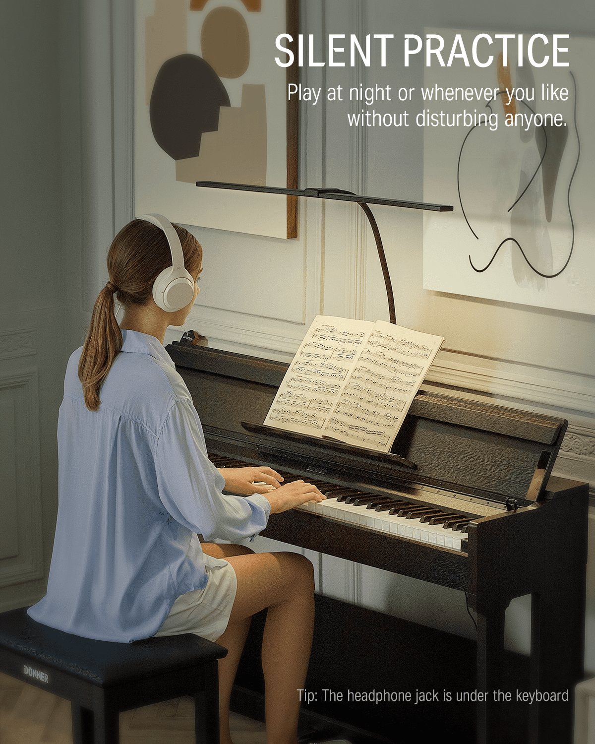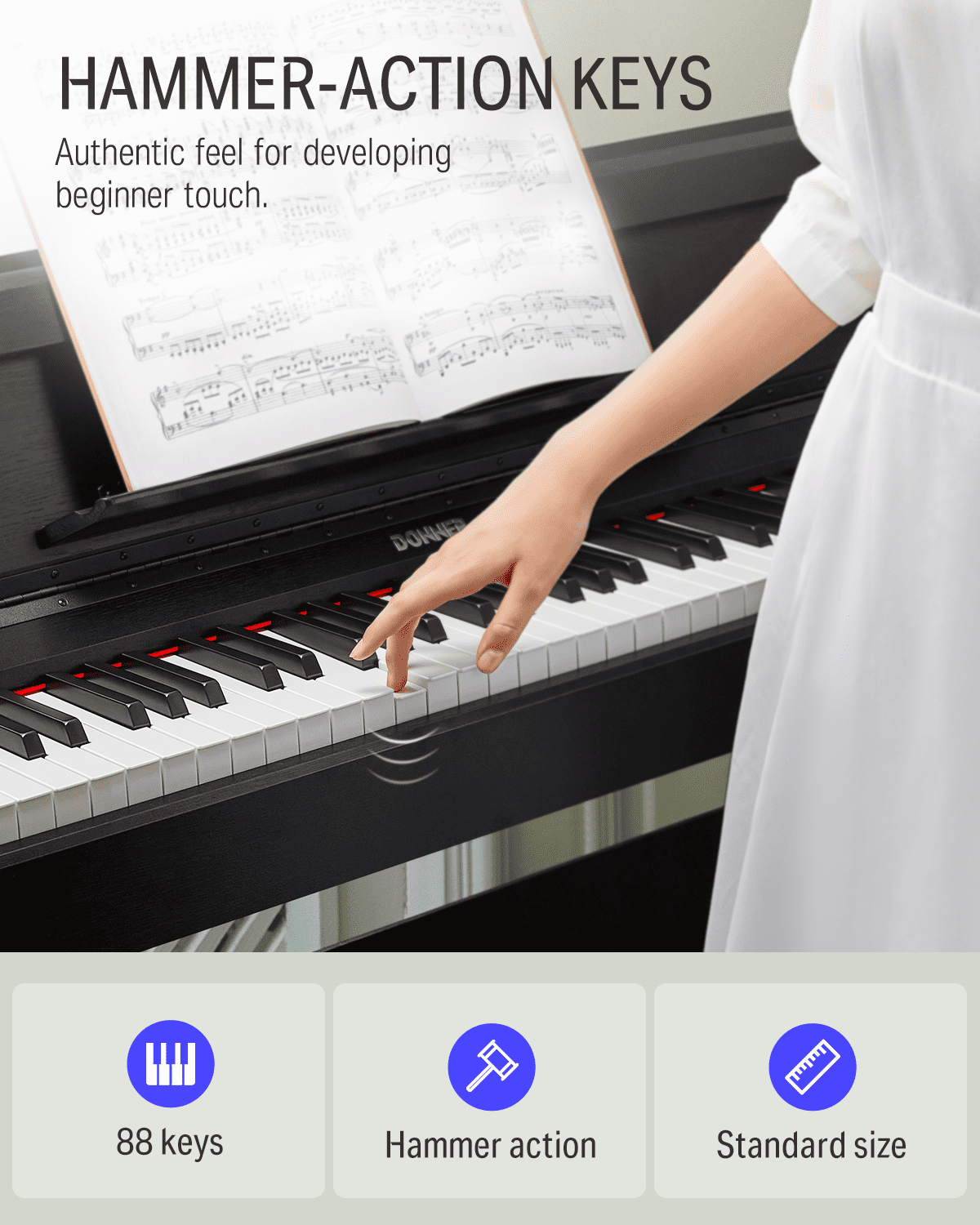 ♫Click Here to buy the 【Donner Piano Classic Collection】 Ideal First Digital Piano For Modern Living Space A contemporary and compact design Perfect for smaller apartments or home Perfect for piano learners Hammer Action Weighted Keyboard Features 88 full-sized responsive weighted keys Hammer action and ivory-feel texture Dynamic and Rich Sound Sound samples from real acoustic grand pianos Testing and adjusting the details of timbre repeatedly 128 polyphony meet fast trills playing Metal triple-pedal system ensures the quality of your playing Smaller Size, Compact Home Use Smaller and lighter than the normal piano without infect sound quality Designed for compact family room A slow closing function to protect your hands and keyboard Headphone mode is very suitable for beginners to practice piano late at night Multiple Device Connecting Come with USB-MP3 playing(built-in amplifier) PC/Laptop/Tablet/Smartphone USB MIDI concecting (for music app using and music recording) External sound support (need to connect to external speakers) Headphone using(the headphone jack is at the bottom left of the electric piano) Input AC: 100V-240V, Output DC: 12 3A, Adapter Transformer DC: 5.5mm x 2.2mm Ultimate Experience of Sound A meticulously-designed appearance A more delicate tonal character to express musical details and emotions