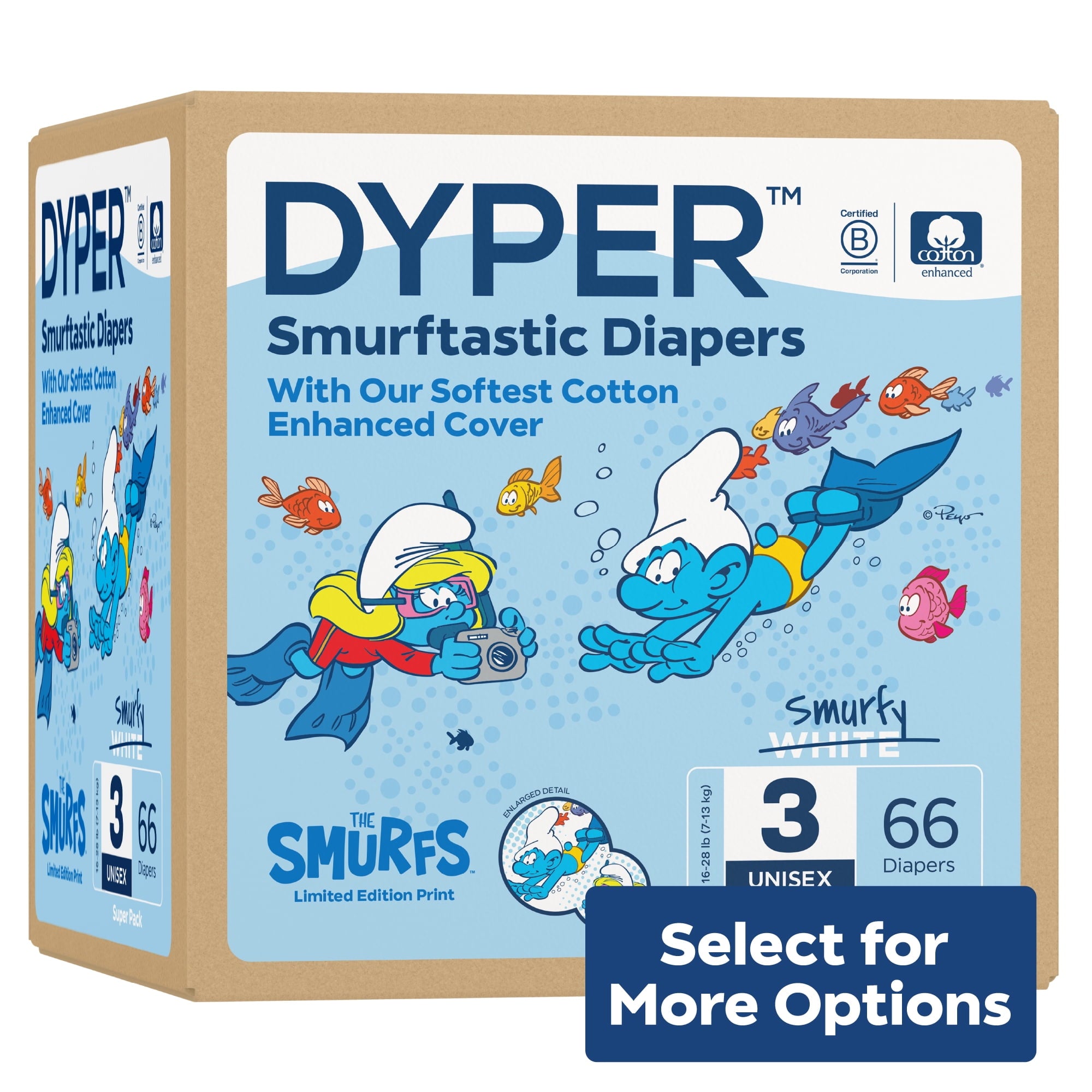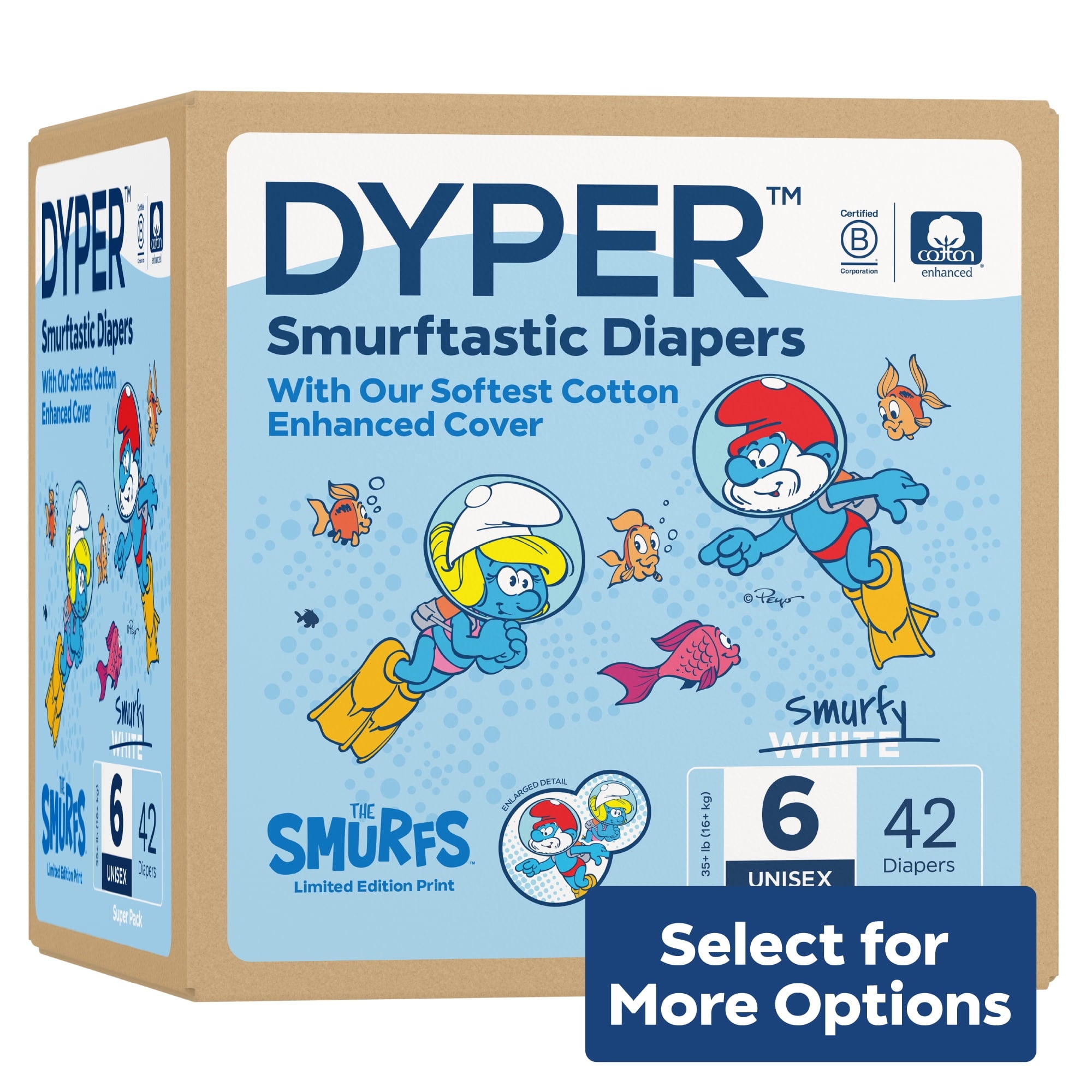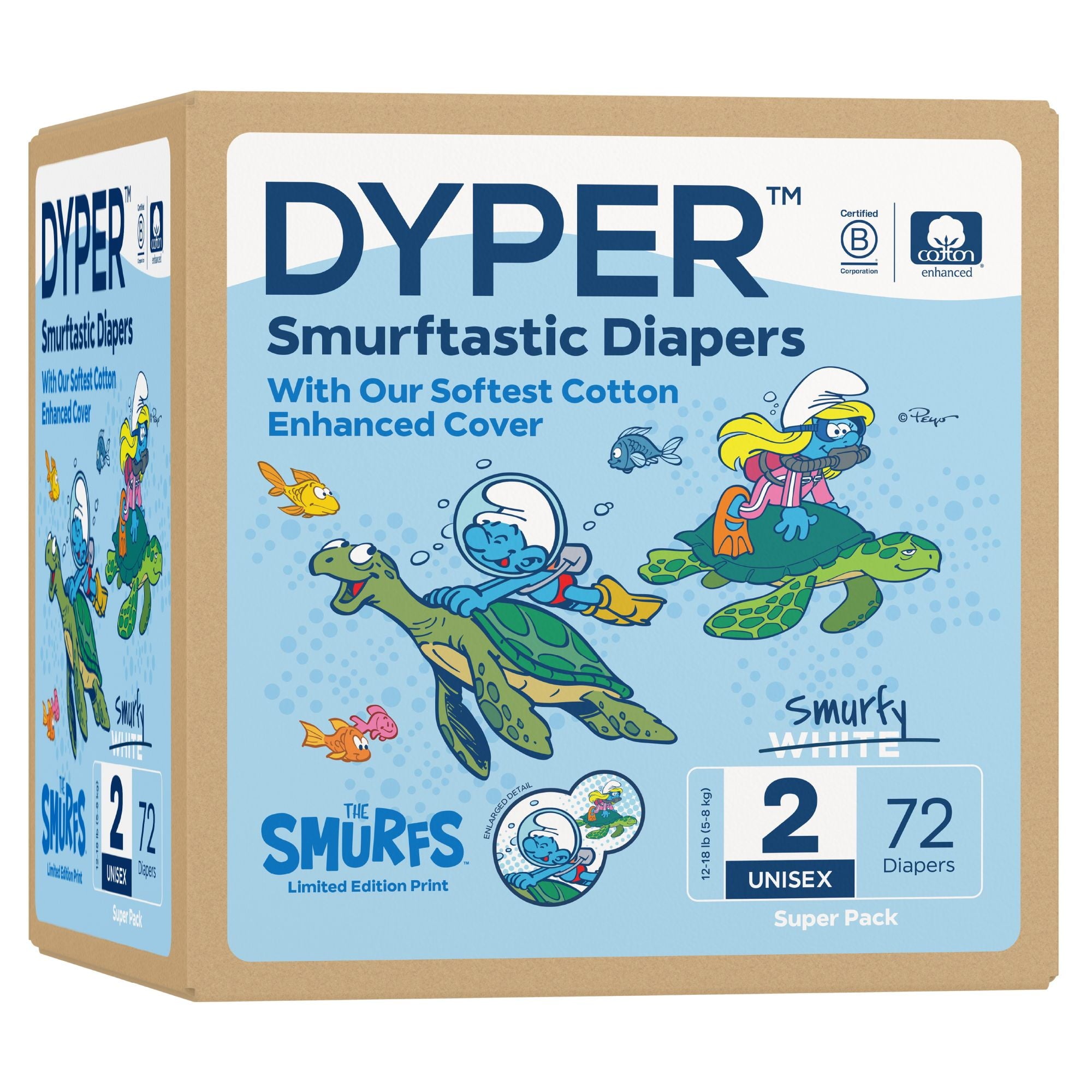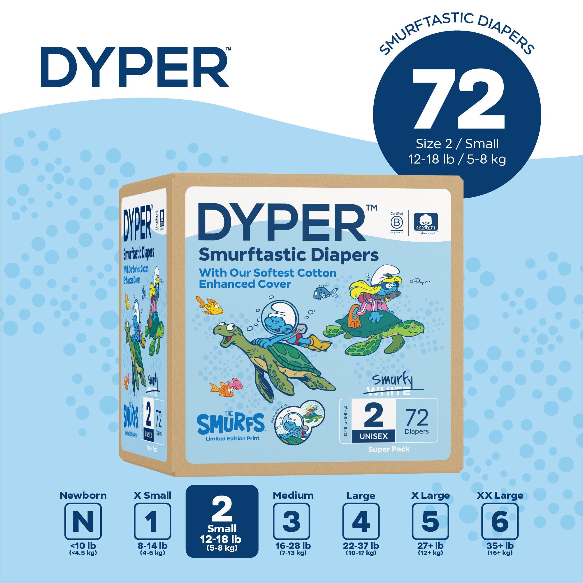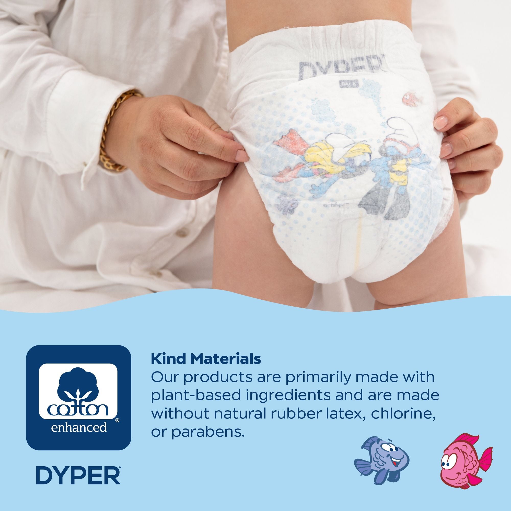 Diapers That Perform Experience our remarkably soft, ultra absorbent, Smurfs™ limited edition diapers, carefully crafted for delicate baby skin and made with an incredibly soft cotton-enhanced cover. Featuring adorable Smurf character prints unique to each size, our diapers are dermatologically tested and hypoallergenic, ensuring utmost skin safety. Soft to the touch, highly absorbent, and thoughtfully made with honest, gentle ingredients, they provide a snug, almost underwear-like, stretchy fit for premium comfort and maximum mobility. Made without lotions, parabens, and fragrances. Clinically tested by DermaTest® and awarded their highest 5-star rating by dermatologists, ensuring superior quality and skin-friendliness. Ideal for overnight protection and potty training boys and girls. Our diapers are the parent's choice because they are made without chlorine, latex, alcohol, TBT, parabens, and phthalates. They are unscented and gentle on baby's delicate skin. Each purchase of Smurfs™ Limited Edition Diapers funds the recovery of the equivalent of two plastic bottles from the ocean, verified by rePurpose Global. Ultimate Comfort and Dryness Our Cotton-enhanced cover is exceptionally soft against your little one's delicate skin, while the highly absorbent core keeps them dry and cozy throughout the day and night. Dermatologist-Approved Skin Safety Your baby's skin health is our top priority. Our diapers are dermatologically tested and hypoallergenic, ensuring utmost skin safety. They are made without harsh lotions, parabens, and fragrances. Clinically tested by DermaTest® and awarded their highest 5-star rating by dermatologists, you can trust that these diapers are gentle and kind to your little one's skin. Superior, Snug, Stretchy Fit Snug, almost underwear-like stretchy fit provides premium comfort and maximum mobility for your active baby during potty training and overnight protection. The stretchy material cradles their body gently, allowing for unrestricted movement and play, while the snug fit prevents leaks and keeps them feeling dry and secure. About DYPER DYPER, a Certified B Corp, is the responsible diaper company that cares for your baby and their planet. DYPER takes this pledge seriously and strives to be kind with each material selection, partner choice, and customer interaction. Kind Business: Proudly B Corp Certified means the highest standards of independently verified performance, accountability, environmental stewardship, and transparency are met. Kind Materials: Products are designed to prioritize plant-based ingredients and are made without harmful chemicals. Training Pants are DermaTest® 5-star clinically tested for skin compatibility. Kind Sourcing: Wood pulp is sourced from responsibly managed forests, and the supply chain is independently audited. #DYPER