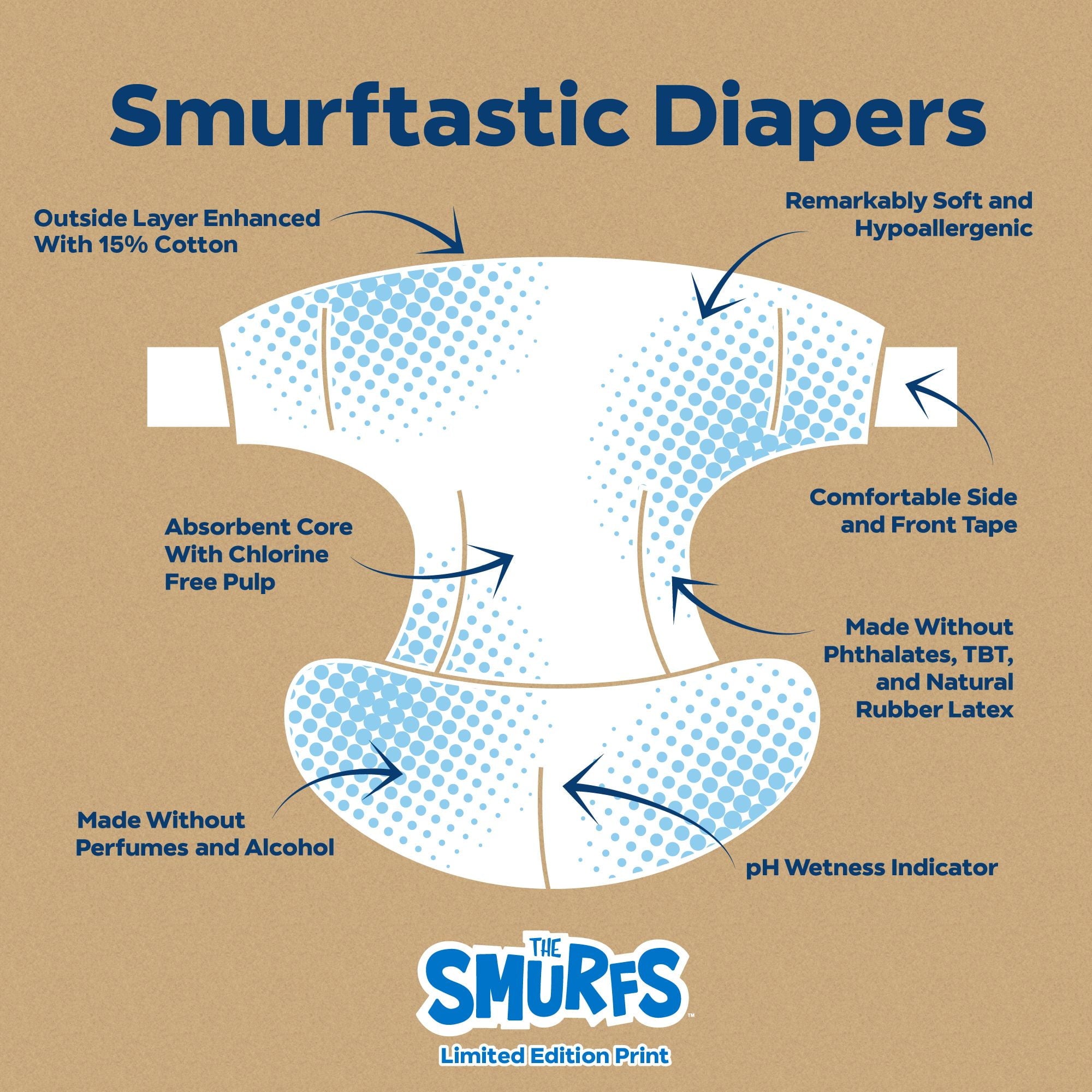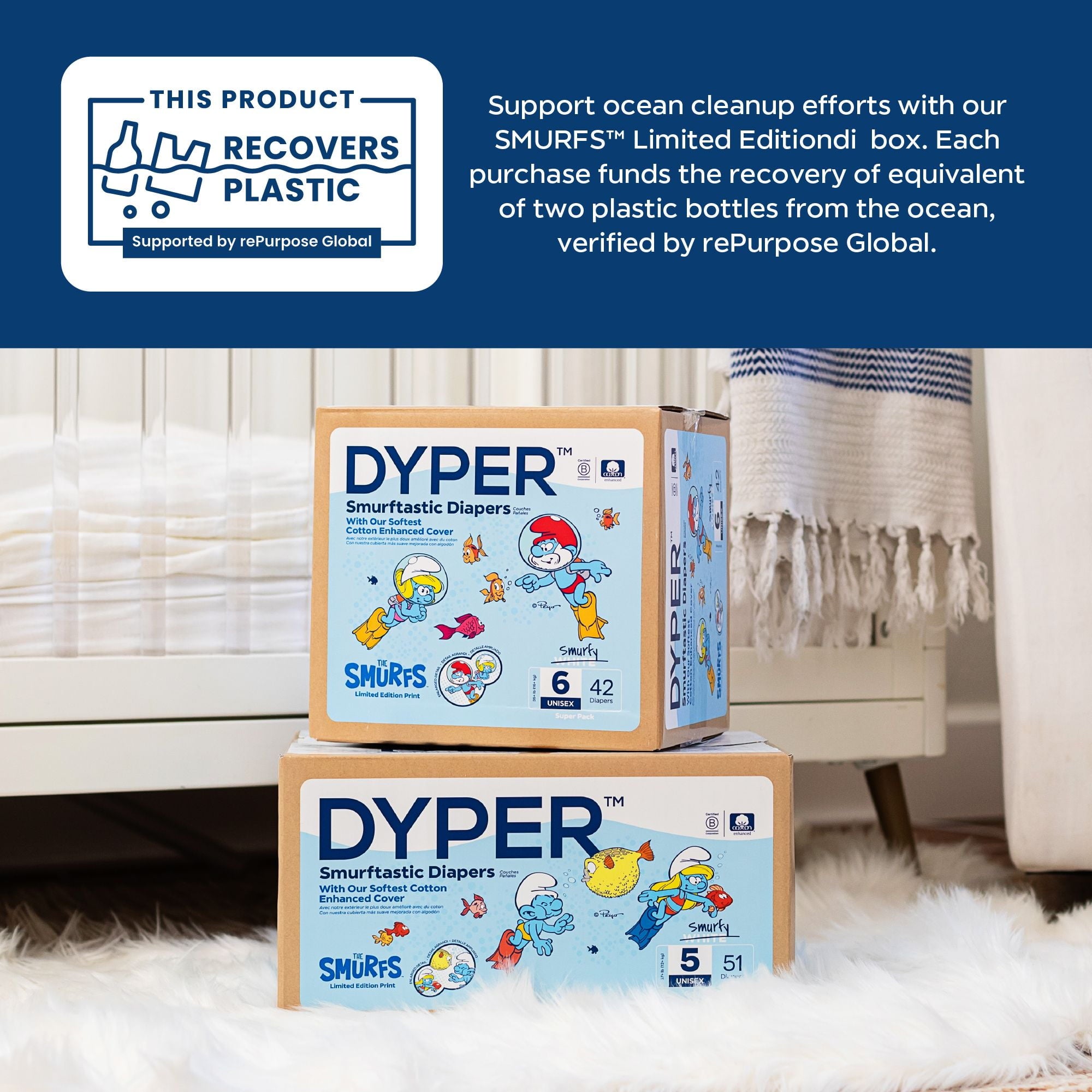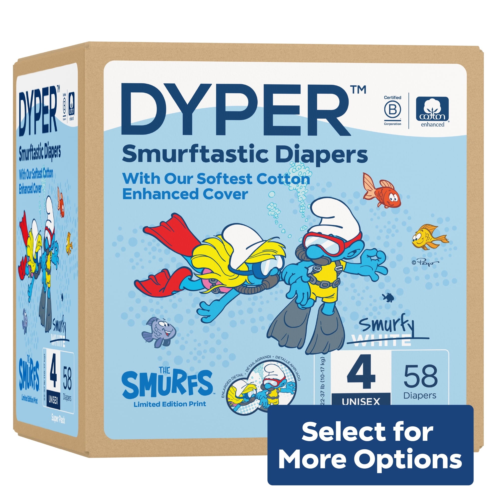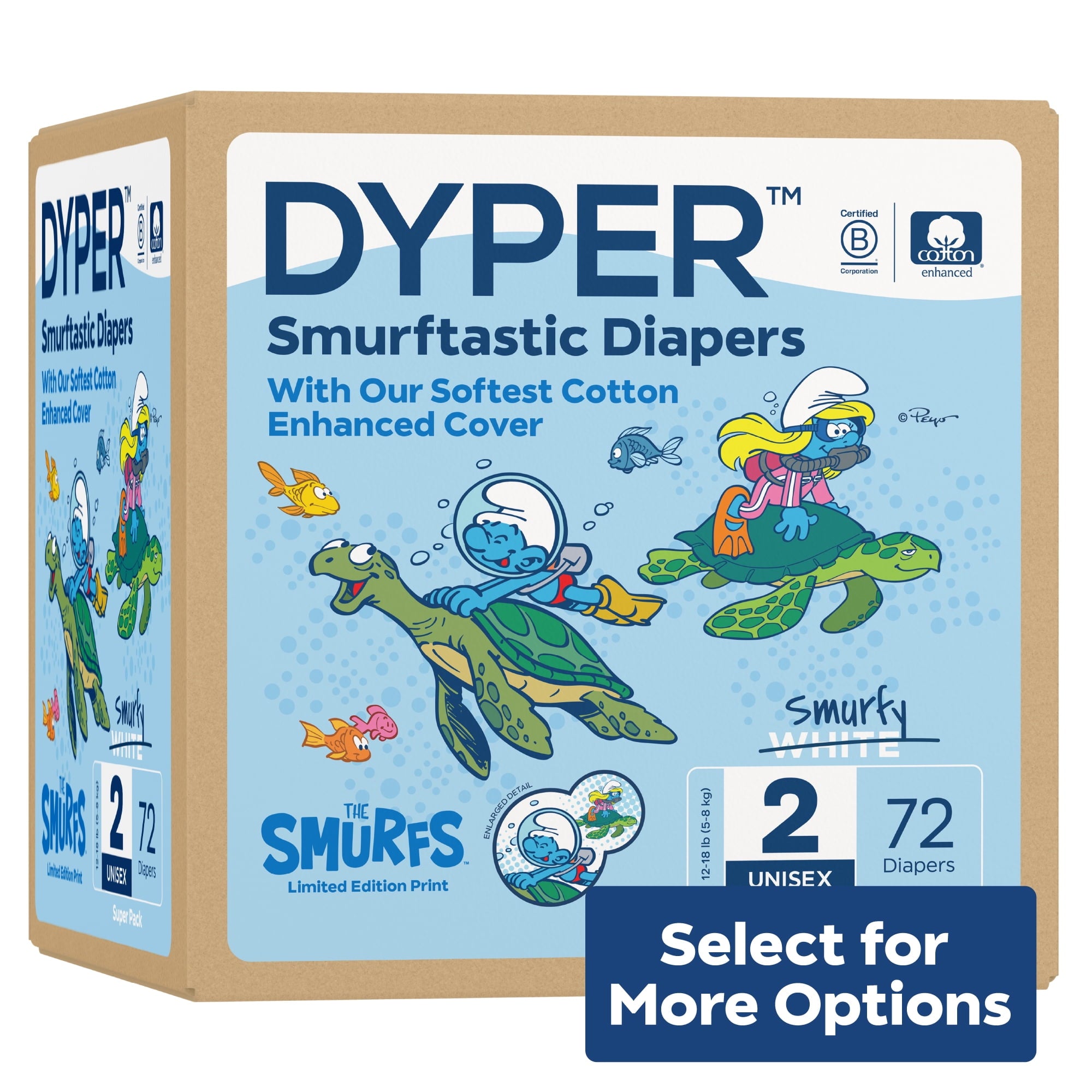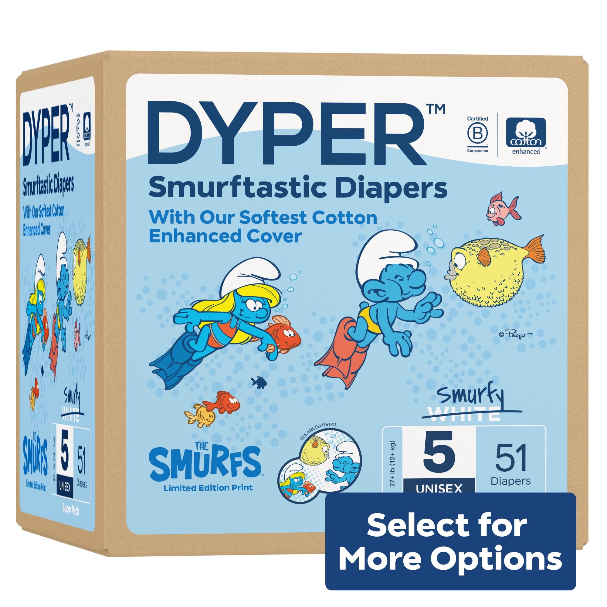 Diapers That Perform Experience our remarkably soft, ultra absorbent, Smurfs™ limited edition diapers, carefully crafted for delicate baby skin and made with an incredibly soft cotton-enhanced cover. Featuring adorable Smurf character prints unique to each size, our diapers are dermatologically tested and hypoallergenic, ensuring utmost skin safety. Soft to the touch, highly absorbent, and thoughtfully made with honest, gentle ingredients, they provide a snug, almost underwear-like, stretchy fit for premium comfort and maximum mobility. Made without lotions, parabens, and fragrances. Clinically tested by DermaTest® and awarded their highest 5-star rating by dermatologists, ensuring superior quality and skin-friendliness. Ideal for overnight protection and potty training boys and girls. Our diapers are the parent's choice because they are made without chlorine, latex, alcohol, TBT, parabens, and phthalates. They are unscented and gentle on baby's delicate skin. Each purchase of Smurfs™ Limited Edition Diapers funds the recovery of the equivalent of two plastic bottles from the ocean, verified by rePurpose Global. Ultimate Comfort and Dryness Our Cotton-enhanced cover is exceptionally soft against your little one's delicate skin, while the highly absorbent core keeps them dry and cozy throughout the day and night. Dermatologist-Approved Skin Safety Your baby's skin health is our top priority. Our diapers are dermatologically tested and hypoallergenic, ensuring utmost skin safety. They are made without harsh lotions, parabens, and fragrances. Clinically tested by DermaTest® and awarded their highest 5-star rating by dermatologists, you can trust that these diapers are gentle and kind to your little one's skin. Superior, Snug, Stretchy Fit Snug, almost underwear-like stretchy fit provides premium comfort and maximum mobility for your active baby during potty training and overnight protection. The stretchy material cradles their body gently, allowing for unrestricted movement and play, while the snug fit prevents leaks and keeps them feeling dry and secure. About DYPER DYPER, a Certified B Corp, is the responsible diaper company that cares for your baby and their planet. DYPER takes this pledge seriously and strives to be kind with each material selection, partner choice, and customer interaction. Kind Business: Proudly B Corp Certified means the highest standards of independently verified performance, accountability, environmental stewardship, and transparency are met. Kind Materials: Products are designed to prioritize plant-based ingredients and are made without harmful chemicals. Training Pants are DermaTest® 5-star clinically tested for skin compatibility. Kind Sourcing: Wood pulp is sourced from responsibly managed forests, and the supply chain is independently audited. #DYPER