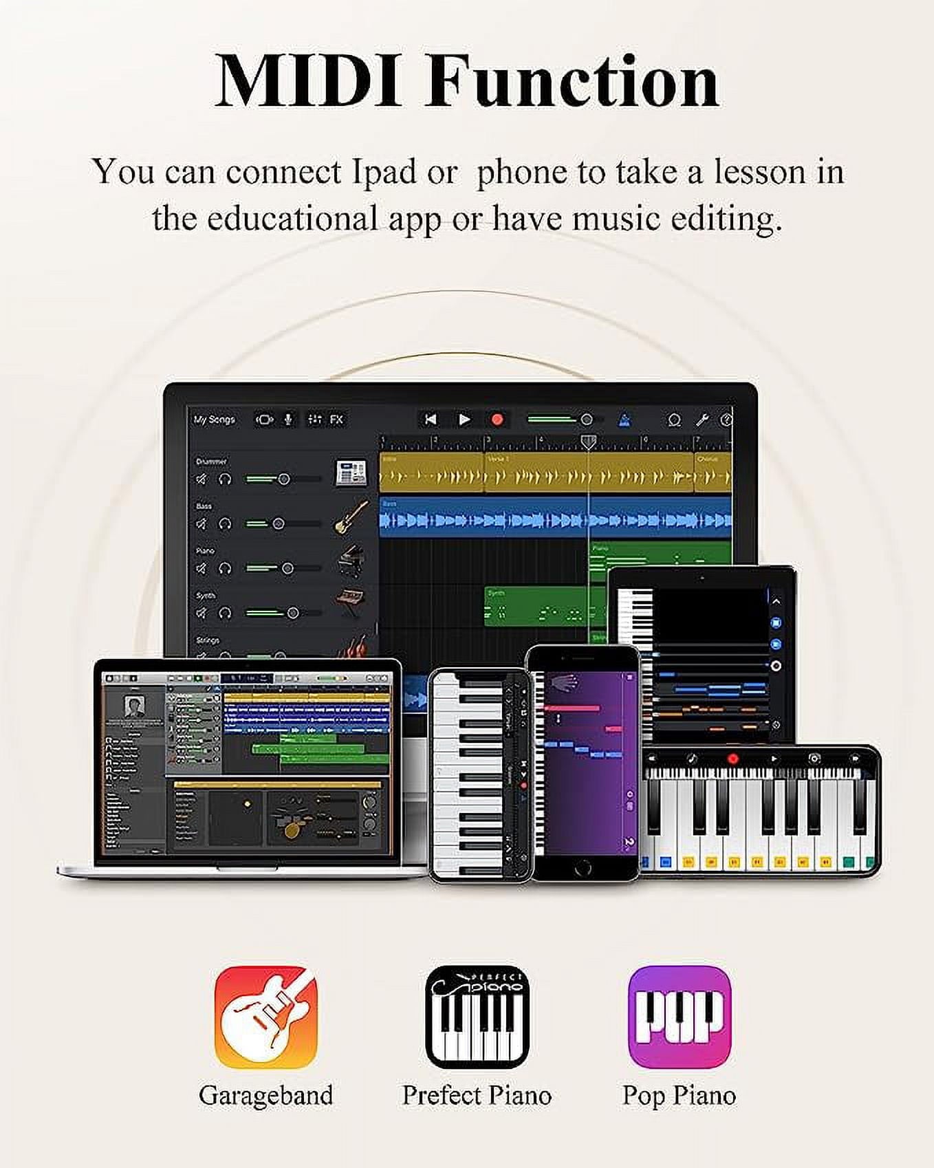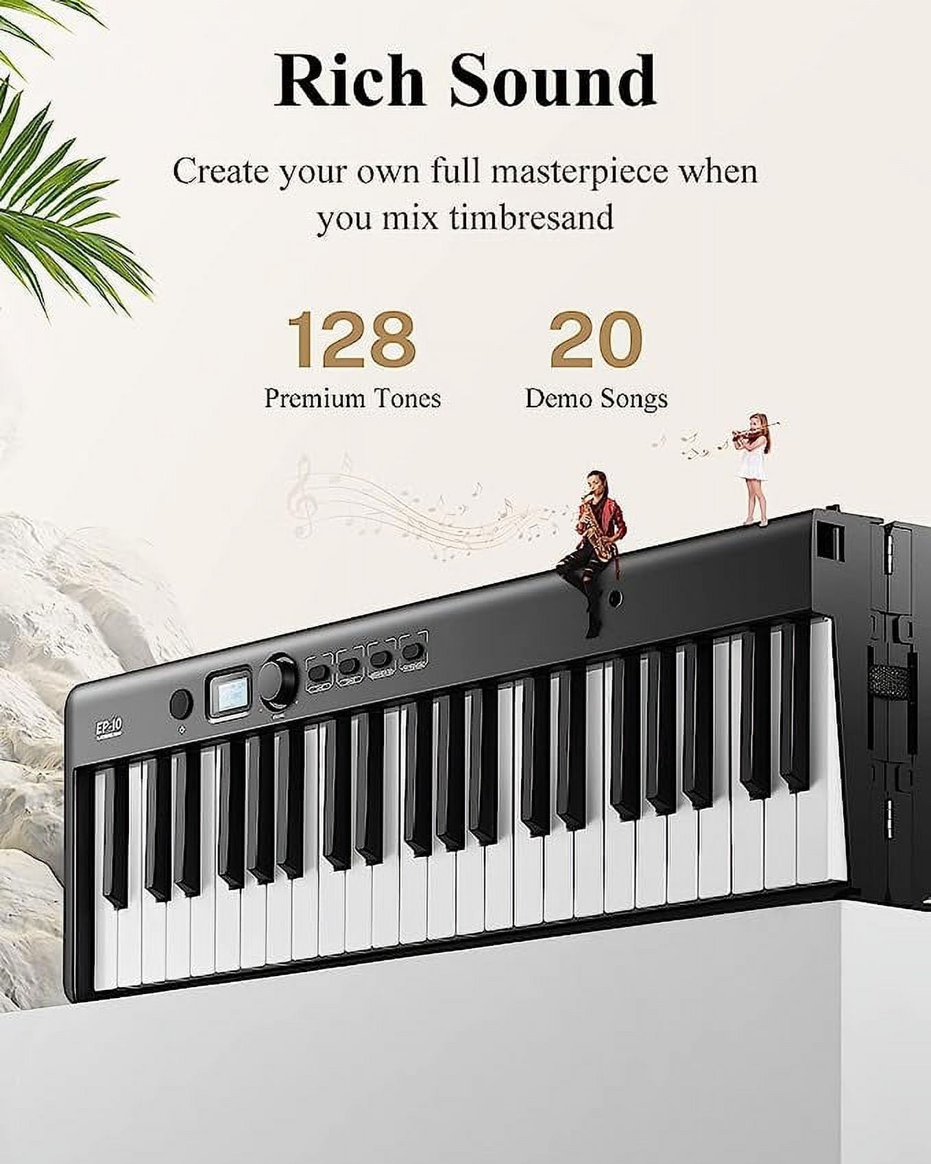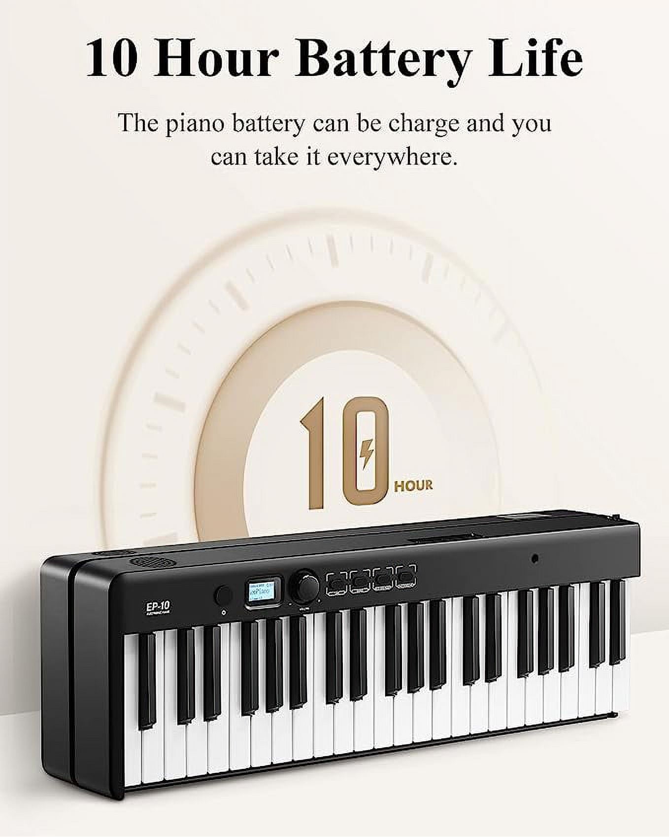 Eastar Would Never Disappoint You Our original intention is to bring you a unique musical experience and enjoy your music. May the music be with you all the time! 1 X Folding Piano 1 X Sheet Music Stand 1 X Sustain Pedal 1 X Piano Bag 1 X Instruction Eastar EP-10 Power Sensing Folding Electric Steel, Your Intimate Hobby Teacher The Eastar EP-10 folding electric steel, with its innovative foldable form, allows you to take your keyboard with you anywhere, anytime, to start your journey of musical enjoyment. With a length of 24.8 inches and a weight of only 4KG, the volume of the EP-10 changes with the intensity of playing, while the height of the keys is a standard 2cm, making it a more realistic piano feel experience. A Really Great Teacher Take Your Creation/ Play Anywhere, Anytime, without Taking Up Space Beautiful Sound and Realistic Feel Small and Portable Folding Electric Steel Open and close design, one button folding. The folded length is 24.8 inches and weighs only 4KG. The package comes with a piano bag, stylish and portable, so you can take him with you to enjoy your music anytime, anywhere. Lossless Sound Quality Stereo Surround Lossless restoration of real steel tone, full and delicate sound, rich in three-dimensional sense. Gives you a great playing experience. The sound source is sampled from a grand piano and can be used for piano exam practice. Experience Silent Practice EP-10 has a silent practice function, in the dead of night or need quiet indoor, dormitory and other locations, you can plug in headphones (3.5mm jack, need to buy their own) to practice, alone immersed in the beautiful music. Diverse External Interfaces for Greater Compatibility The back of the instrument is rich in interfaces and is compatible with a variety of external devices: Sustain pedal interface (3.5mm) MP3 interface (3.5mm) Microphone jack (3.5mm) Headphone jack (3.5mm) Charging interface (Type C) Clear and Powerful LCD Screen The EP-10 is equipped with an LCD display, which shows the status of functions in operation, and also allows you to view the tones, names of demonstration songs, etc. through the screen. Equipped with Sustain Pedal The set comes with a separate sustain pedal, which can be used together with the sustain pedal to allow the music to be played with a richer sound, color and style, matching different pieces.