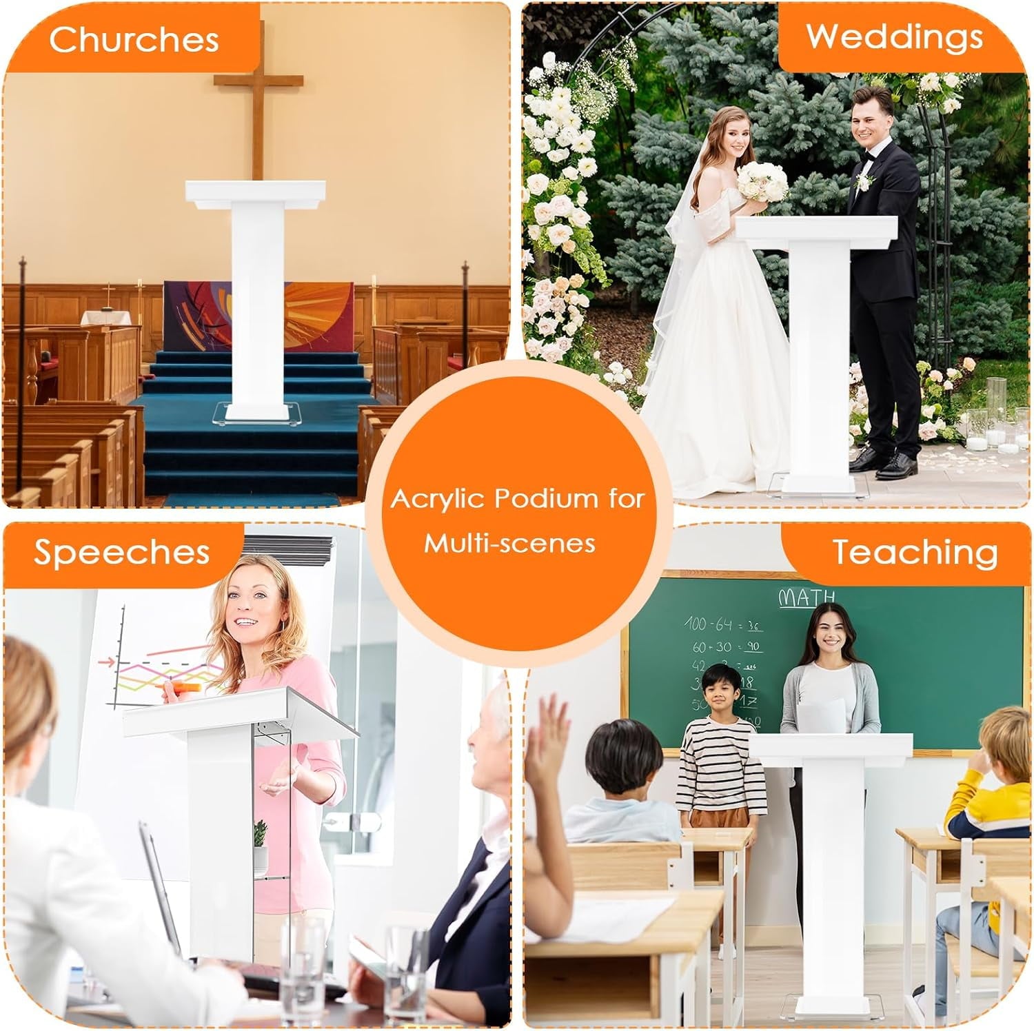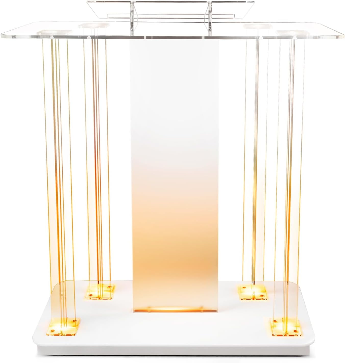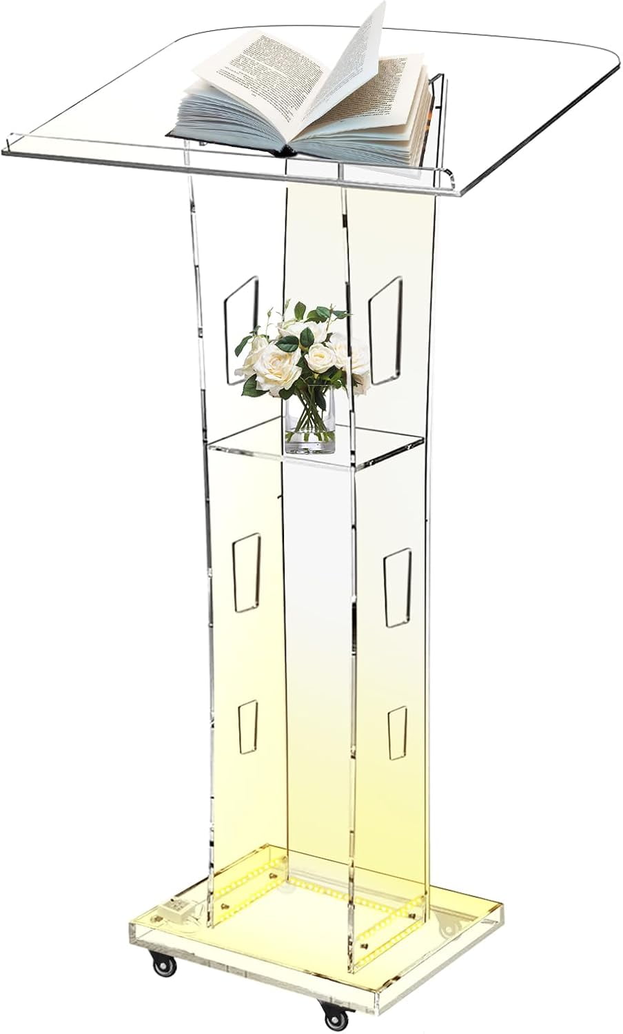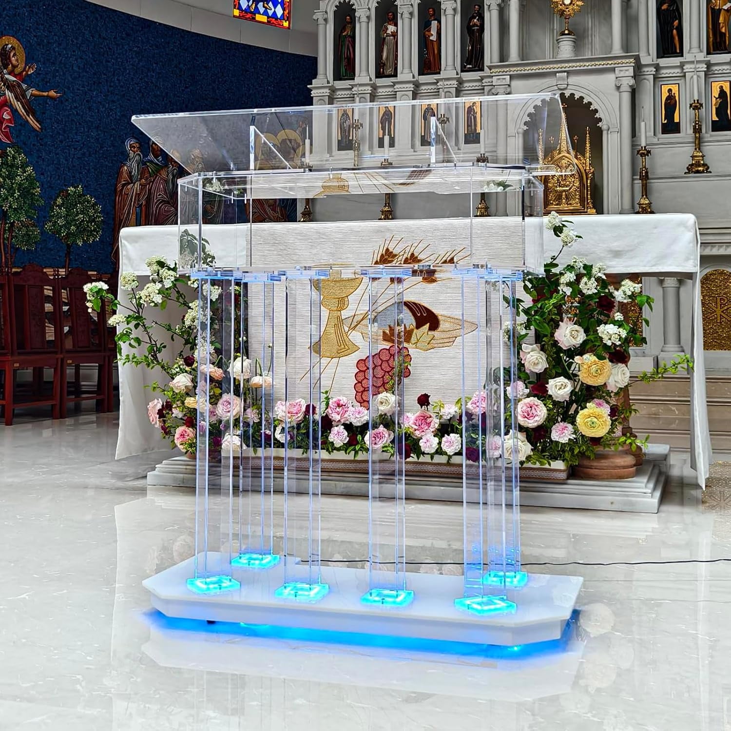 Esheno Acrylic Church Pulpit Collection offers 11 versatile models for various occasions: 46" mobile pulpit with wheels, 15 RGB LED colors (40x17.7x46.6", one with dust cover), two 43" clear acrylic podiums with wheels, 15 RGB lights and 4 flash modes (40x17.7x43", one with dust cover), 42.7" wheeled acrylic pulpit with 15 RGB LED lights (37.4x16.53x42.7"), two 42.5" ultra clear podiums with 15 color lights and storage shelf (23.6x16.1x45.2", one with 4 wheels), two 41.3" ultra clear acrylic stands with storage shelf (23.6x15.7x41.3", one with cross), and two 46.5" 3-tier pulpit with wheels, 15 color lights and 6-column base (39.4x17.7x46.5", one with dust cover). All models feature durable acrylic construction, suitable for church, wedding, concert, conference and classroom use, combining mobility, functionality and decorative lighting effects.Esheno Church Pulpit with Storage Shelf 41.3 inch Ultra Clear Acrylic Podium Stand Modern Lectern for Conference Speech No Cross Included.