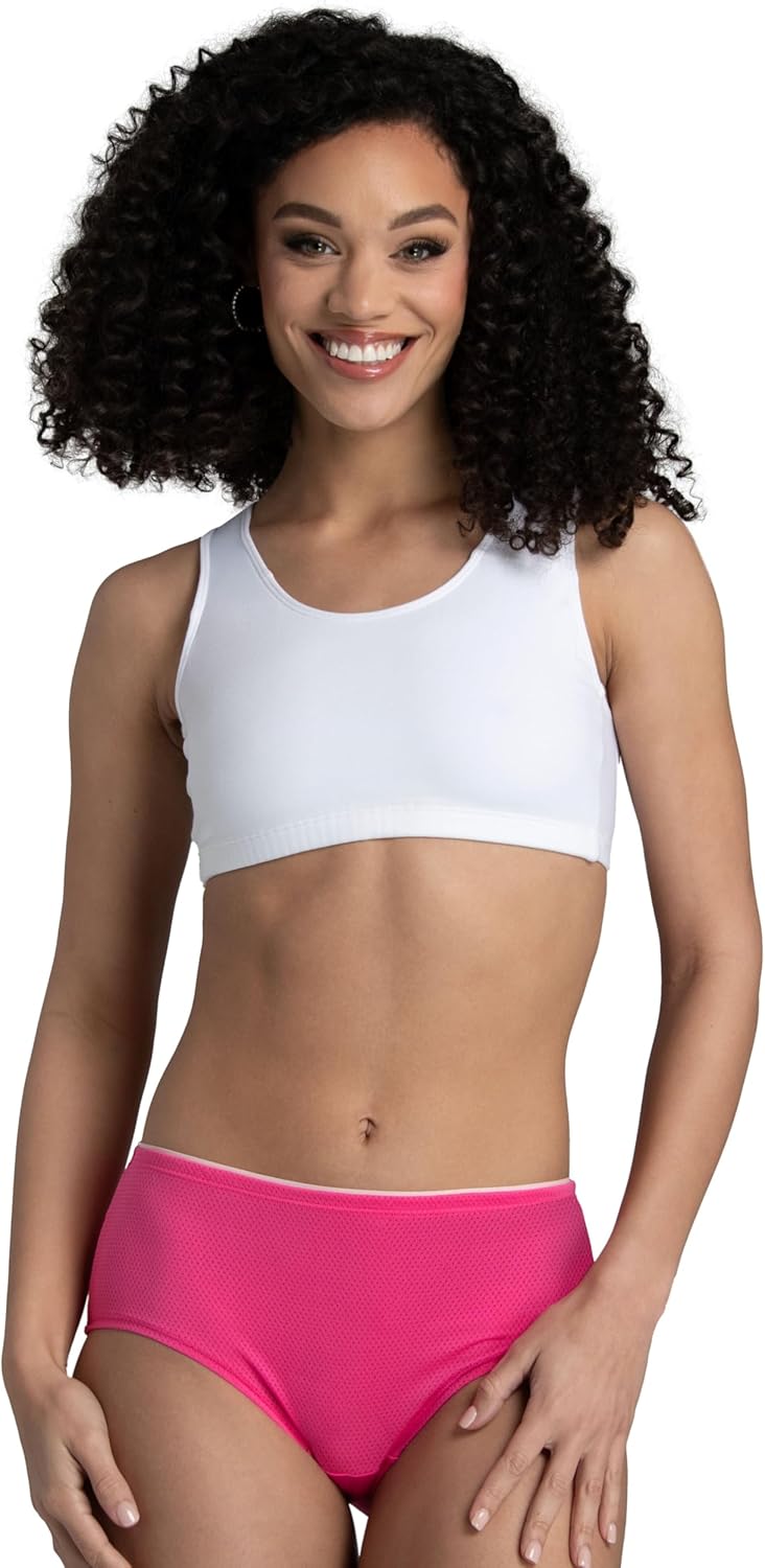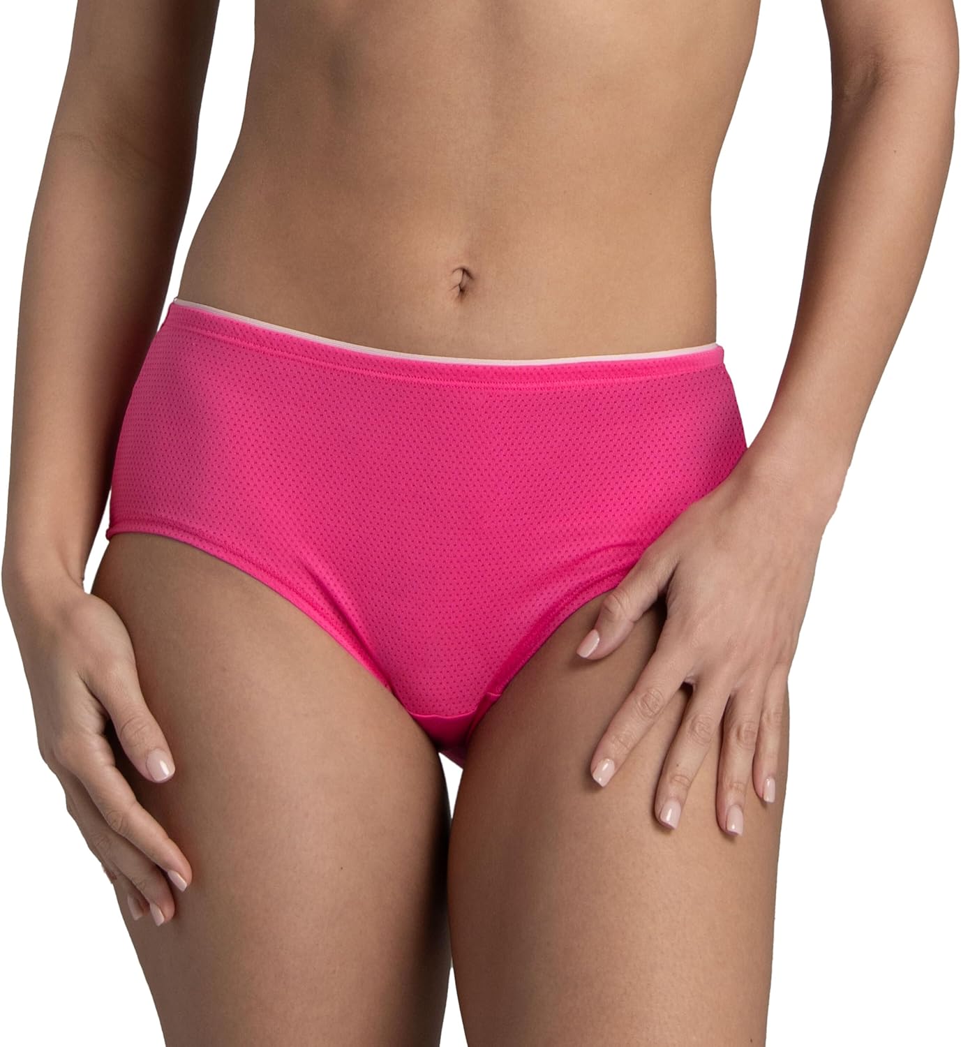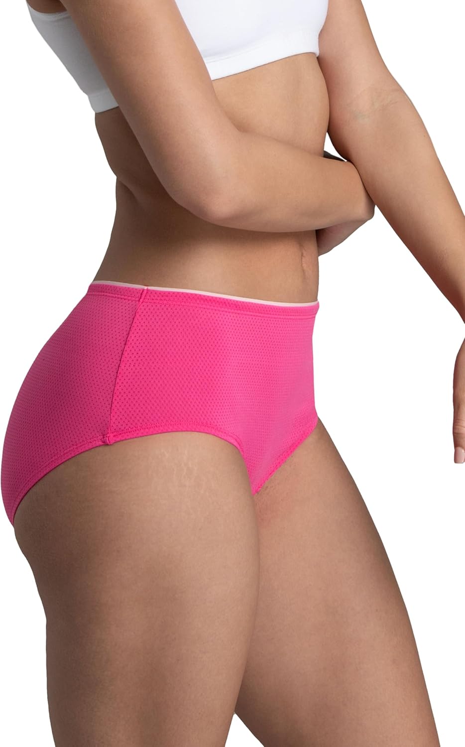 Fruit of the Loom Breathable Cotton-Mesh hipsters are just what you need to help you stay cool and fresh all day long. These panties are made with breathable, cotton-mesh fabric that not only supports the flow of air but wicks away moisture to keep you dry. Not only will these panties keep you feeling your best all day long, they’re designed with comfort in mind. Soft leg bands and a comfort-covered waistband provide added comfort, and as always, our Fruit of the Loom panties are tag free and made with a 100% cotton liner for extra softness. The contemporary hipster silhouette sits slightly above the hips.
