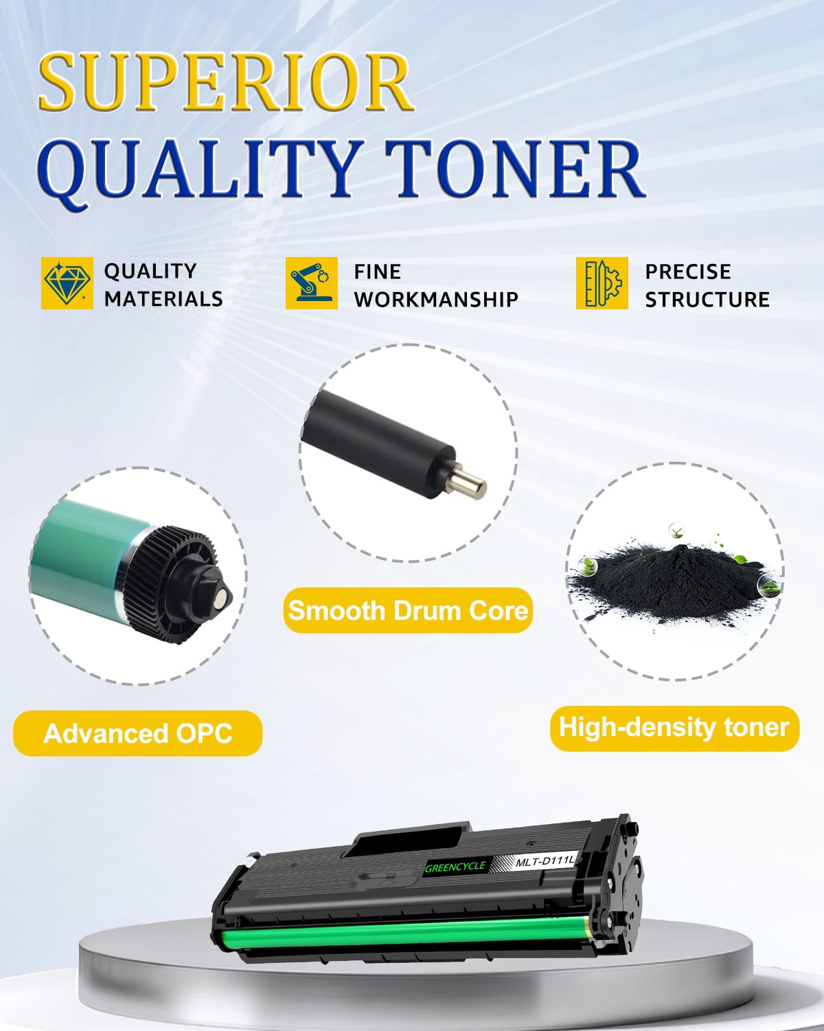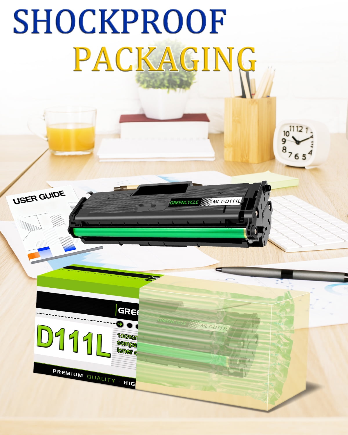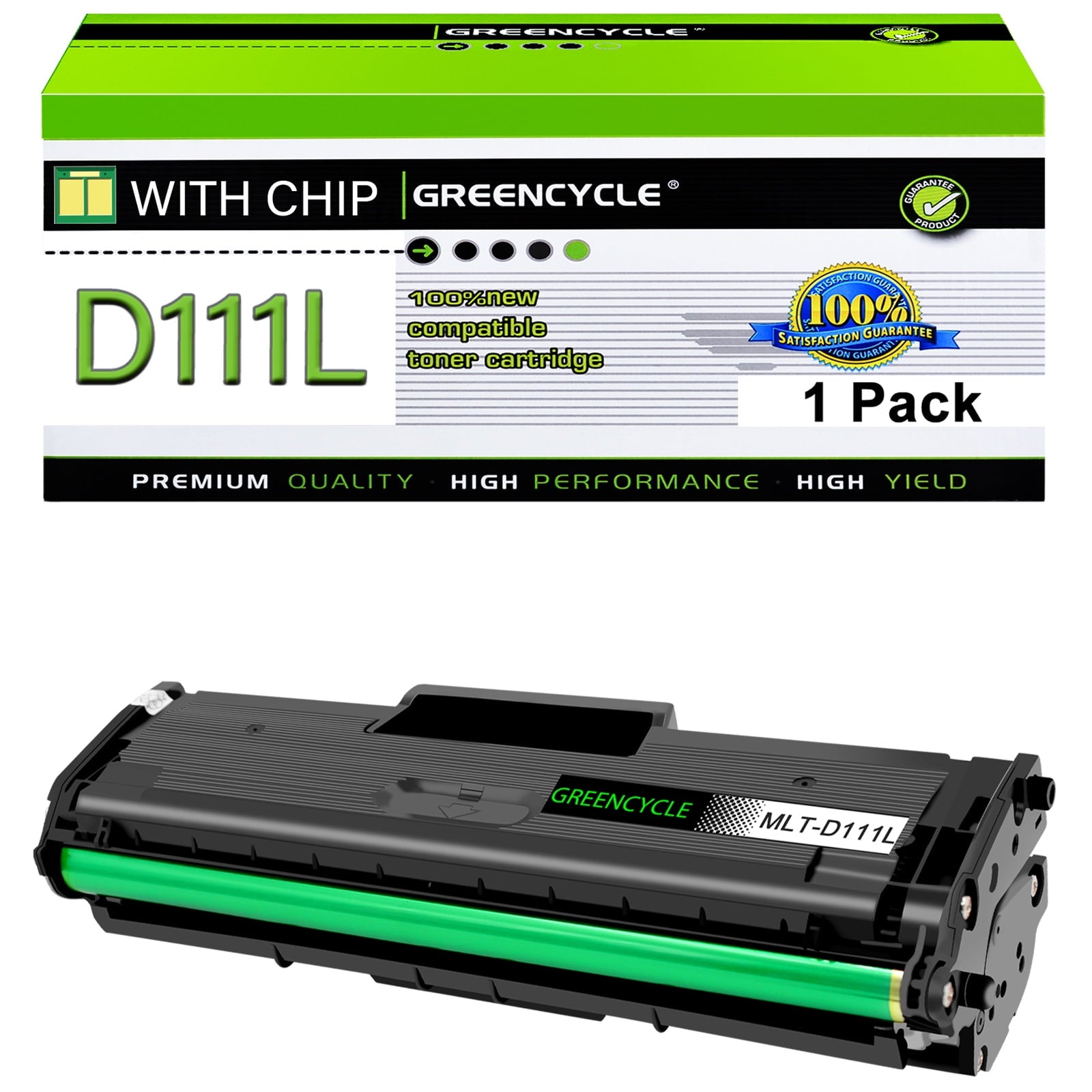 GREENCYCLE MLT-D111L Black Compatible Toner Cartridges Relpacement for MLTD111L toner cartridge. Product Information: GREENCYCLE compatible for MLT-D111L toner is a replacement for the OEM model with the same compatibility and superior quality. We are committed to helping more writers, graphic designers and publishers create excellent work. We pay attention to more details to ensure you experience superior print quality. Page yield: 1,800 pages per black toner cartridge based on 5% page coverage of A4 Letter. Compatible for Samsung printer: Xpress SL-M2020 / Xpress SL-M2020W / Xpress SL-M2022 / Xpress SL-M2022W / Xpress SL-M2024W / Xpress SL-M2070 / Xpress SL-M2070F / Xpress SL-M2070W / Xpress SL-M2070FW Printers. How to install a toner cartridge: Step 1: Unpack the new cartridges & shake the toner 6-8 times gently to loose the toner evenly. Step 2: Pull out the black/orange plastic protective cover from toner cartridge. Step 3: Pull out the sealing tape. Step 4: Insert the toner cartridge into the corresponding slots until it snaps into place. Close your printer cover, and ready to print.