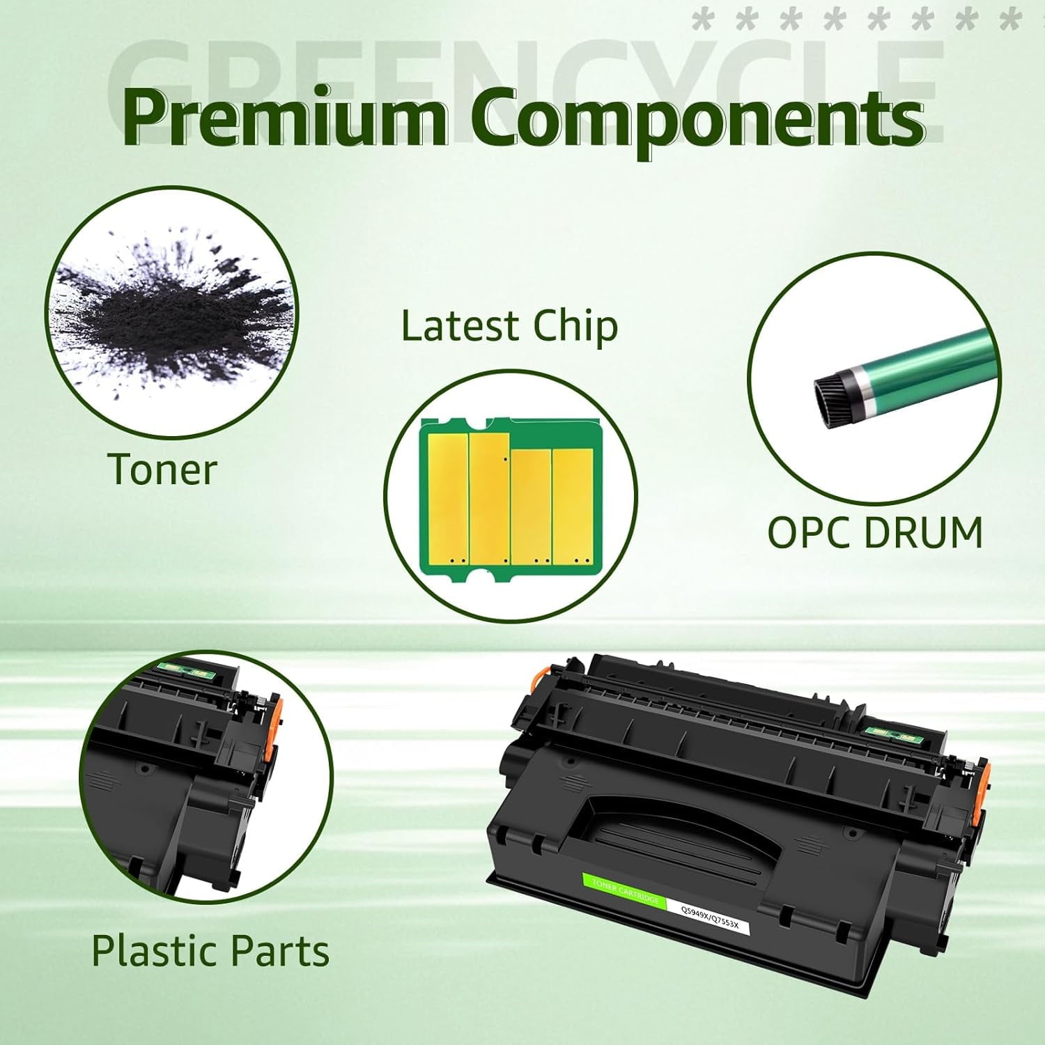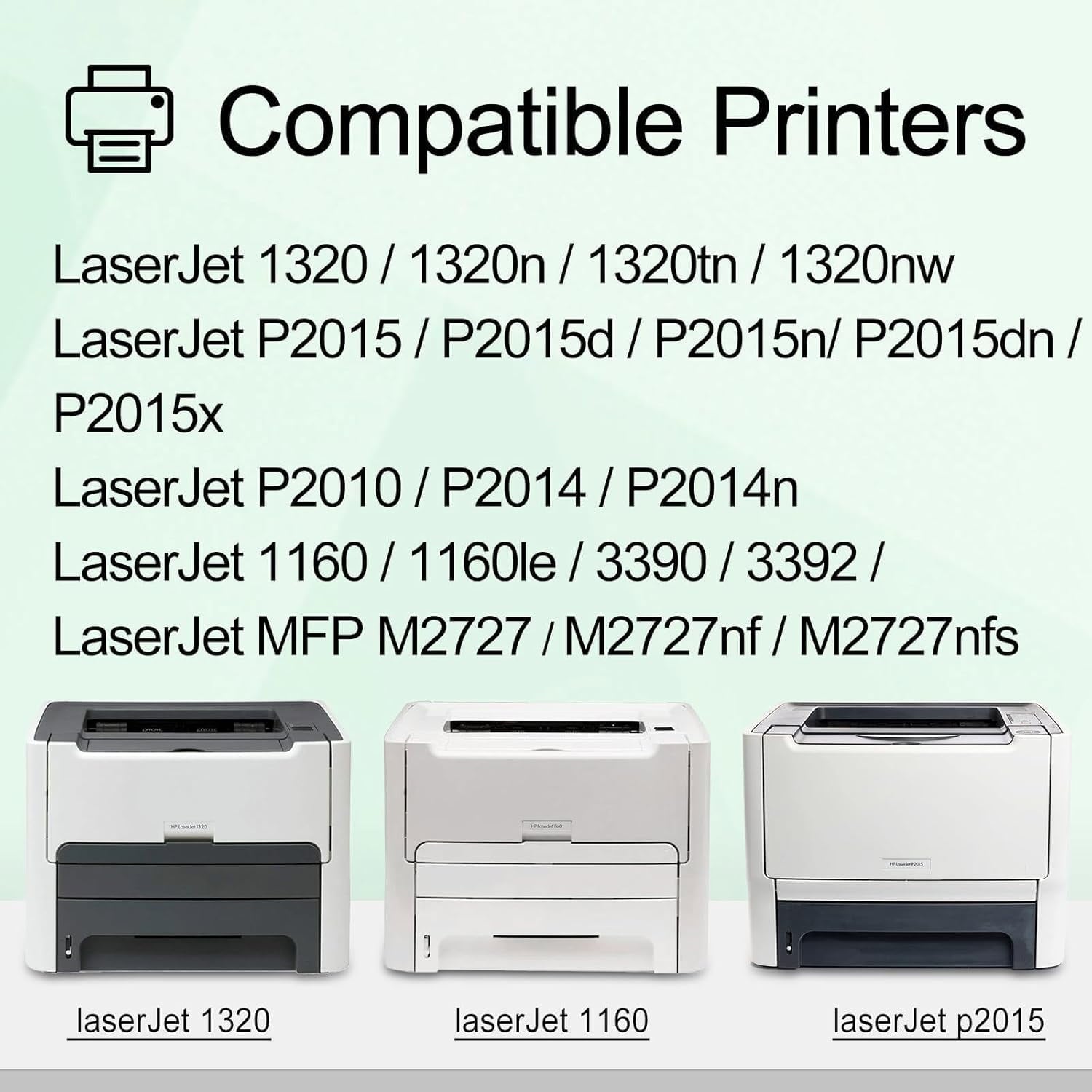 Product Name: GREENCYCLE Replacement Compatible for HP 53X Q7553X 49X Q5949X Black toner Cartridge. Color: Black Please confirm your printer and toner model before order. Compatible for HP 53X Q7553X 49X Q5949X Printer List: Compatible for Laser Jet P2010 / P2014 Printers Compatible for Laser Jet M2727nf / M2727 Printers Compatible for Laser Jet 3390 / 3392 / 1160le Printers Compatible for Laser Jet P2015dn / P2015 / P2015d / P2015n Printers Compatible for Laser Jet 1320 / 1320n / 1320tn Printers Page Yield: 7,000 pages per Black toner cartridge (at 5% coverage Letter A4). Actual toner yield varies with usage, graphics printed and environmental conditions Installation Instruction Step-1 Remove the new toner cartridge from the packaging. Step-2 Gently shake the toner cartridge from side to side to distribute the toner evenly. Step-3 Pull out the sealing tape. Step-4 Install the toner cartridge into the printer and start printing.