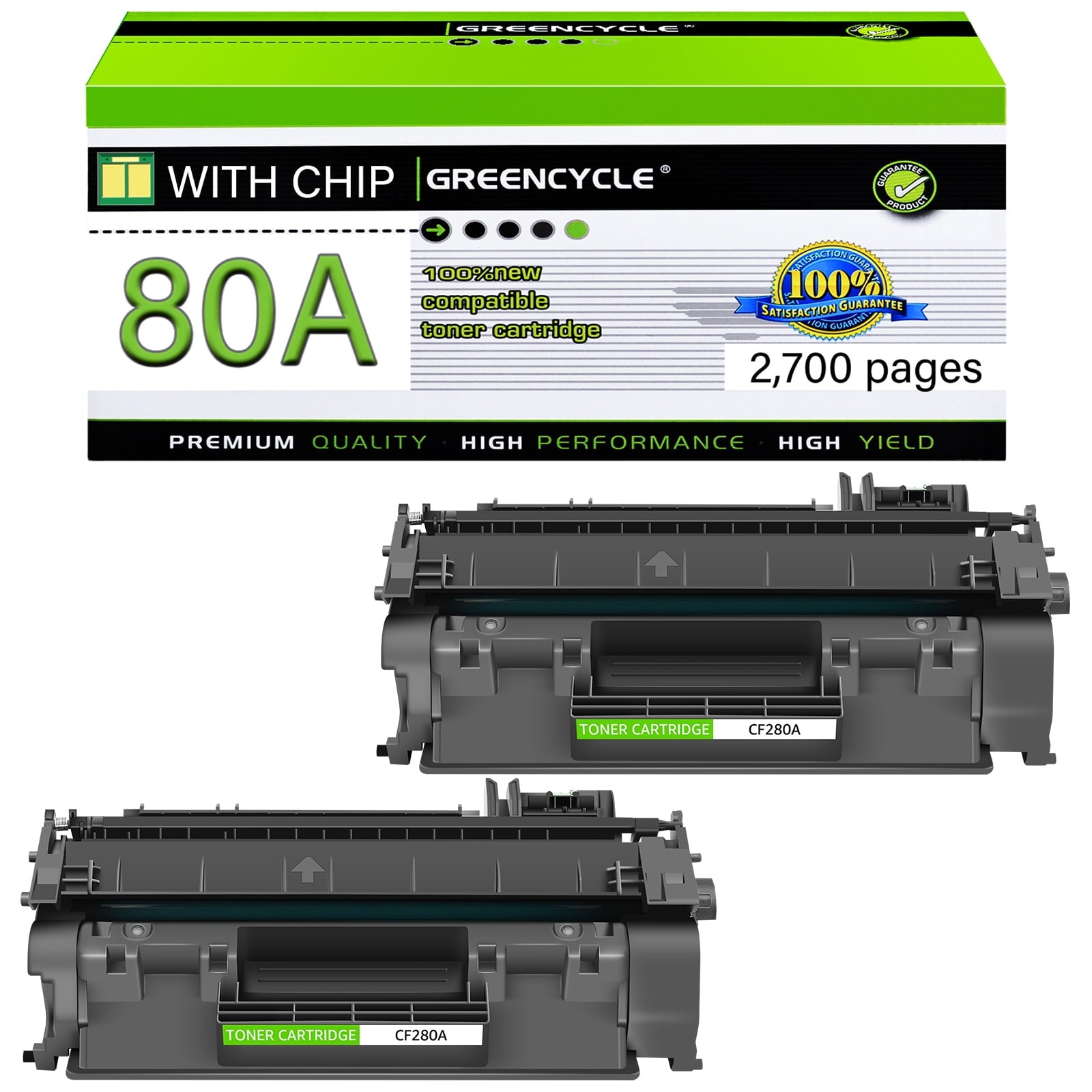 Model: Compatible for HP 80A CF280A Toner Color: Black Page Yield: Up to 2,700 pages per CF280A black toner cartridge (based on 5% coverage of Letter size Paper). Actual toner yield varies with usage, graphics printed and environmental conditions. Compatible for HP Printer: LaserJet Pro 400 M401 Printer LaserJet Pro 400 M401A Printer LaserJet Pro 400 M401D Printer LaserJet Pro 400 M401N Printer LaserJet Pro 400 M401DN Printer LaserJet Pro 400 M401DNE Printer LaserJet Pro 400 M401DW Printer LaserJet Pro 400 MFP M425DN Printer LaserJet Pro 400 MFP M425DW Printer What's in the box: 2 x CF280A Black Toner Cartridge + 2 x User Guide All GREENCYCLE toner cartridges are strictly tested with industry quality control processes to perform superb results.