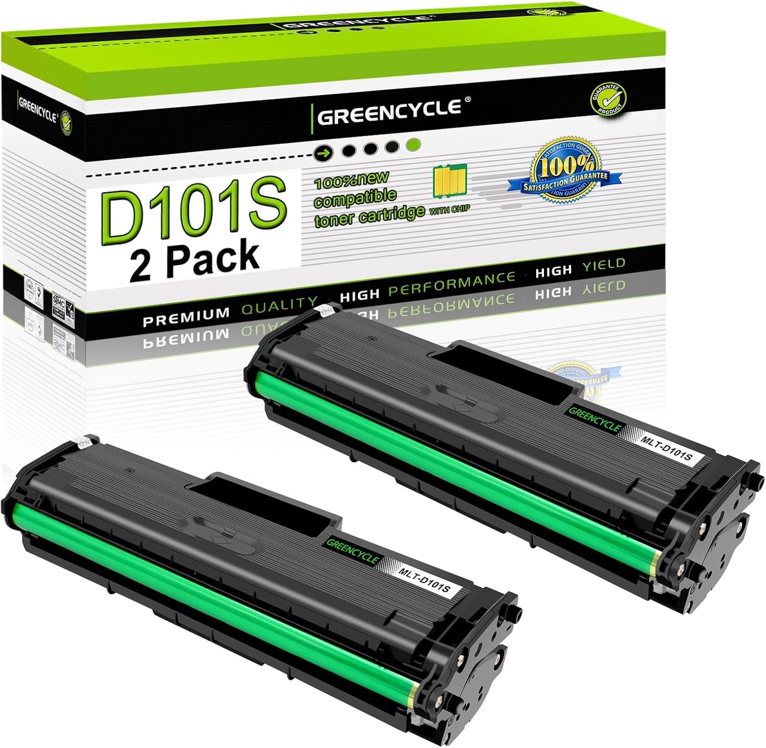 Model: Compatible for Samsung MLT-D101S MLTD101S D101S toner Color: Black Page yield: Up to 1,500 pages per D101S black high yield toner cartridge (based on 5% coverage of Letter size Paper). Actual toner yield varies with usage, graphics printed and environmental conditions. Compatible for Samsung printer: ML-2160, ML-2161, ML-2162, ML-2163, ML-2165, ML-2165W, ML-2166W, ML-2168 SCX-3400, SCX-3401, SCX-3401FH, SCX-3405, SCX-3405FW, SCX-3405W, SCX-3406W, SCX-3406HW, SCX-3407 SF-760P, SF-761, SF-761P What's in the box: 2 x MLT-D101S black toner cartridge + 2 x user guide All GREENCYCLE toner cartridges are strictly tested with industry quality control processes to perform superb results.