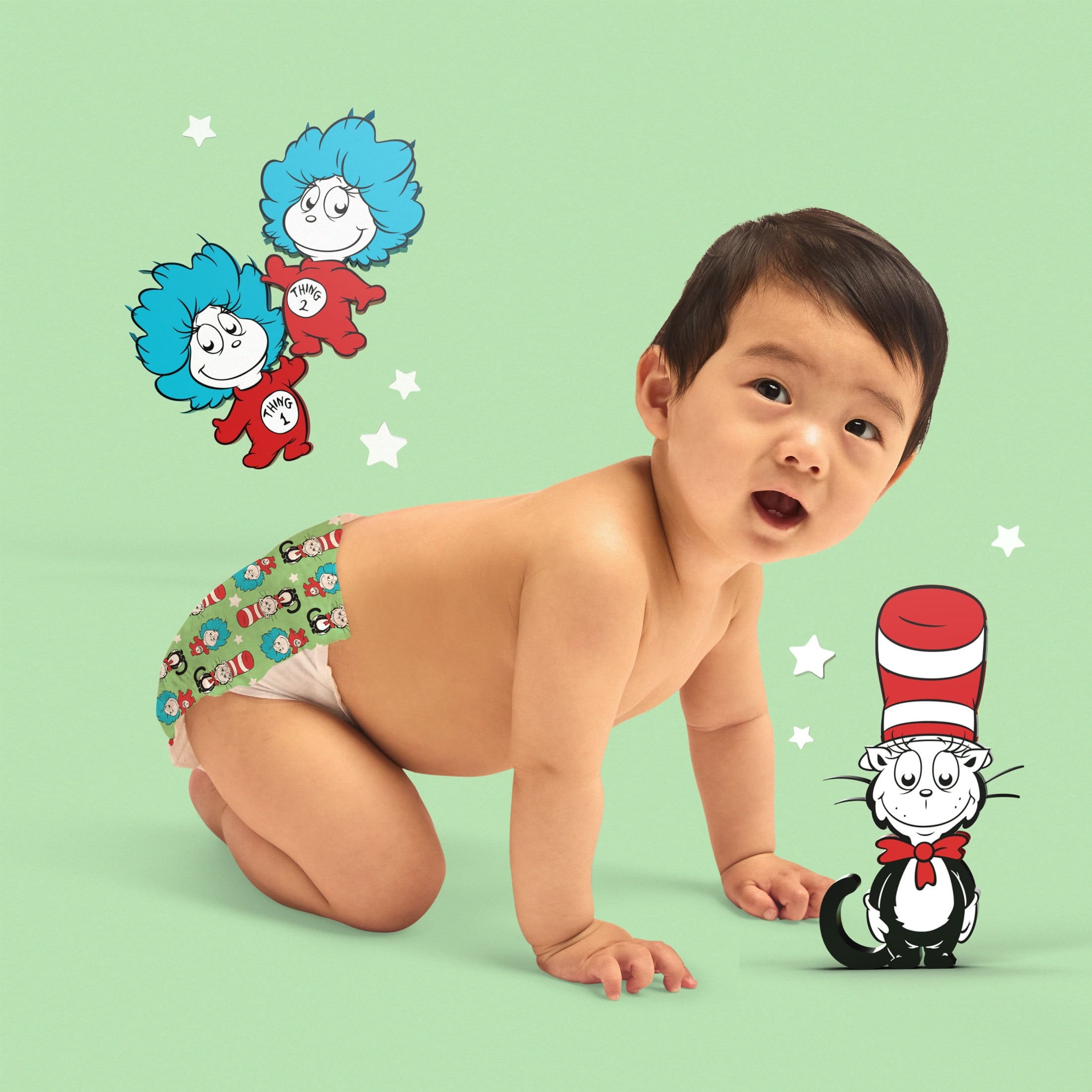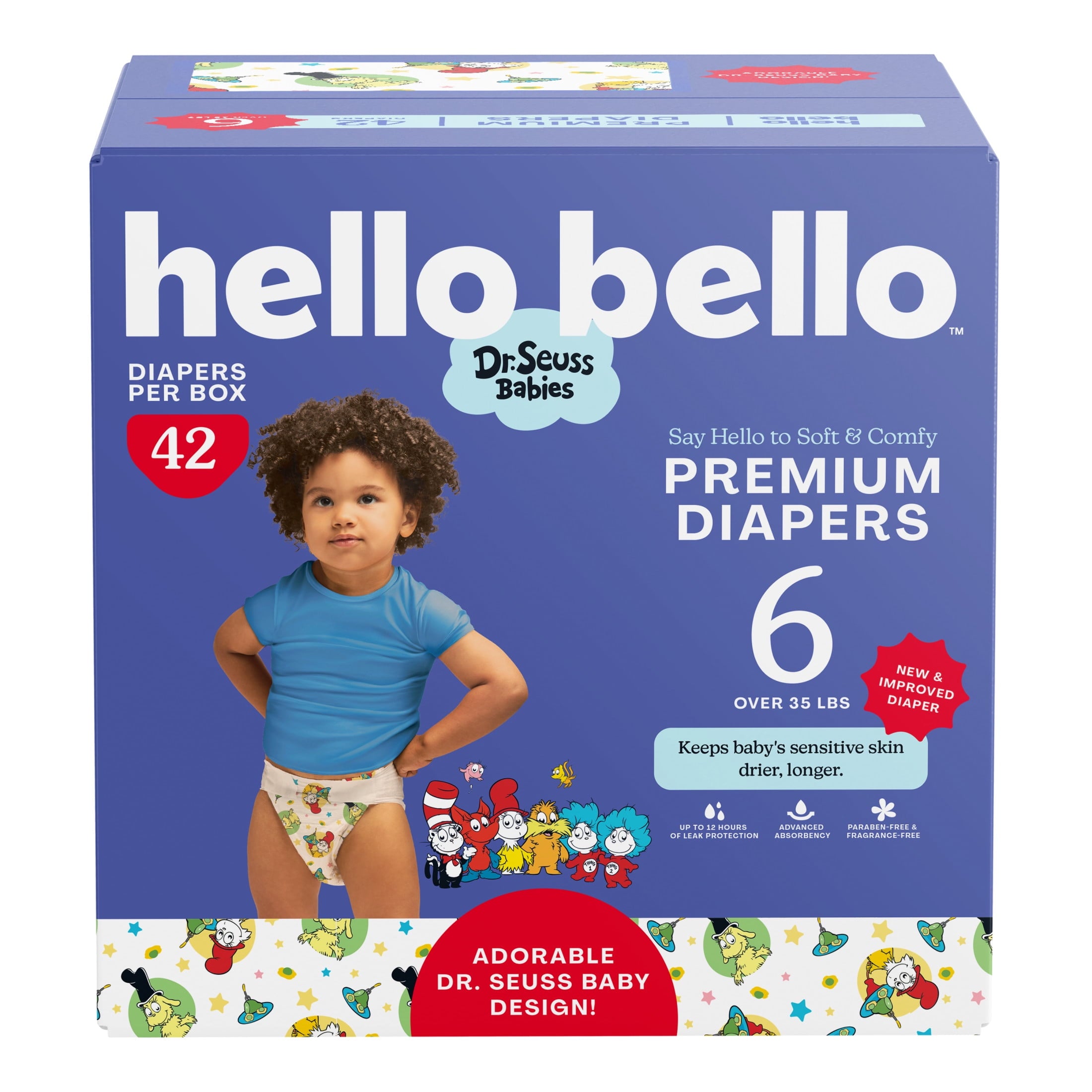 Get ready for sweet smiles and supremely snuggly moments with Hello Bello Dr. Seuss Babies Premium Diapers! We've crafted an even better diaper for your little one, expertly designed to keep their sensitive skin drier, longer. Our diapers are genuinely gentle and softer than ever, and are made with ingredients we can be proud of. You can trust the absorbent core to swiftly wick moisture away from baby’s skin (even through multiple wettings) keeping baby nice and dry and providing serious leak protection. And, of course, there are those irresistibly cute Dr. Seuss Baby designs! Includes (1) 66ct club box of disposable lotion-free baby diapers in unisex Baby Seuss Lil Cat & Things designs for Infants (Size 3).