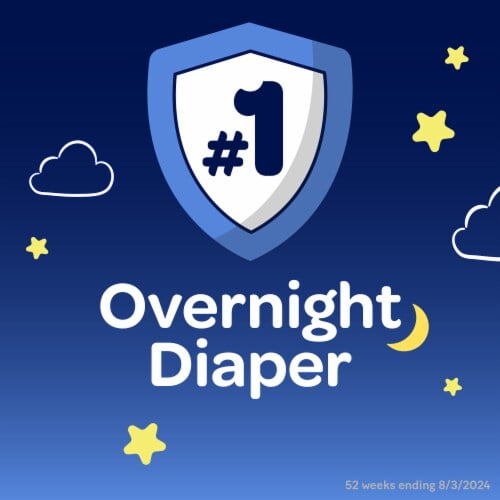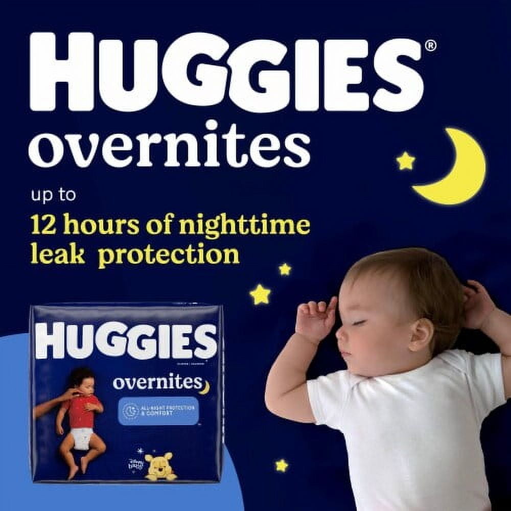 Product Details Huggies Overnites Baby Diapers are the leading best-selling overnight diaper* that feature a DryTouch Liner with extra absorbency that locks away moisture for up to 12 hours of overnight protection. Each disposable baby diaper has a contoured shape, a SnugFit Waistband and Double Grip Strips for a secure fit and leak protection. They also feature a breathable outer cover and a wetness indicator. (*52 weeks ending 8/3/2024) Huggies Overnites Diapers: 58 baby diapers, size 4 (22-37 lbs) Our Perfect Nighttime Diaper: Overnight diapers feature a DryTouch Liner that quickly absorbs moisture and provide up to 12 hours of nighttime leak protection for all-night comfort, dryness and protection Nighttime Diapers Designed for Comfort: Curved shape plus Double Grip Strips, a breathable outer cover and a pocketed waistband help prevent blowouts Softness Around the Legs: Designed with pillowy soft leg cuffs and helps provide red-mark free protection around your baby’s legs Night diapers are fragrance free, lotion free, paraben free, and free of elemental chlorine and natural rubber latex Wetness Indicator: A yellow line changes to blue when wet, easily letting you know when it's time for a diaper change Features Disney Winnie the Pooh and Friends designs; product and packaging may vary