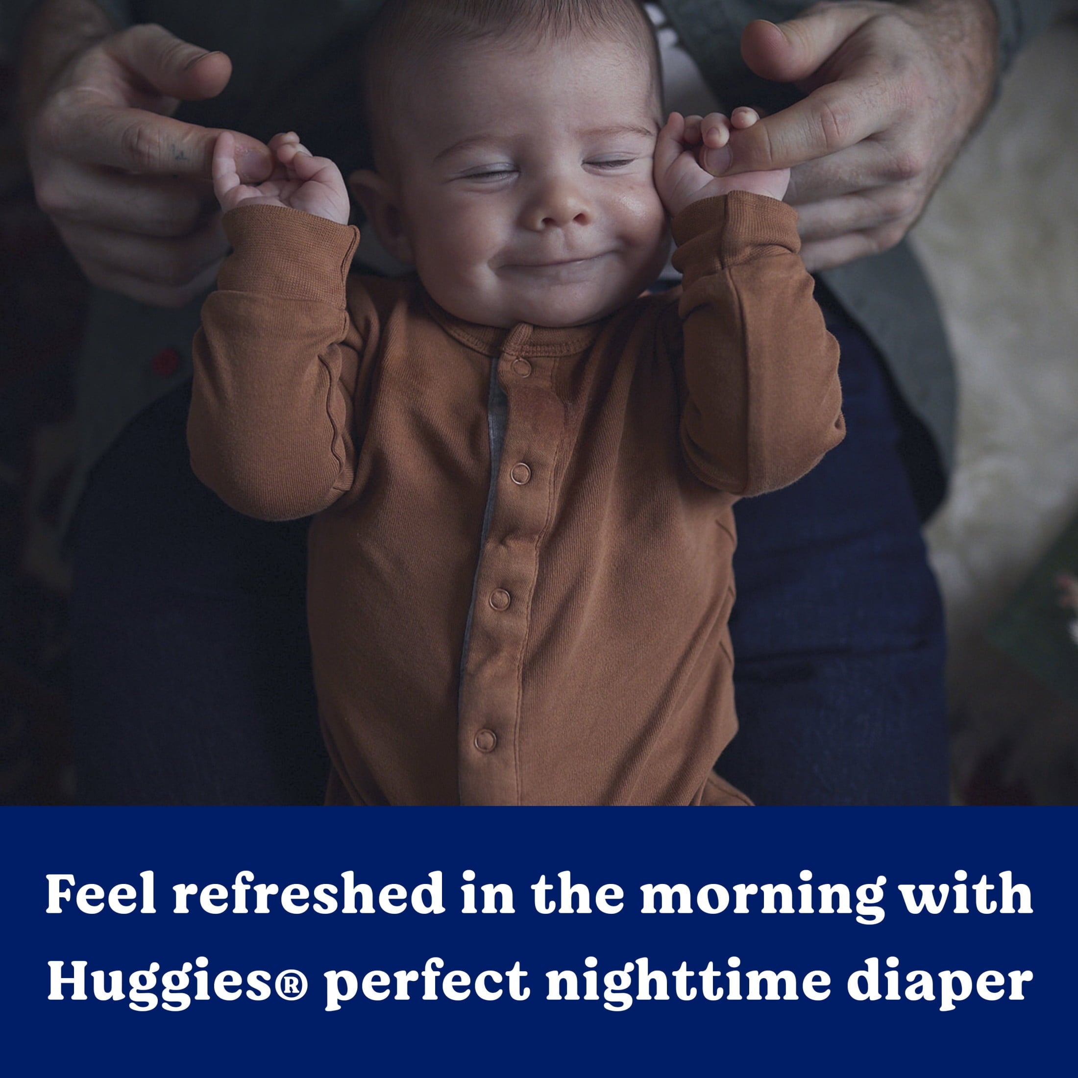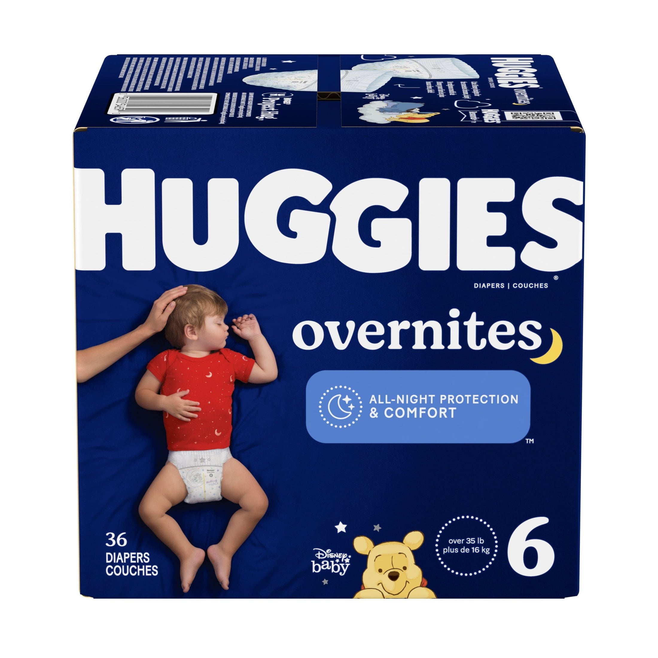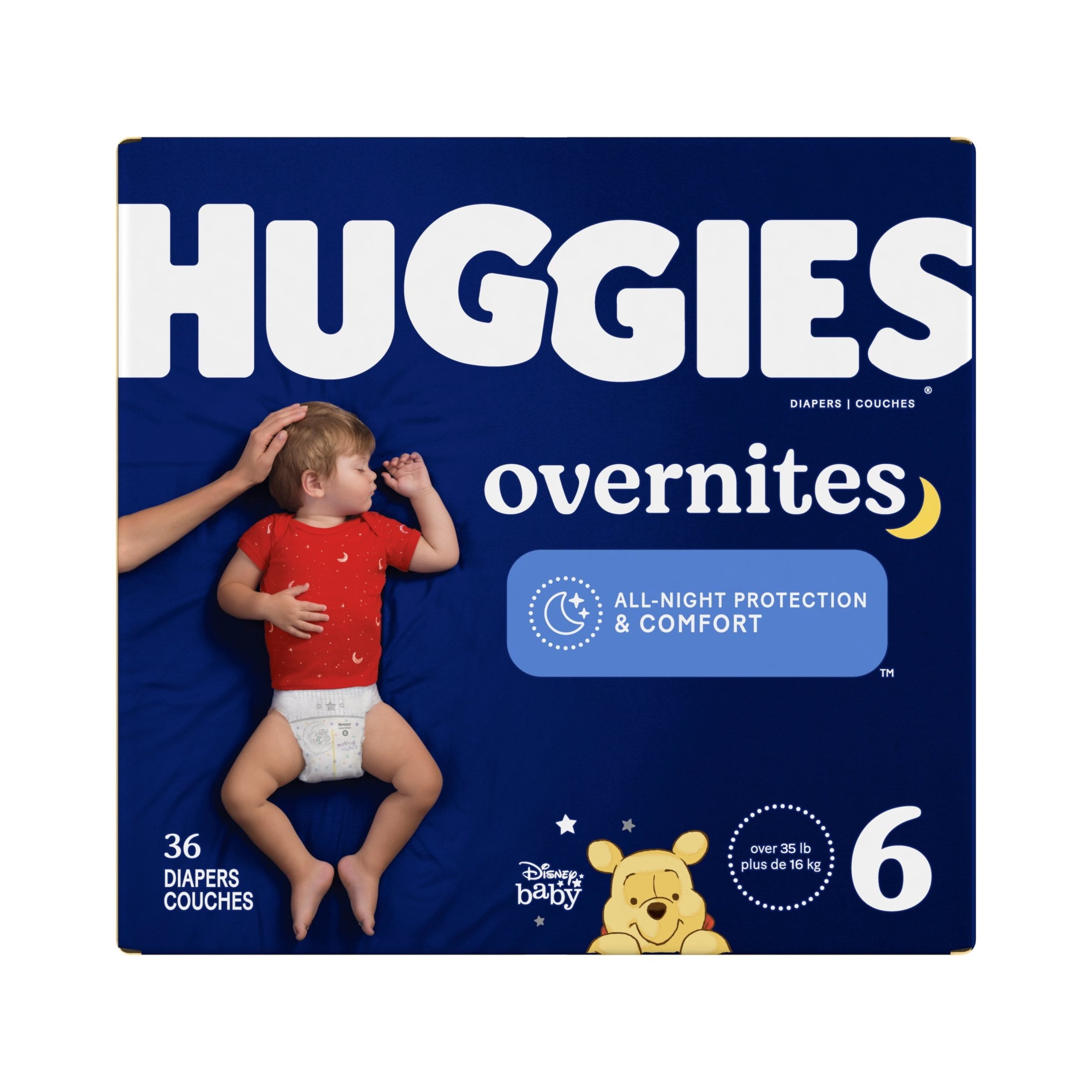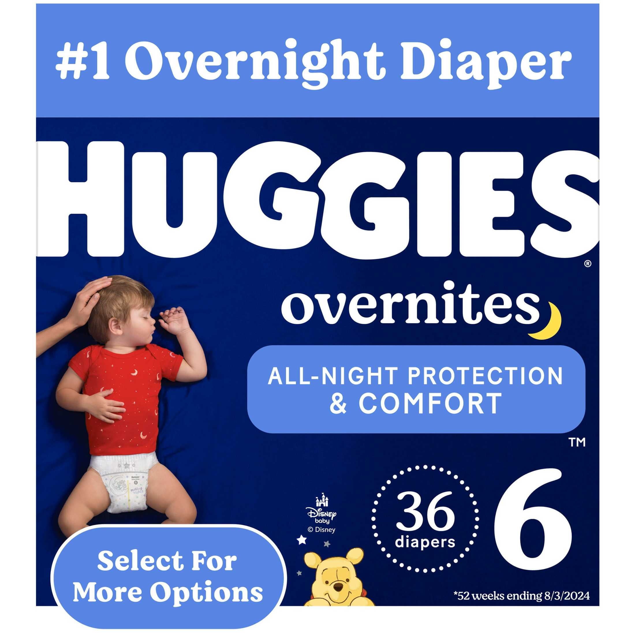Say goodnight to midnight changes with Huggies Overnites Baby Diapers! The leading overnight diaper,* Overnites night diapers feature a DryTouch Liner with extra absorbency that locks away moisture for up to 12 hours of overnight protection to help keep your baby's skin dry as they sleep. With a contoured shape for trusted leak protection and a pocketed waistband to help prevent blowouts, Huggies Overnites provides all-night protection and comfort so your baby can have drier nights and better mornings**. These disposable overnight diapers also feature Huggies' SnugFit Waistband with Double Grip Strips for a secure fit, perfect for babies starting to roll and toss during sleep. They also are designed to help provide red-mark free protection around your baby’s legs and have pillowy soft leg cuffs. Plus, a breathable outer cover helps keep your baby's skin dry and comfortable, while Huggies' wetness indicator lets you know if your little one needs a diaper change. Huggies Overnites night time diapers feature adorable Disney Winnie the Pooh designs and are available in size 3 (16-28 lbs), size 4 (22-37 lbs), size 5 (27+ lbs), size 6 (35+ lbs) and size 7 (41+ lbs). For daytime protection, try Huggies Little Movers! (*52 weeks ending 8/3/2024) (**compared to Huggies daytime diapers)