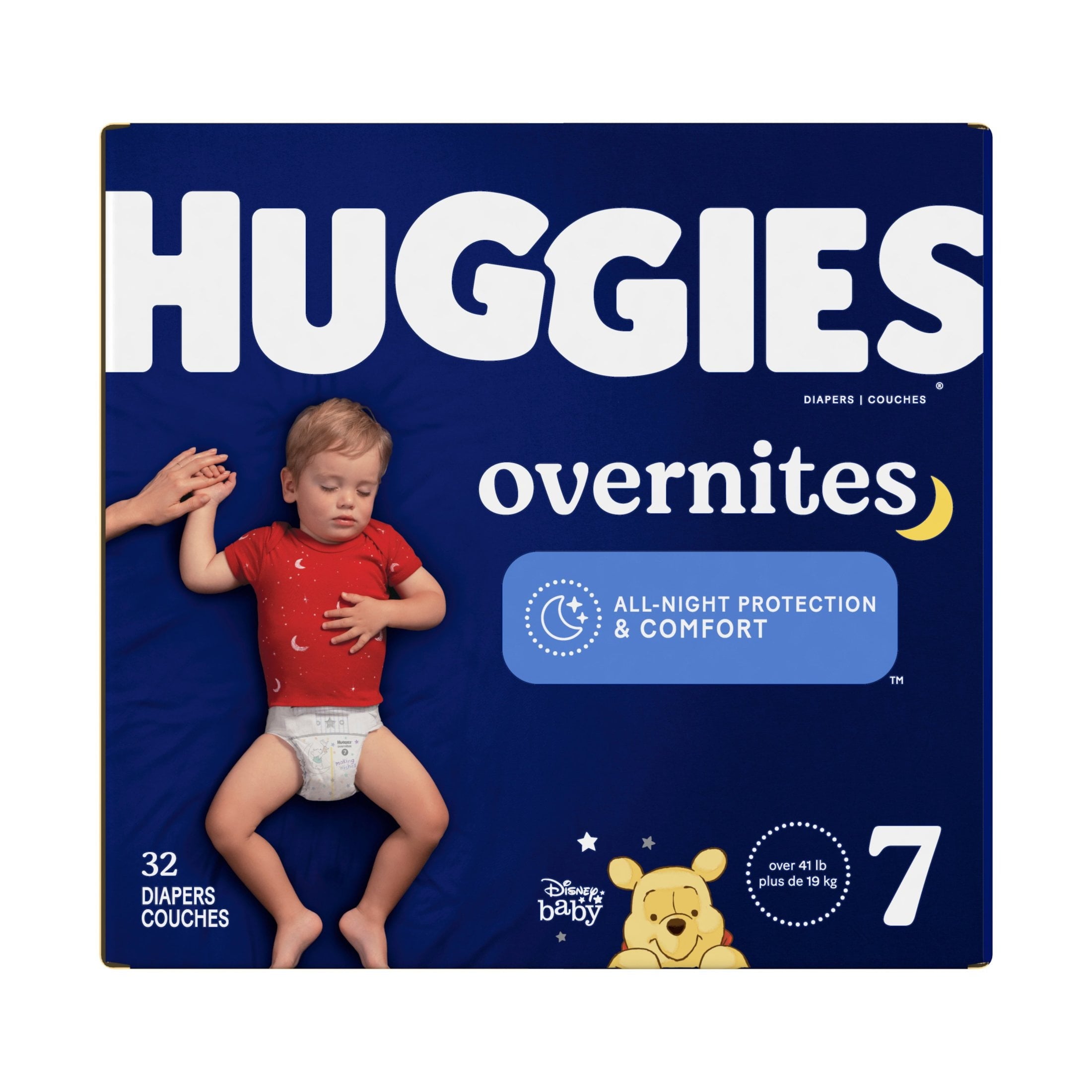 Say goodnight to midnight changes with Huggies Overnites Baby Diapers! The leading overnight diaper,* Overnites night diapers feature a DryTouch Liner with extra absorbency that locks away moisture for up to 12 hours of overnight protection to help keep your baby's skin dry as they sleep. With a contoured shape for trusted leak protection and a pocketed waistband to help prevent blowouts, Huggies Overnites provides all-night protection and comfort so your baby can have drier nights and better mornings**. These disposable overnight diapers also feature Huggies' SnugFit Waistband with Double Grip Strips for a secure fit, perfect for babies starting to roll and toss during sleep. They also are designed to help provide red-mark free protection around your baby’s legs and have pillowy soft leg cuffs. Plus, a breathable outer cover helps keep your baby's skin dry and comfortable, while Huggies' wetness indicator lets you know if your little one needs a diaper change. Huggies Overnites night time diapers feature adorable Disney Winnie the Pooh designs and are available in size 3 (16-28 lbs), size 4 (22-37 lbs), size 5 (27+ lbs), size 6 (35+ lbs) and size 7 (41+ lbs). For daytime protection, try Huggies Little Movers! (*52 weeks ending 8/3/2024) (**compared to Huggies daytime diapers)
